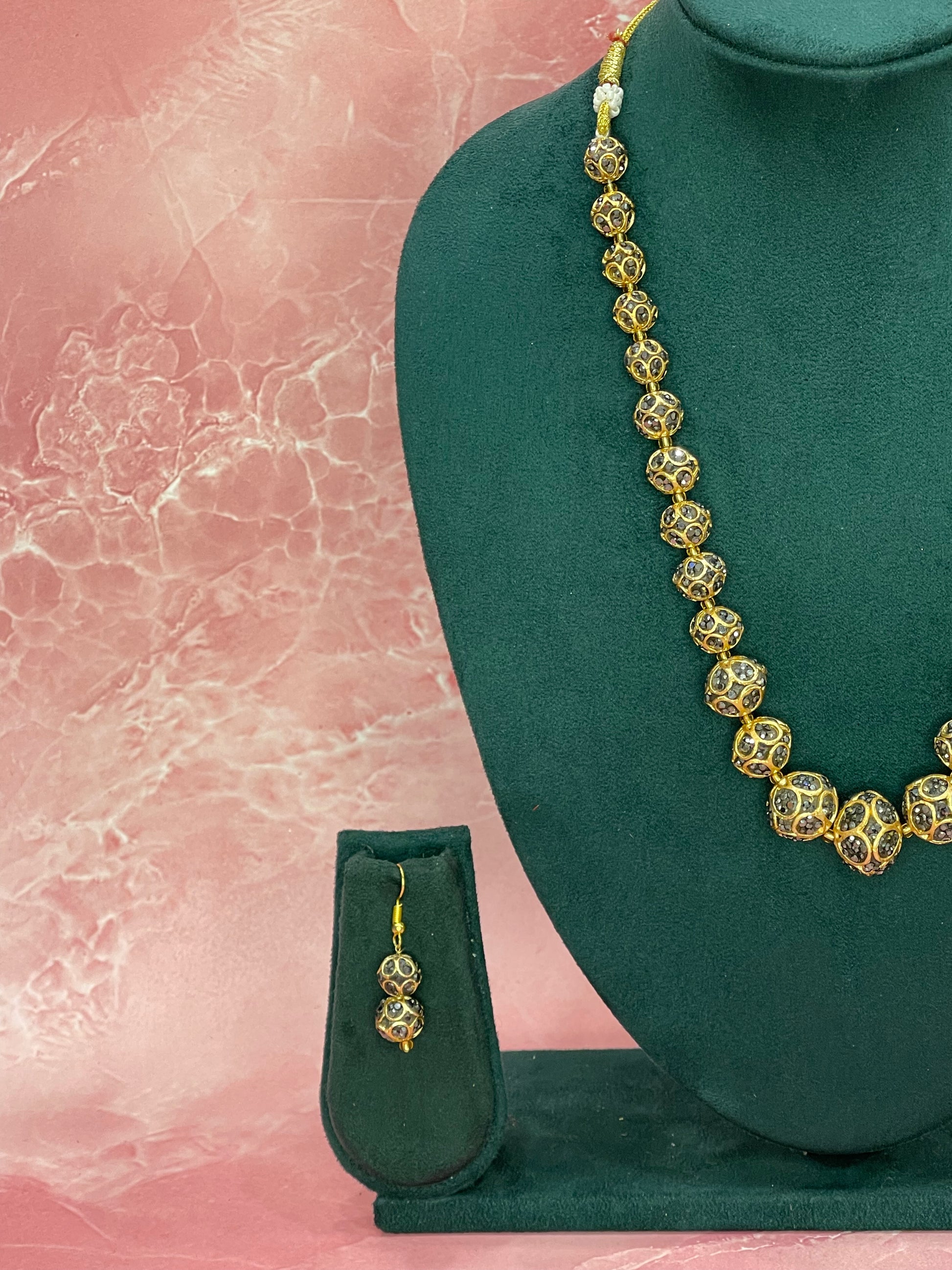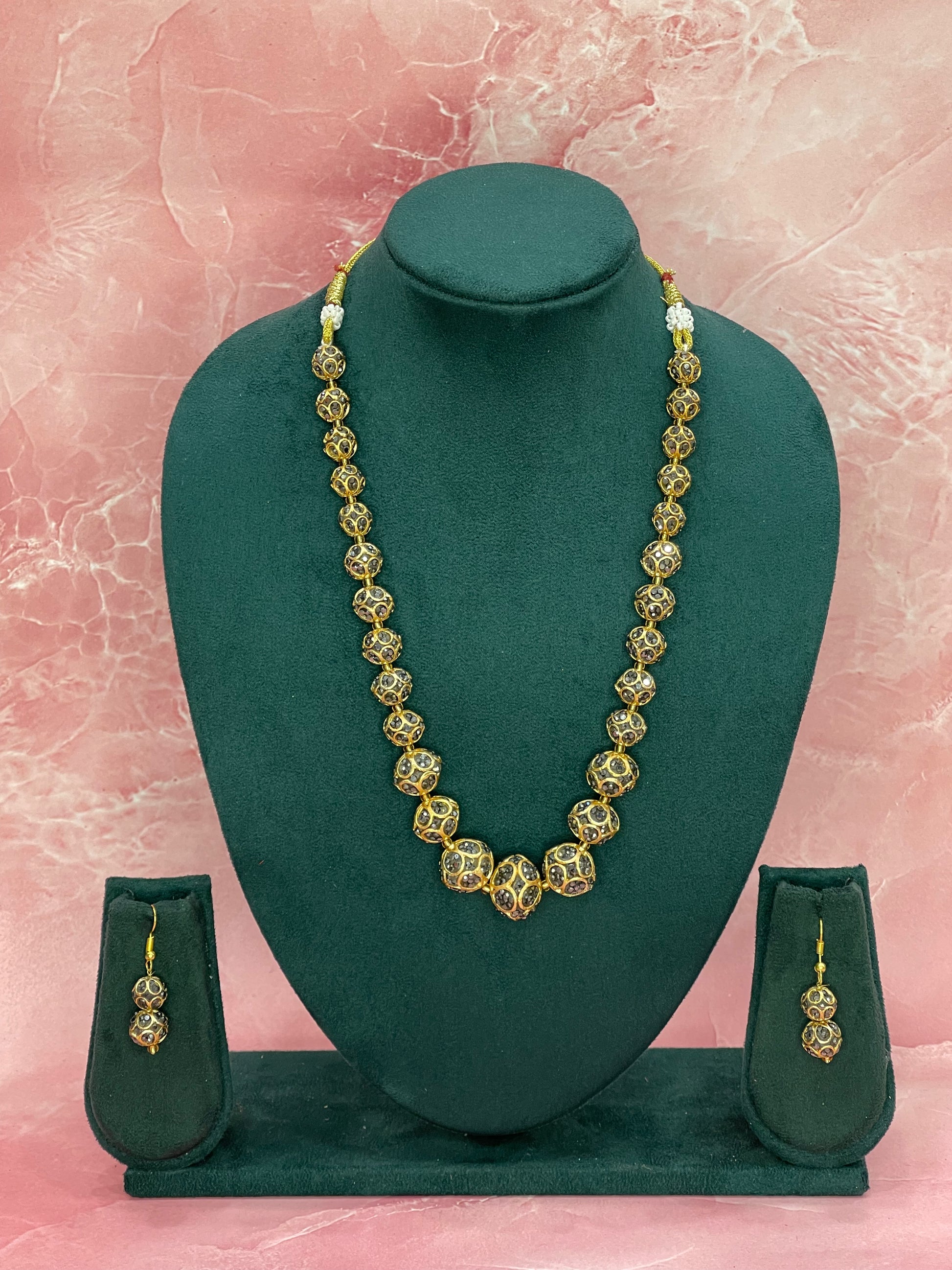 Rent the Antique Filigree Bead Necklace Set at FZO, Jubilee Hills. Crafted with ornate gold-toned spherical beads featuring intricate filigree patterns, this elegant necklace comes with matching drop earrings – perfect for ethnic celebrations, weddings, and festive occasions.