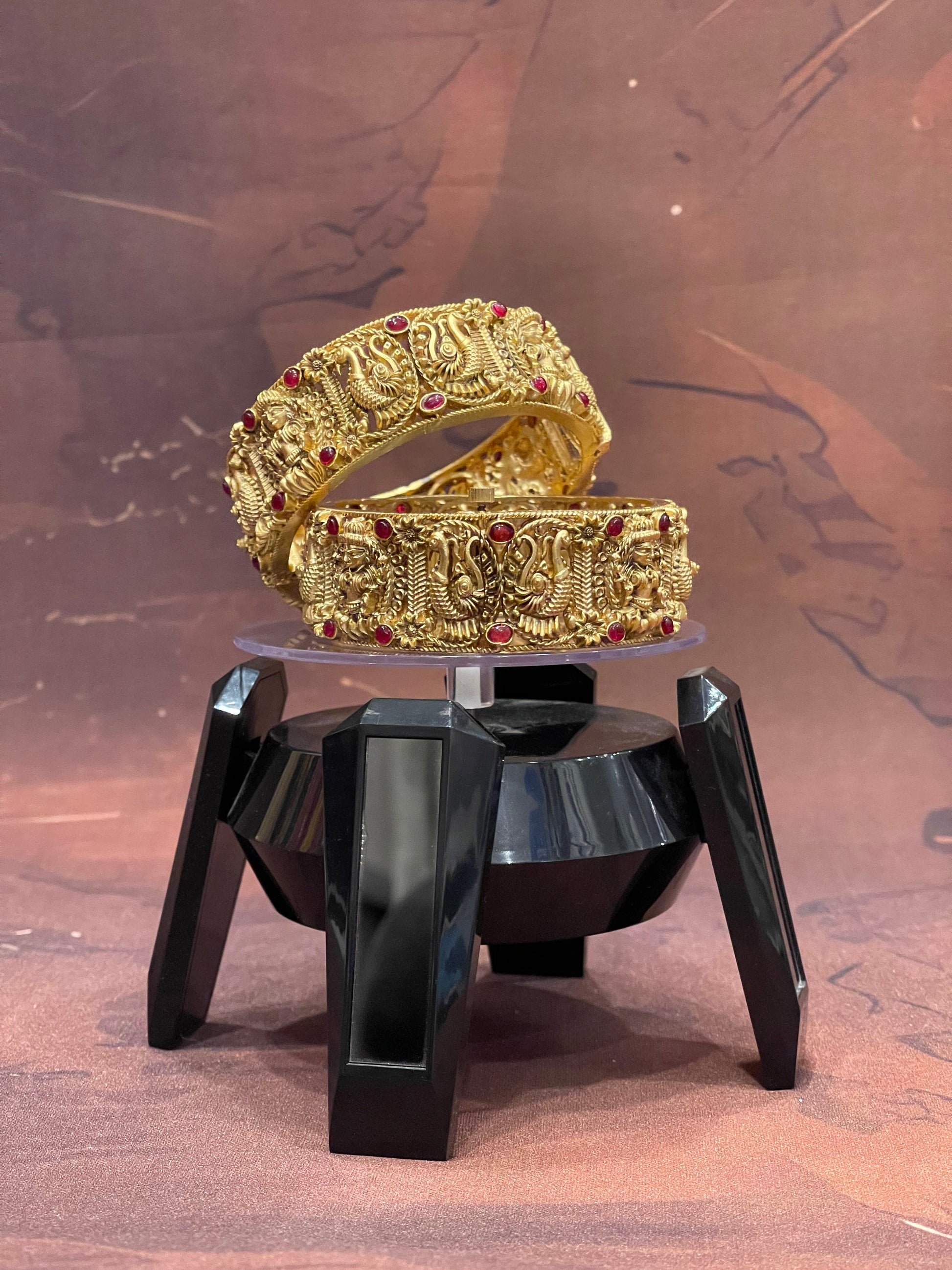 Elevate your ethnic look with these bold antique-finish bangles. Intricate craftsmanship and ruby-toned stones make them perfect for grand celebrations.