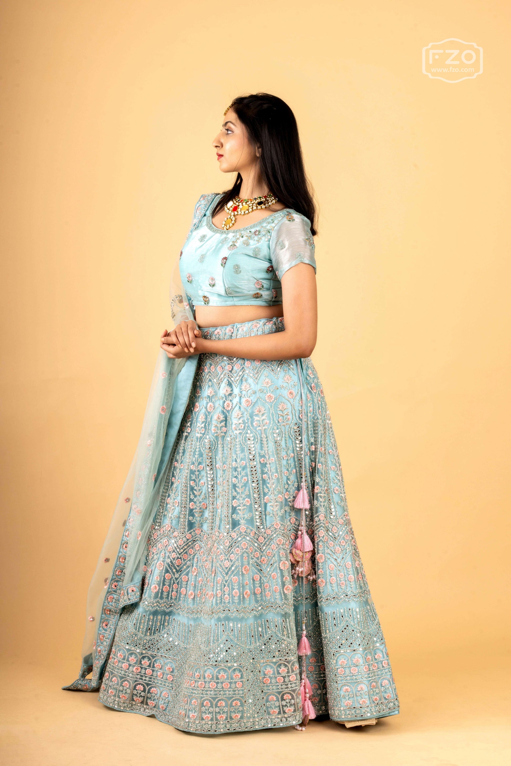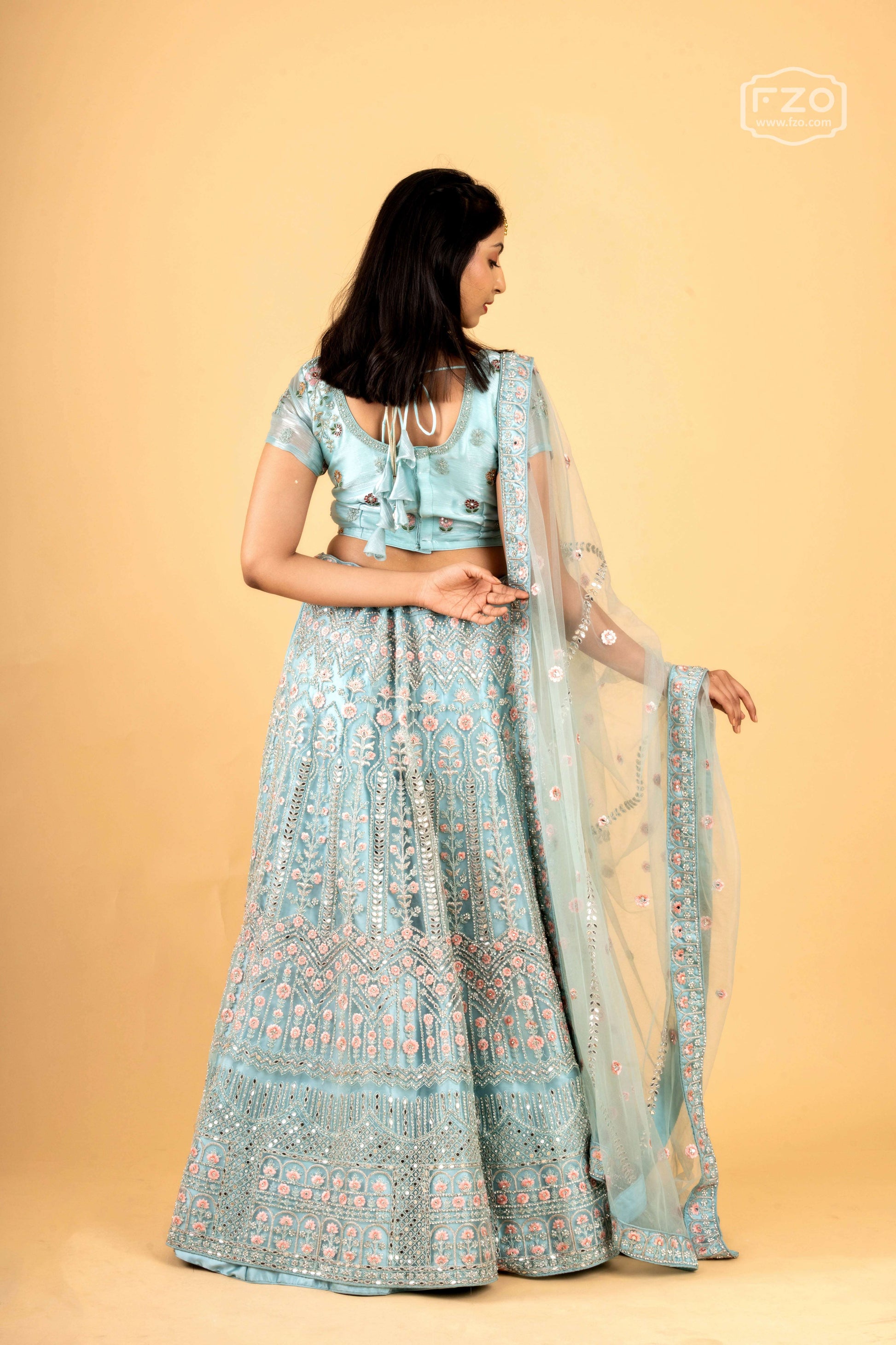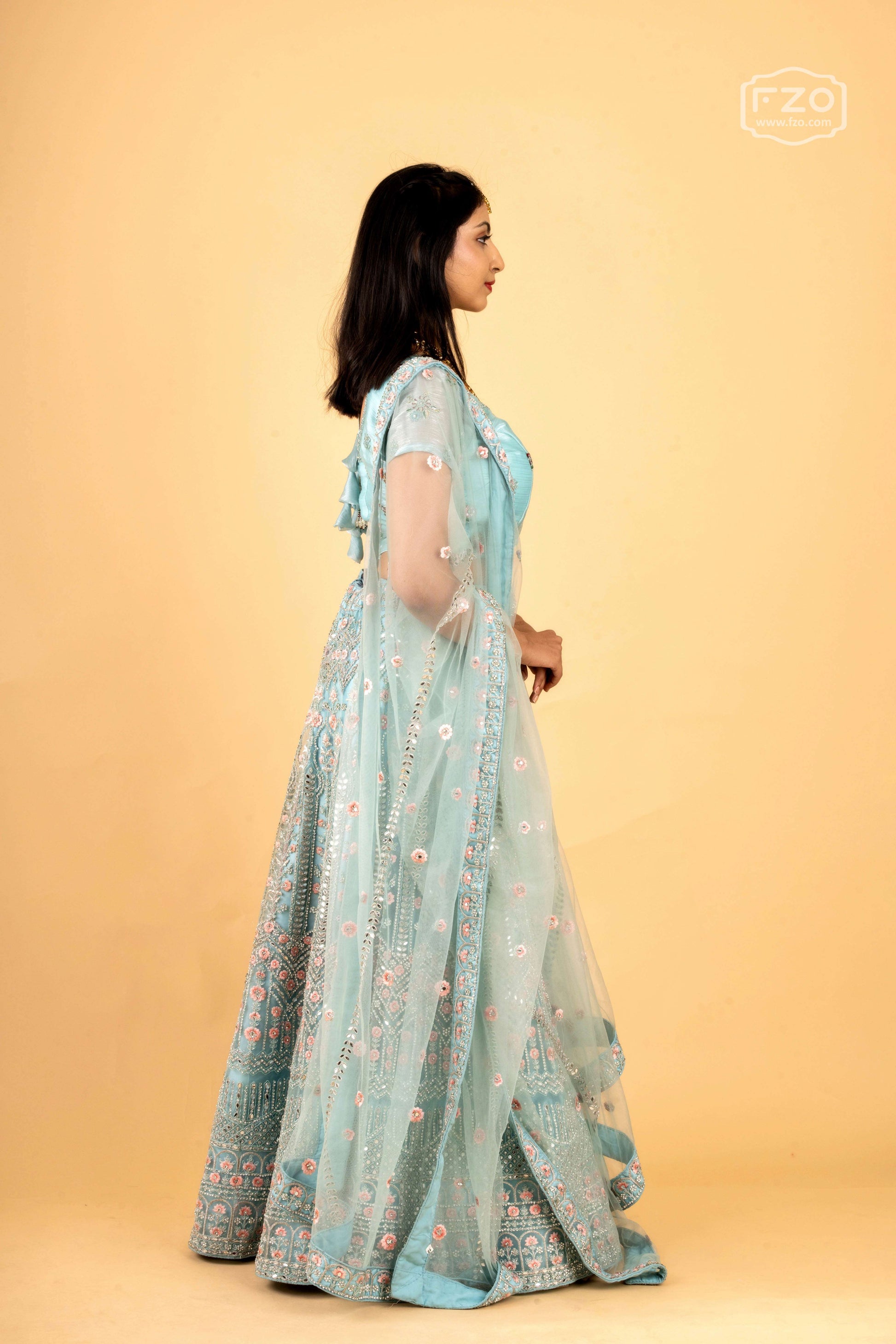 This ethereal light blue lehenga features delicate floral embroidery and shimmering sequin work, making it a perfect choice for daytime celebrations, engagement ceremonies, and elegant festive events. This charming designer ensemble is available for rent in Hyderabad, exclusively at FZO.