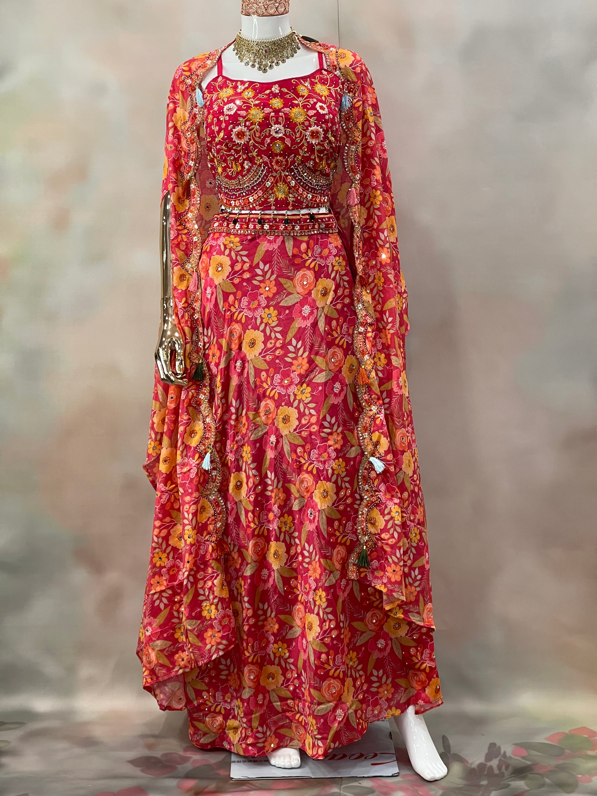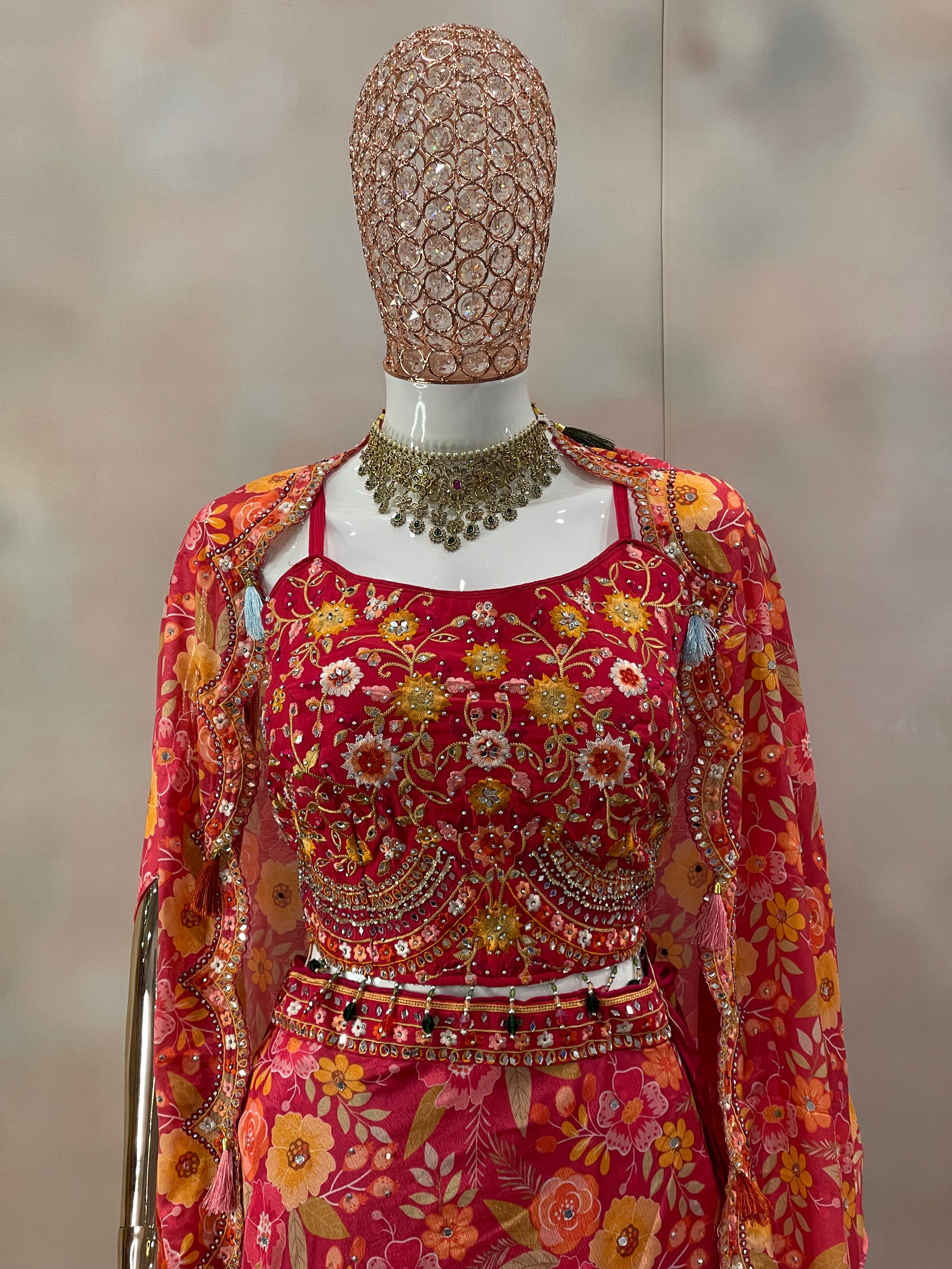 Step into festive elegance with this vibrant red anarkali set from FZO, Jubilee Hills. Adorned with bold yellow and orange floral prints, intricate mirror and thread embroidery, and paired with a flowy dupatta, this outfit blends traditional artistry with a fresh, modern vibe. Perfect for weddings, haldi, sangeet, or festive soirées.
