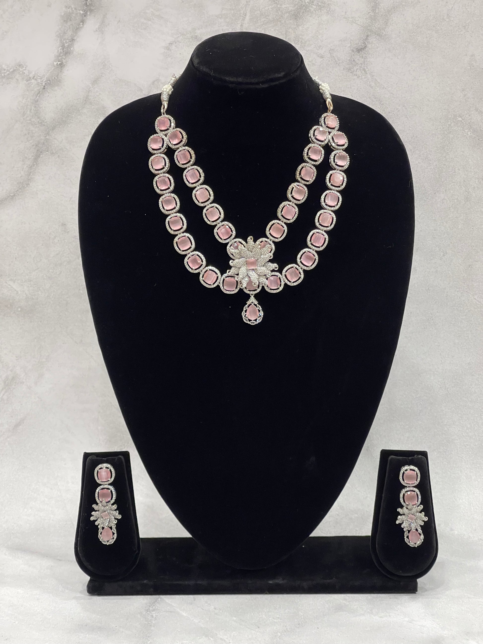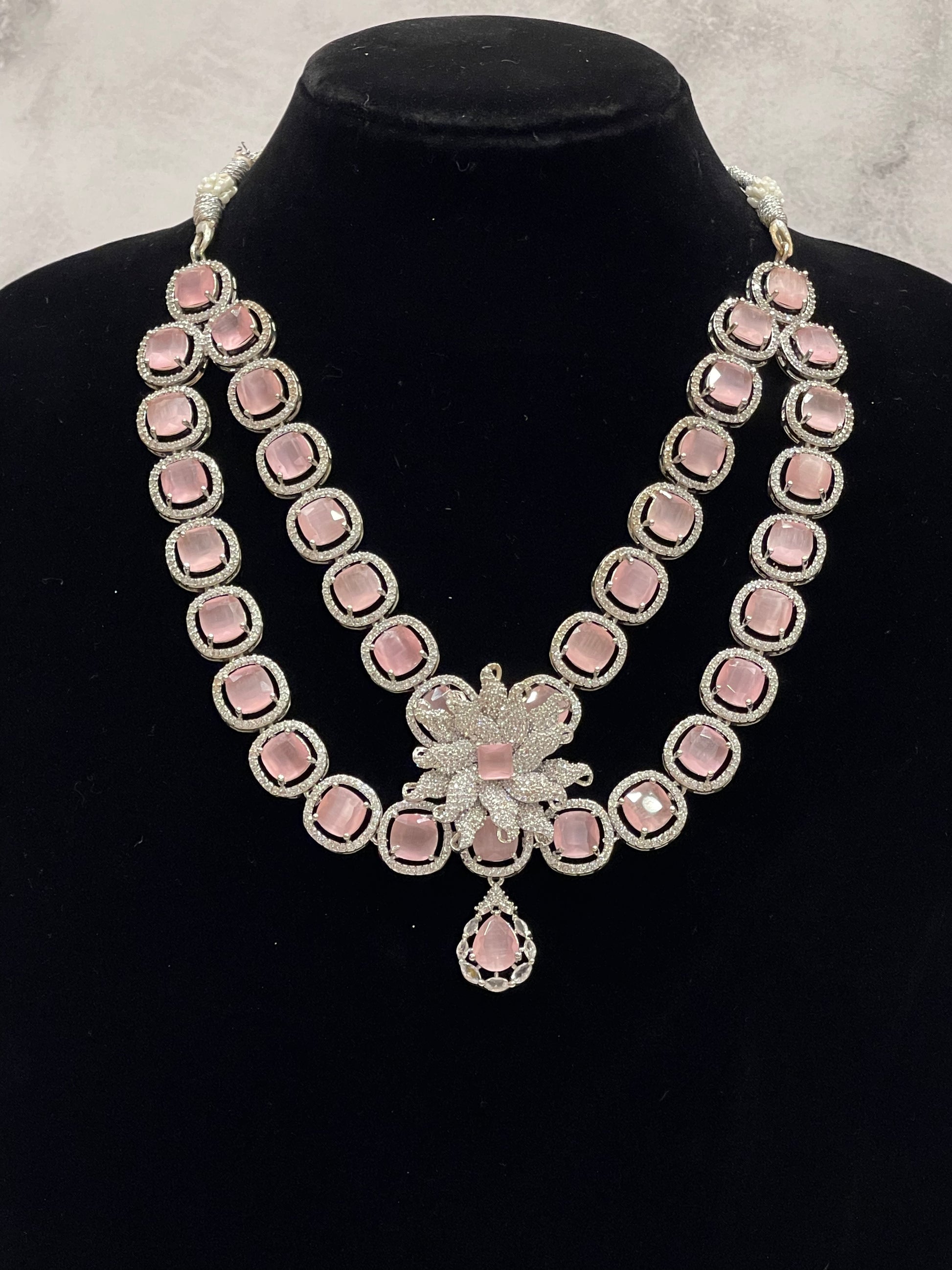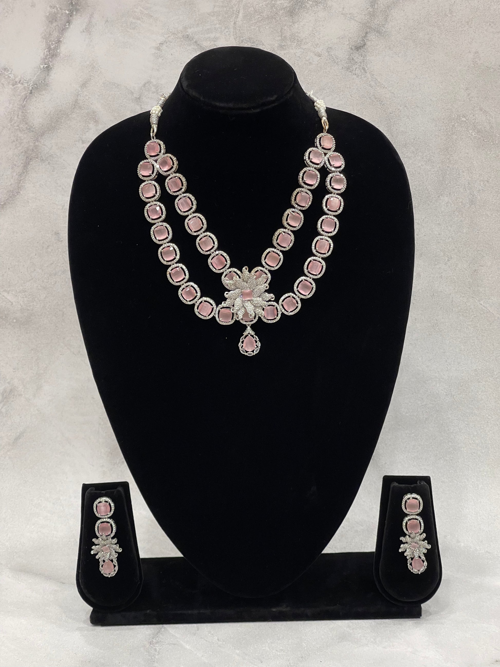 Rent the Blush Pink Crystal Bridal Necklace Set at FZO, Jubilee Hills. This elegant double-layered necklace is adorned with soft pink square-cut stones, framed in sparkling diamond accents, and finished with a floral motif pendant and coordinated drop earrings – perfect for engagement, sangeet, and bridal functions.