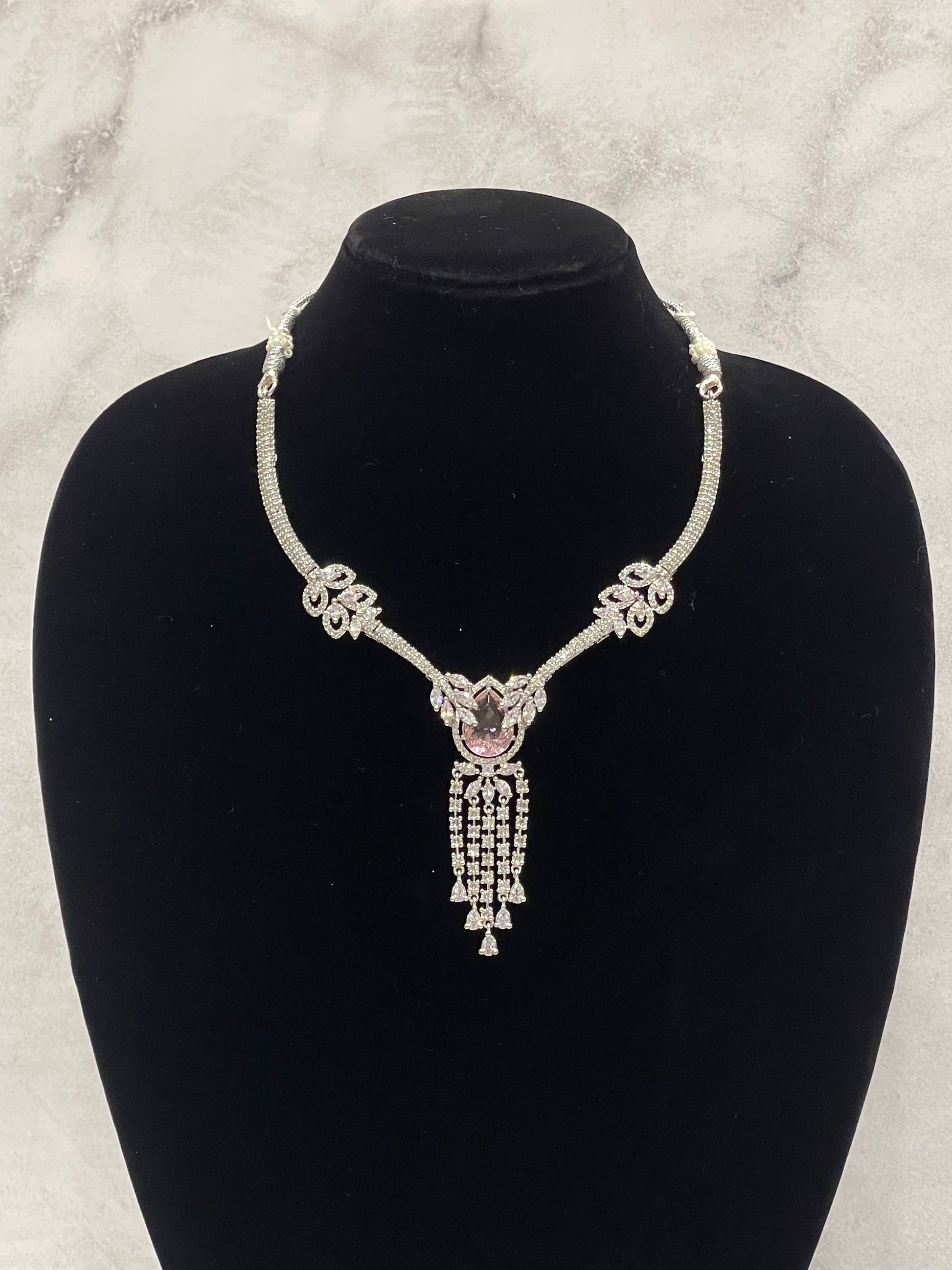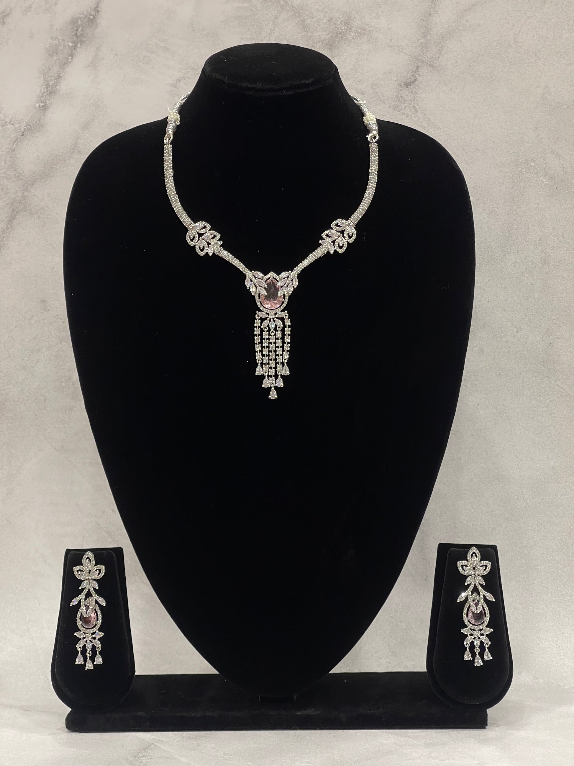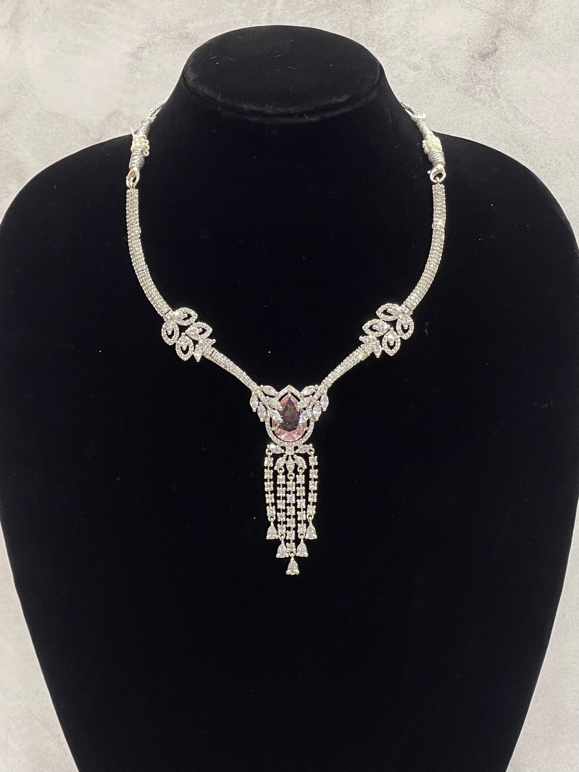 Step into elegance with our Blush Teardrop Cluster Necklace Set, available for rent at FZO, Jubilee Hills, Hyderabad. Designed with alternating oval and teardrop blush stones set in sparkling silver-tone frames, this set adds dramatic flair to any festive or bridal look.
