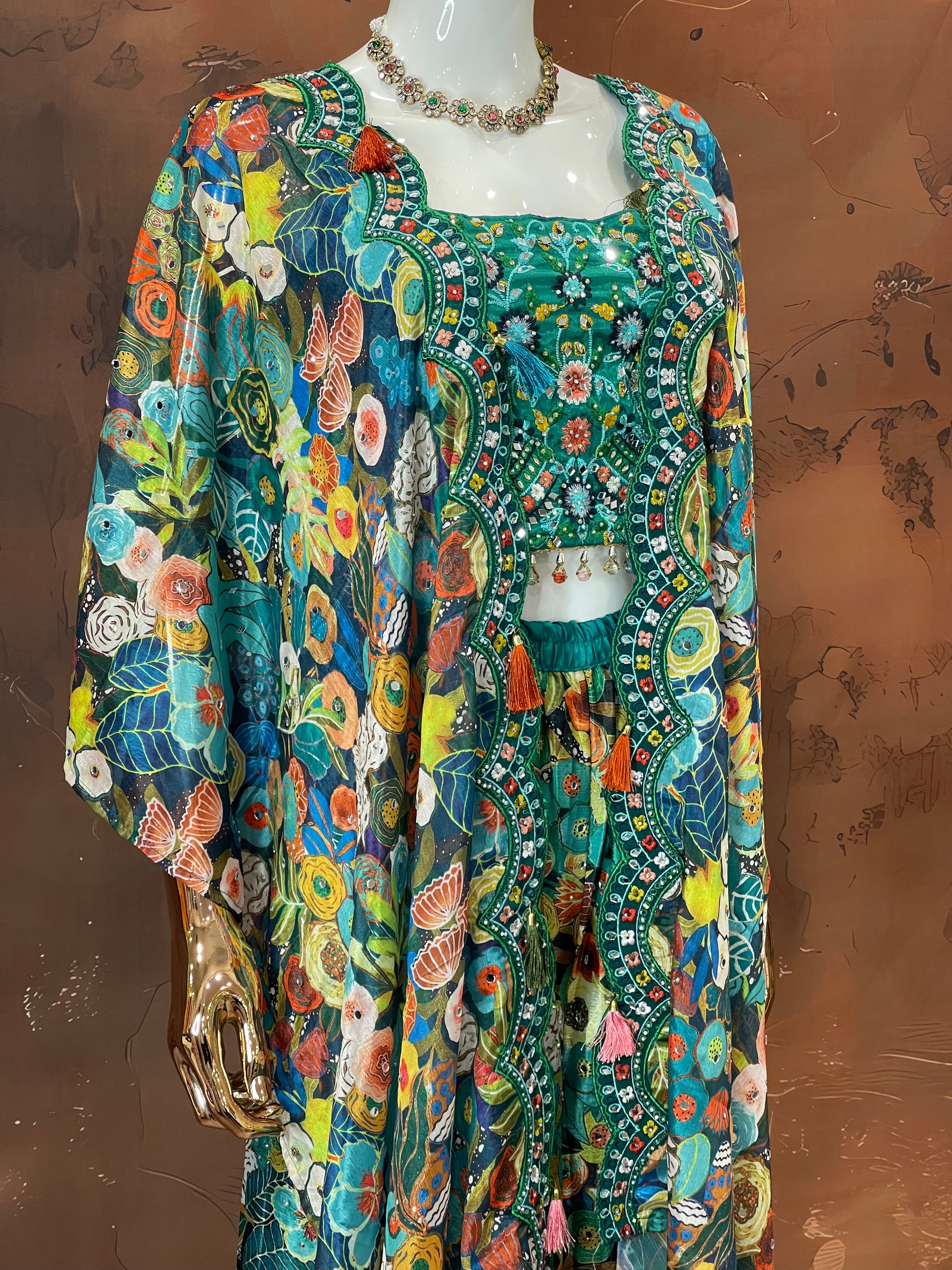 Unleash your inner free spirit with our Boho Bloom Cape Set – a lively three-piece ensemble featuring a smocked crop top, wide-leg palazzos, and a flowing printed cape. Crafted in a riot of botanical and artistic prints, this set is a playful blend of color and comfort – perfect for haldi functions, mehendi brunches, or destination celebrations.