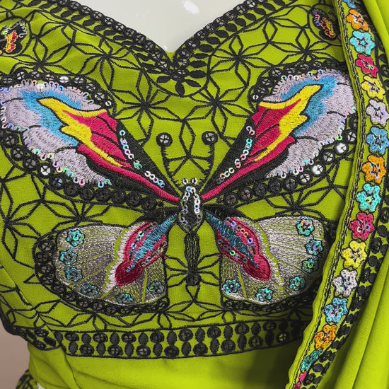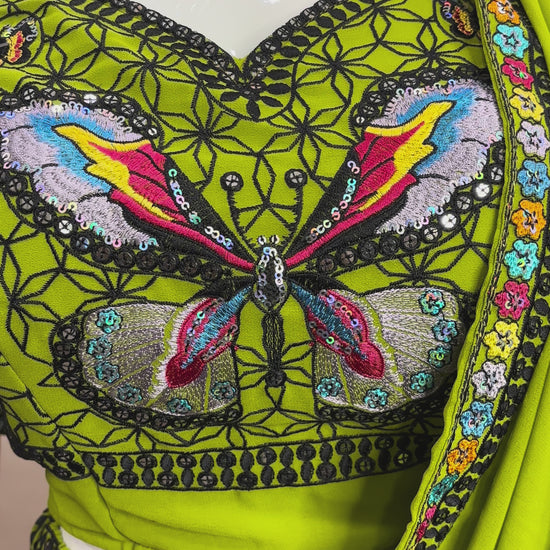 Whimsical and bold, the Butterfly Bloom lehenga set is a statement piece in bright lime green, featuring multicolour butterfly embroidery and playful mirror work. Perfect for mehendi functions, haldi ceremonies, or destination celebrations.
