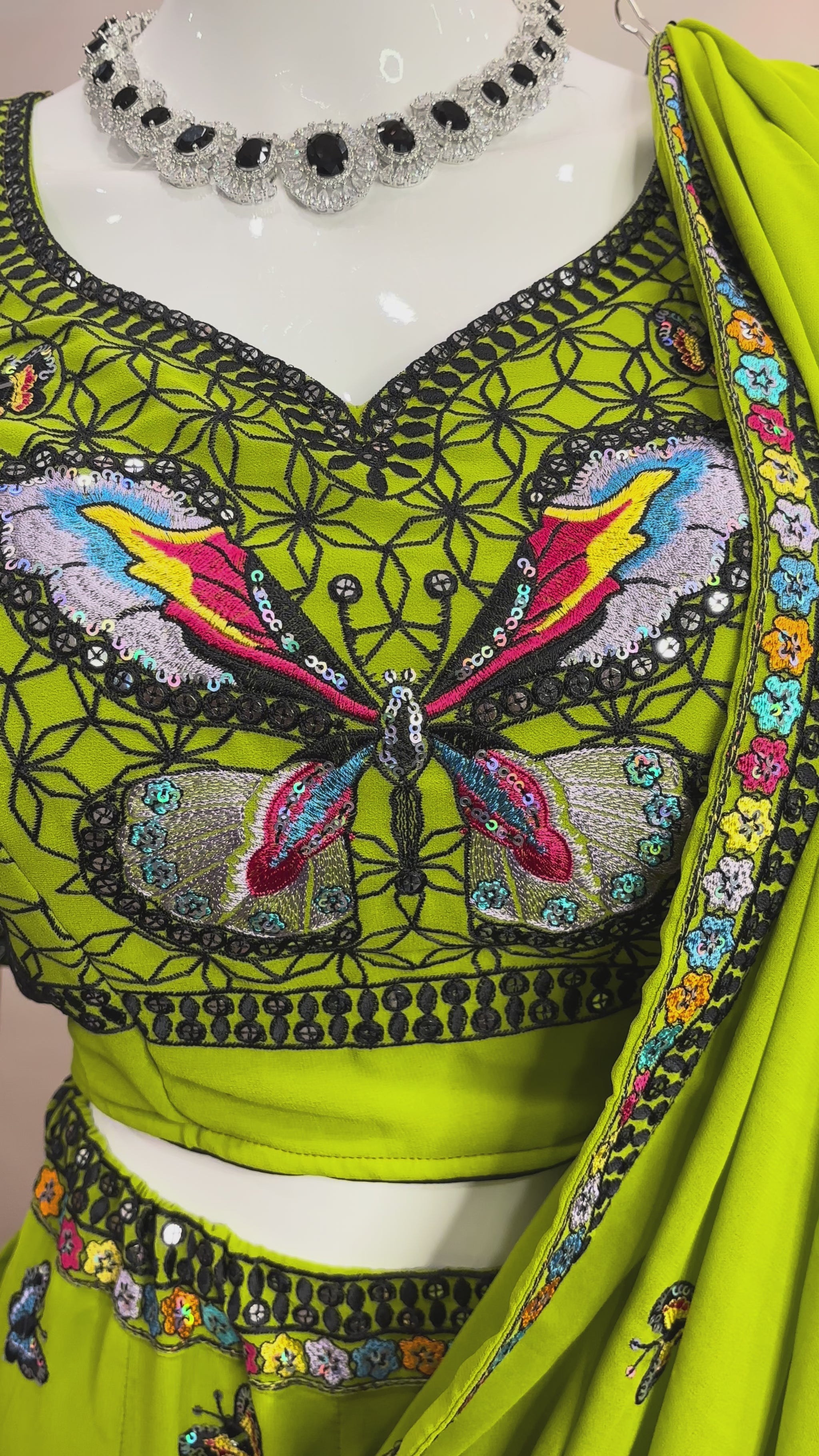 What’s Included: Embroidered lehenga skirt, butterfly motif blouse, and attached pallu-style dupatta