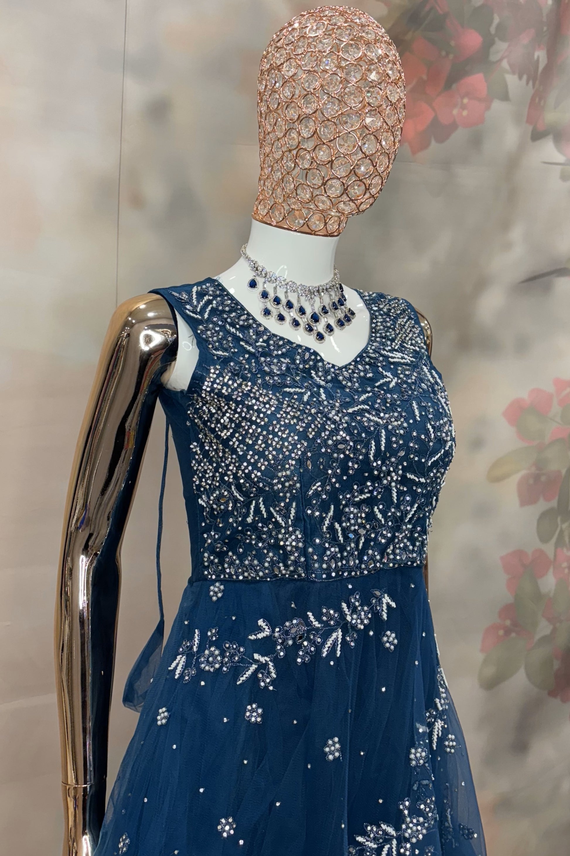 Navy Blue Net Gown with Silver Embellishments