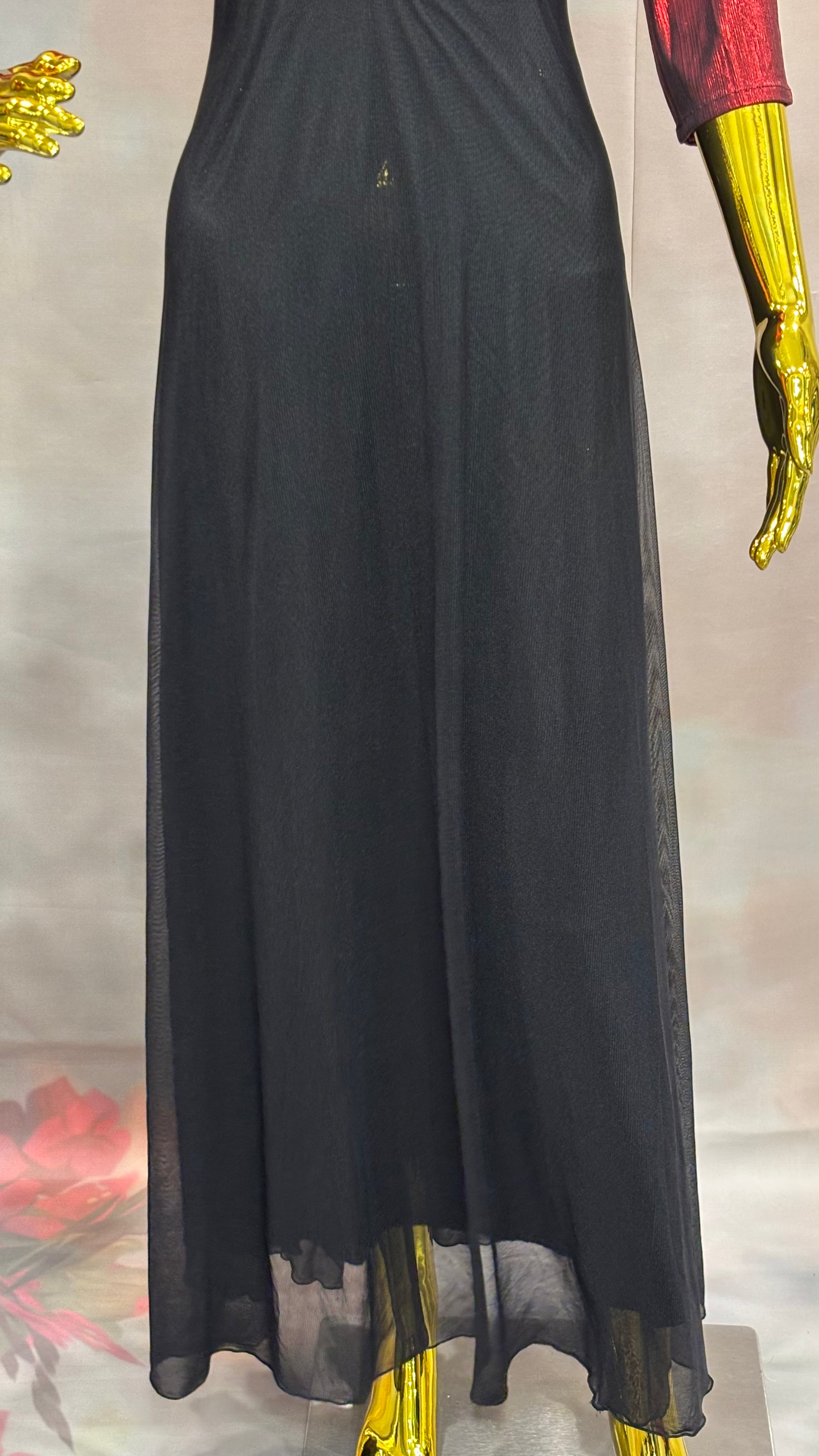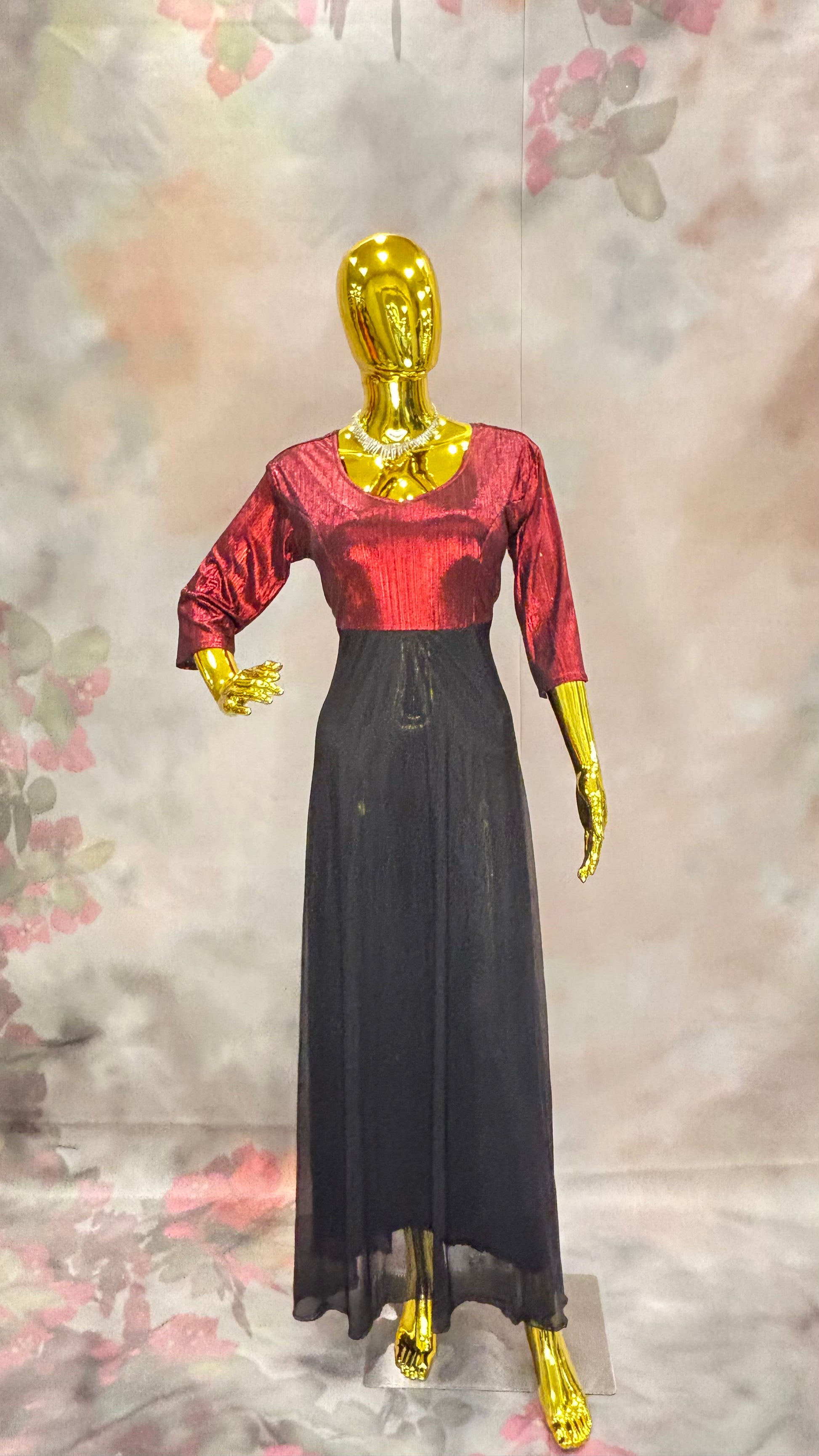 • Dual-Tone Glam: Textured maroon top with a sheer black flowy bottom