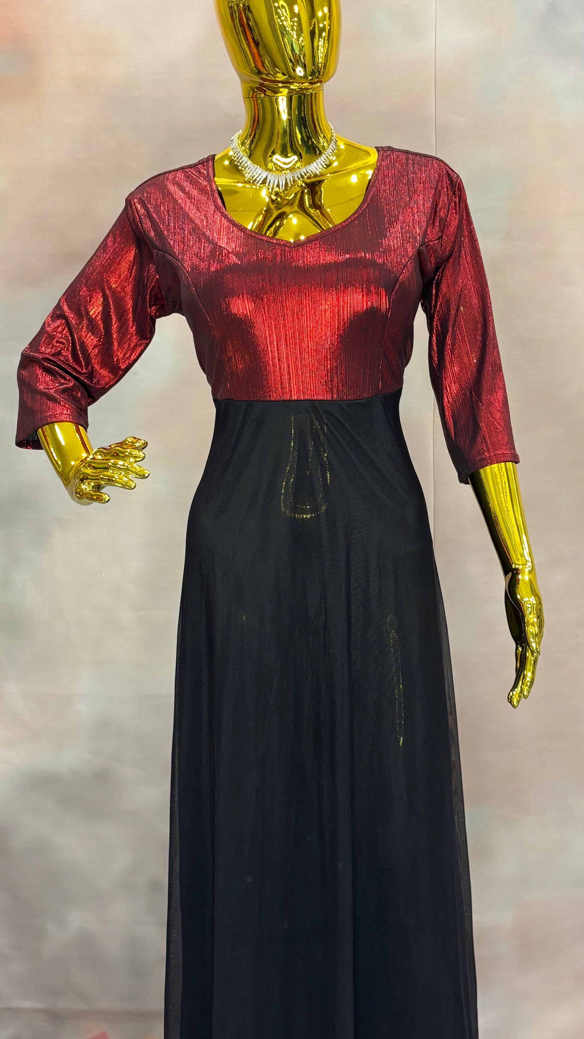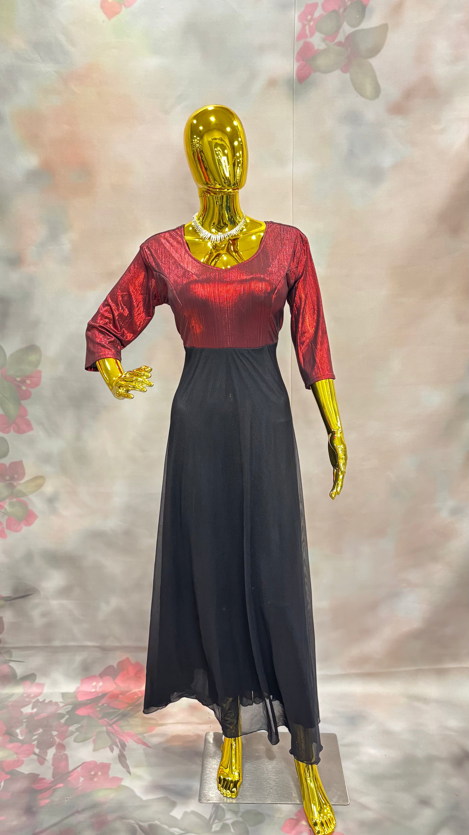 Step into the spotlight with this captivating maroon and black partywear gown. The rich maroon textured bodice paired with a flowing black netted skirt creates a stunning contrast perfect for special evenings. Now available for rent exclusively at FZO, Hyderabad.