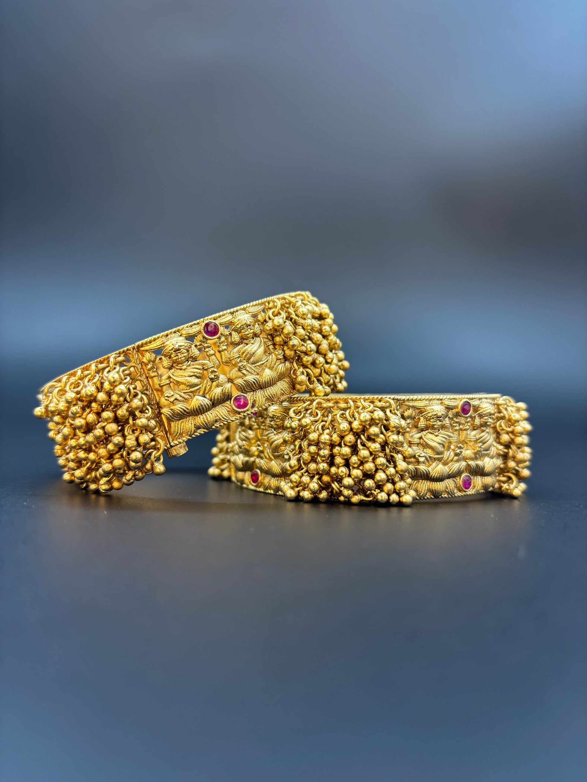 Celebrate heritage and artistry with these divine antique-inspired bangles, intricately designed with deity motifs symbolizing blessings and prosperity. The captivating craftsmanship features detailed depictions of traditional deities, highlighted by ruby accents that add a touch of elegance and richness.