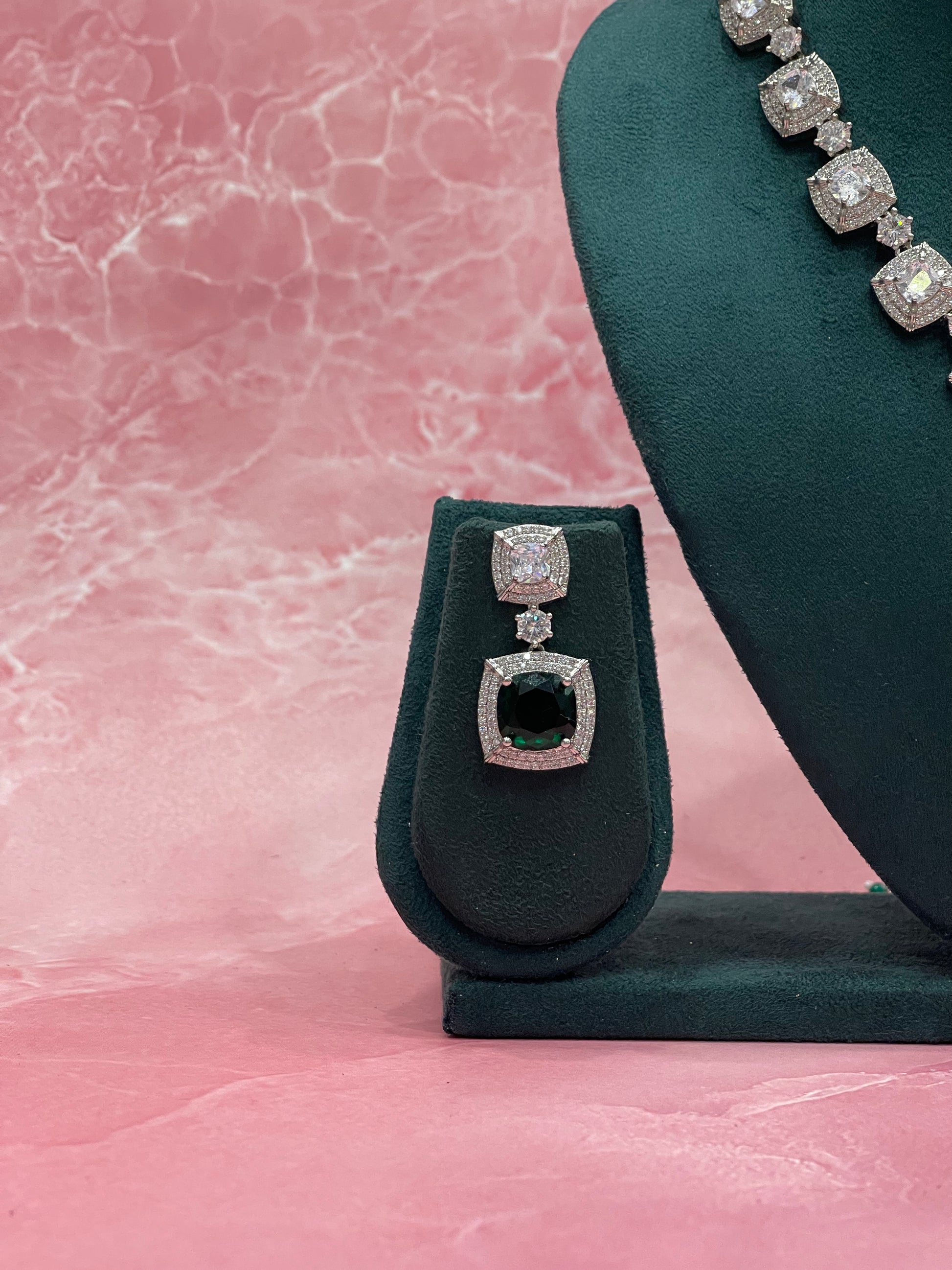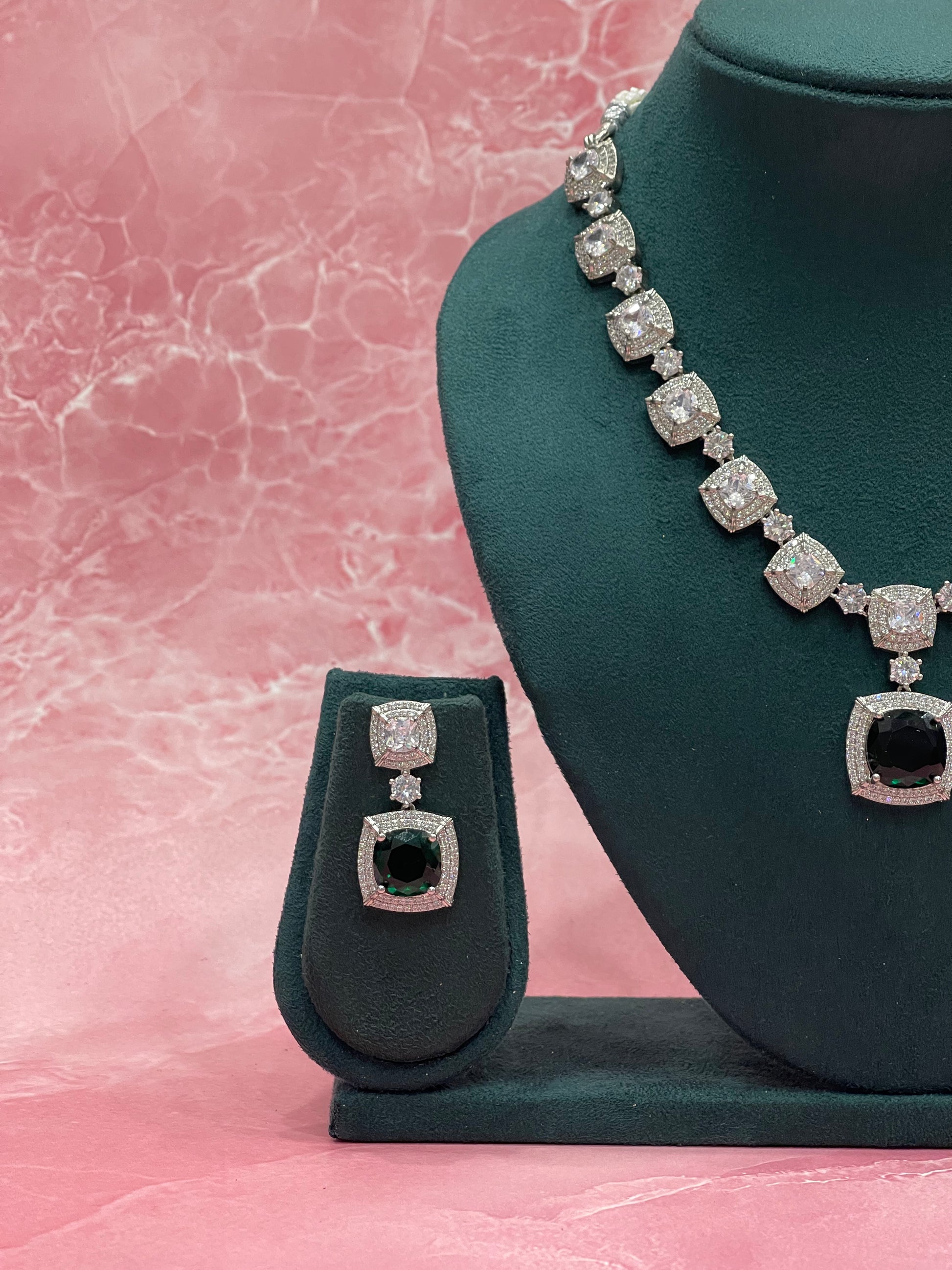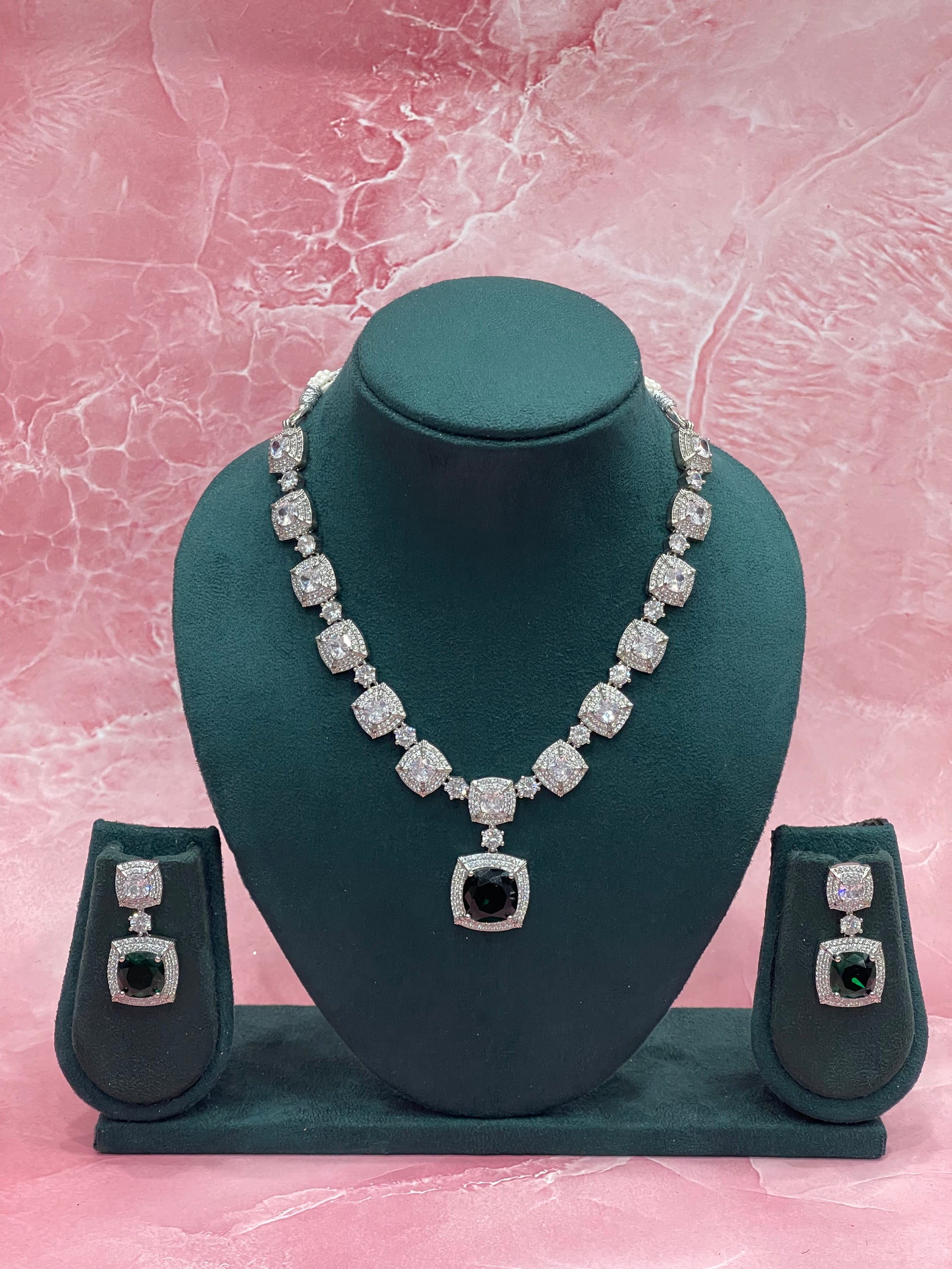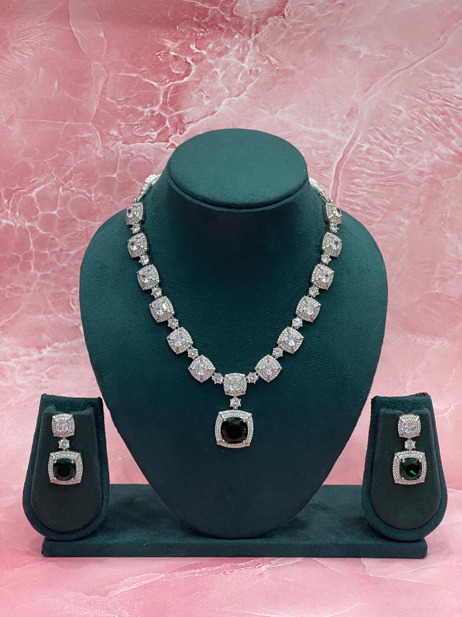 Diamond-style necklace with a square black stone pendant and matching drop earrings.