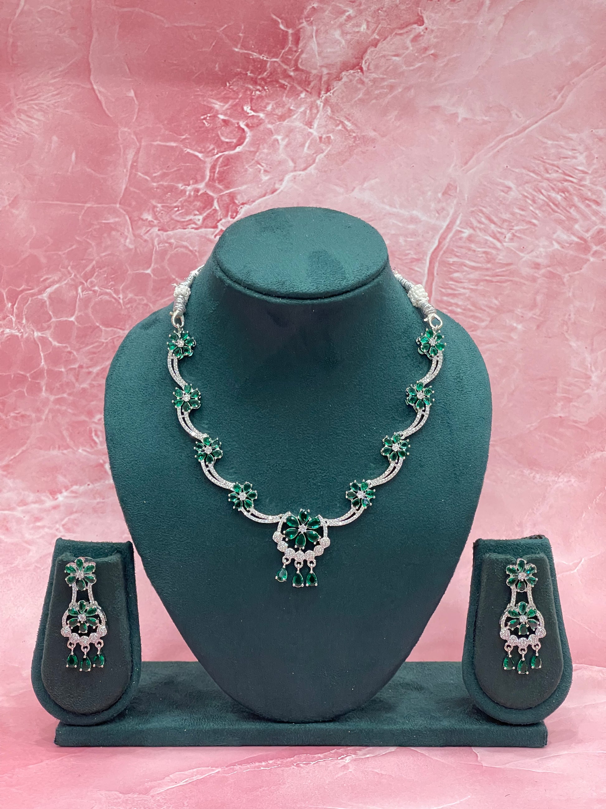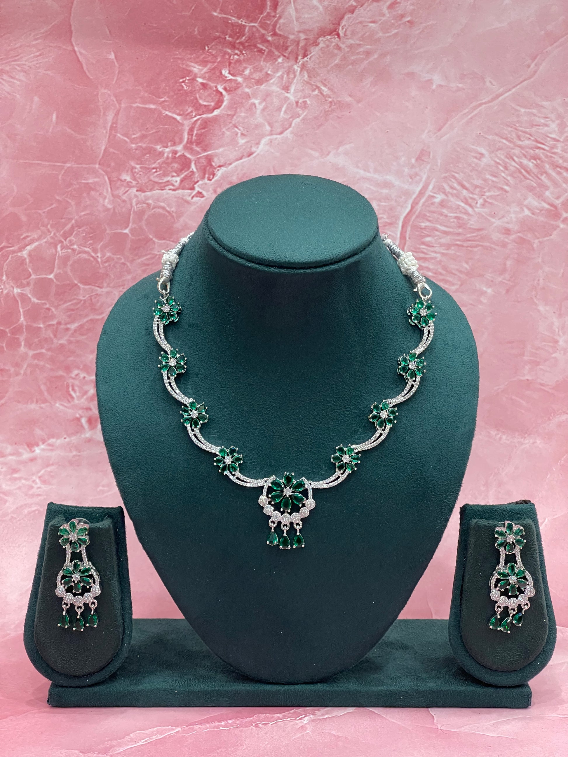 Rent the Emerald Blossom Necklace Set at FZO, Jubilee Hills. Featuring delicate floral motifs crafted from radiant green stones and encrusted with shimmering diamonds, this elegant set includes a matching necklace and earrings – perfect for weddings, sangeets, or festive occasions.