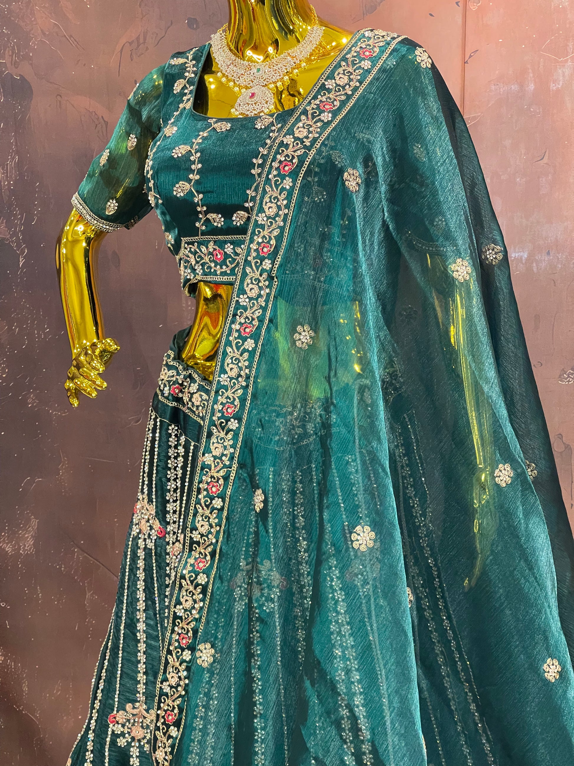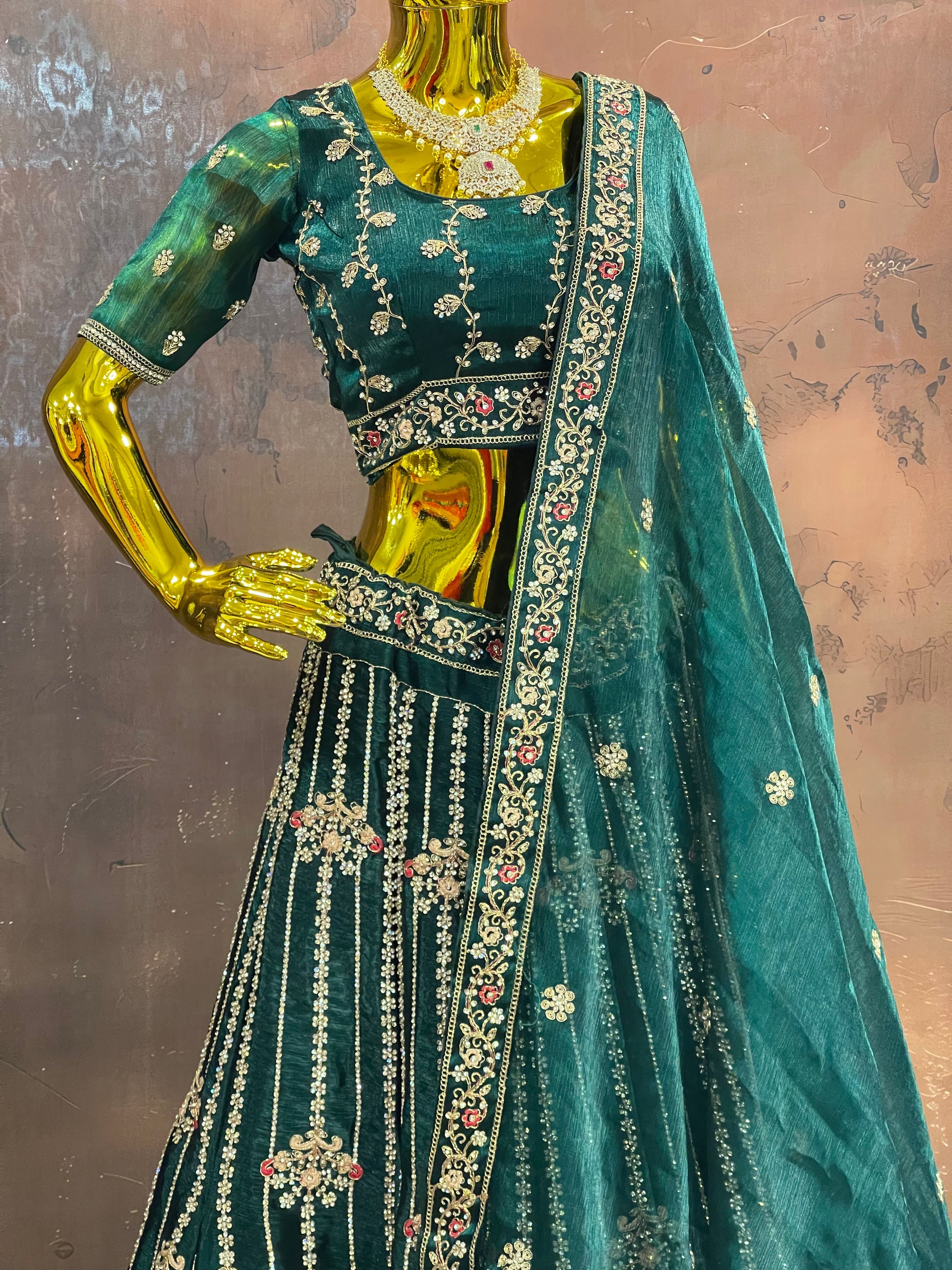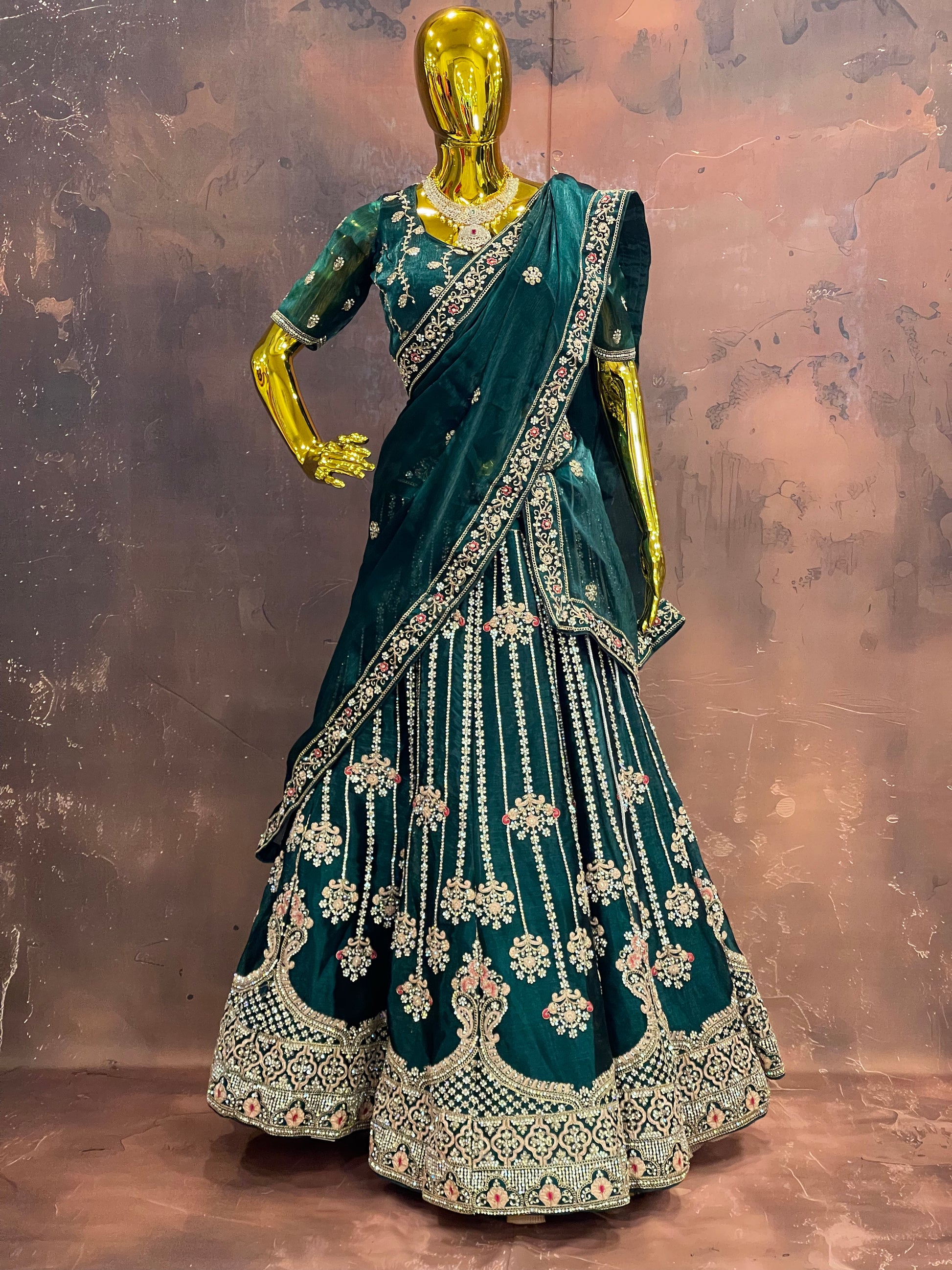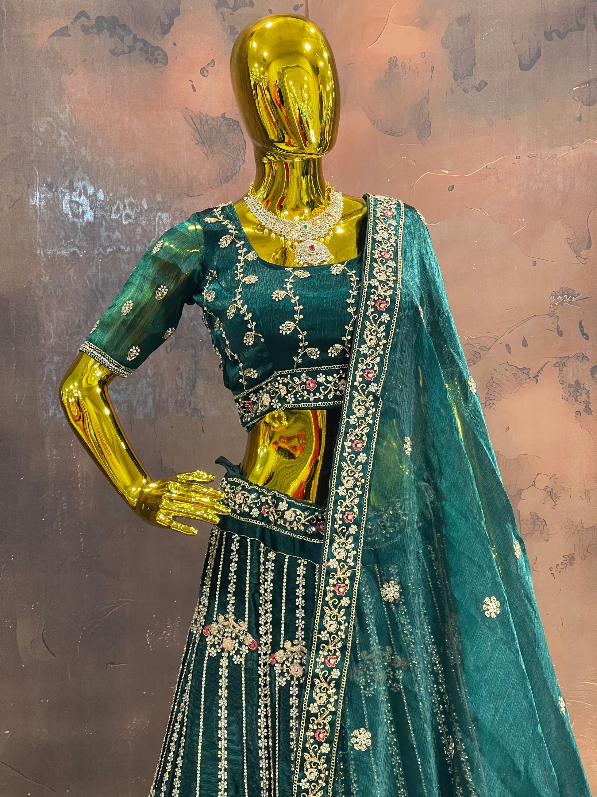 Drape yourself in royal charm with our Emerald Opulence lehenga – an intricately hand-embroidered ensemble featuring regal motifs and rich detailing throughout. Ideal for weddings, receptions, or grand festive occasions.