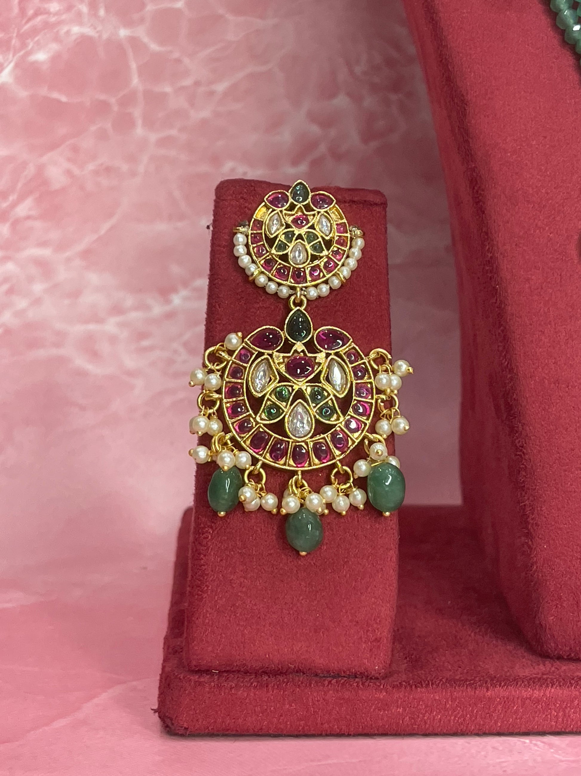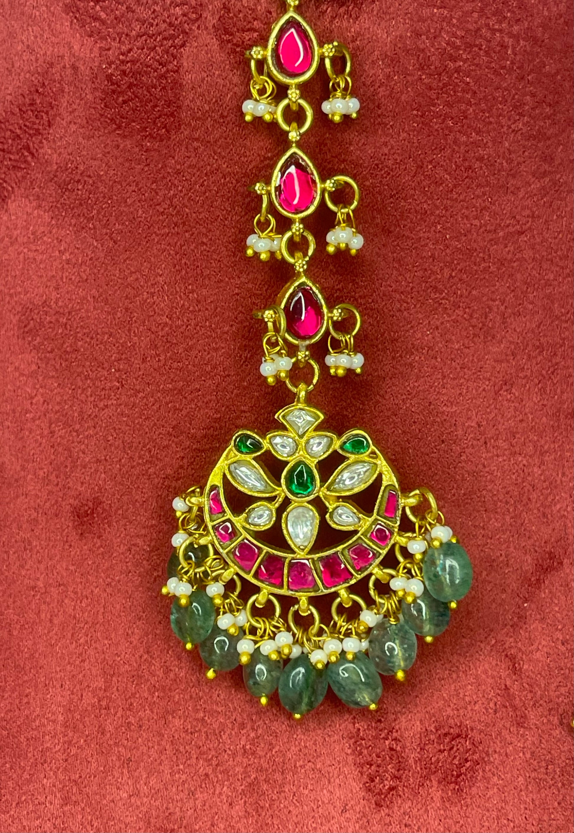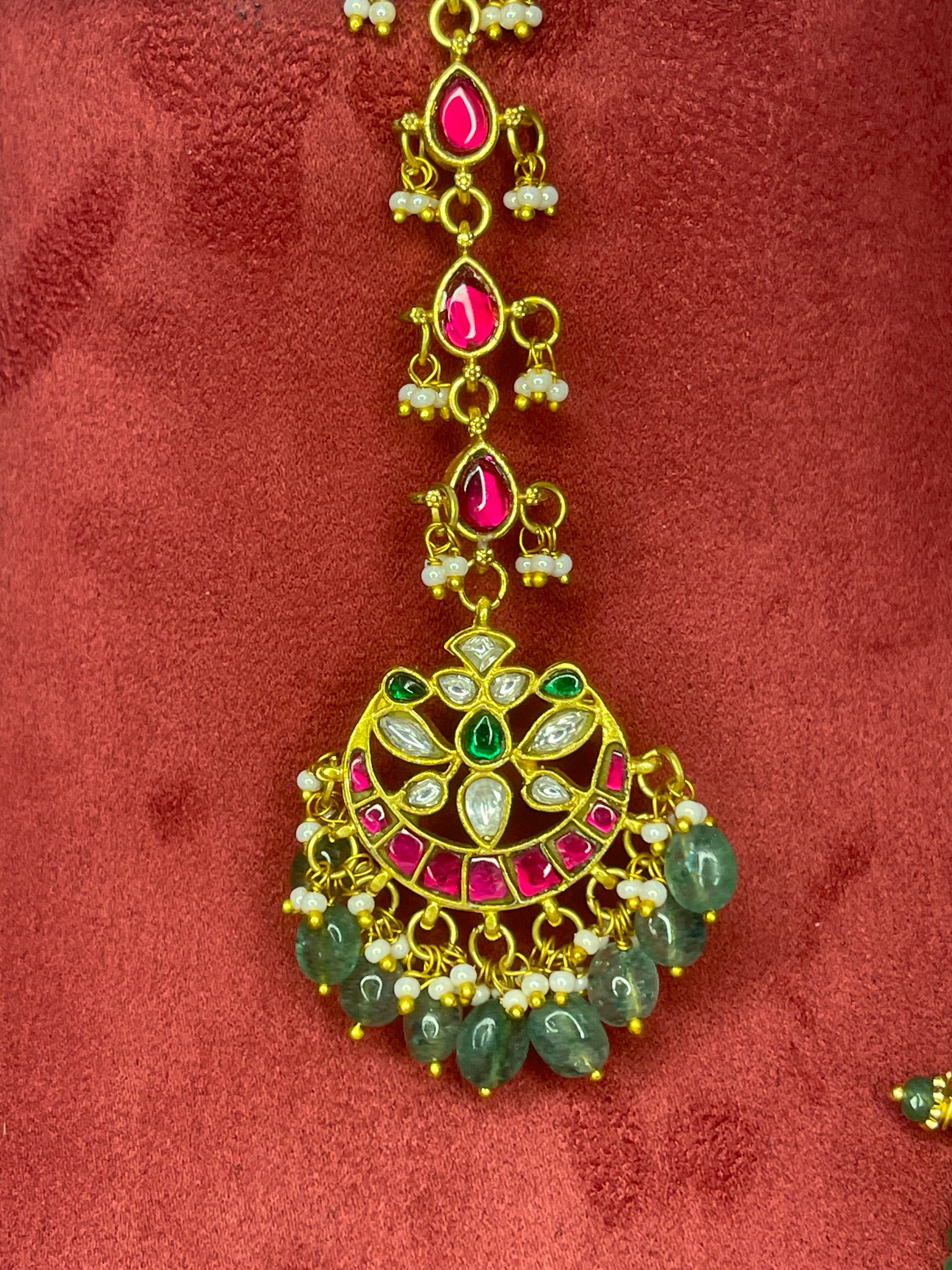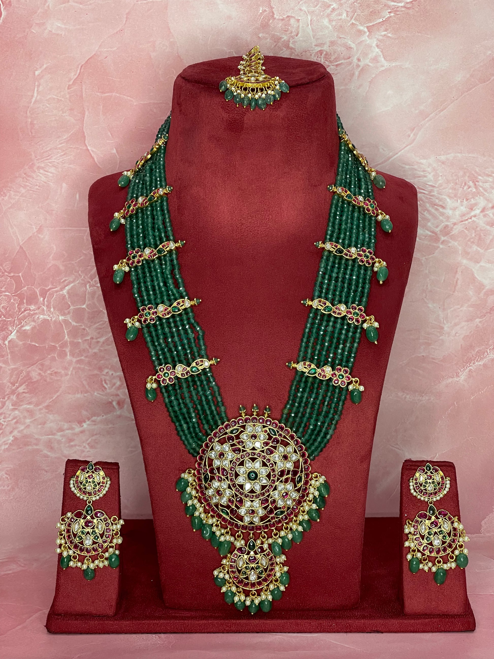 Layered green beaded necklace with circular pendant, matching earrings, and maang tikka.