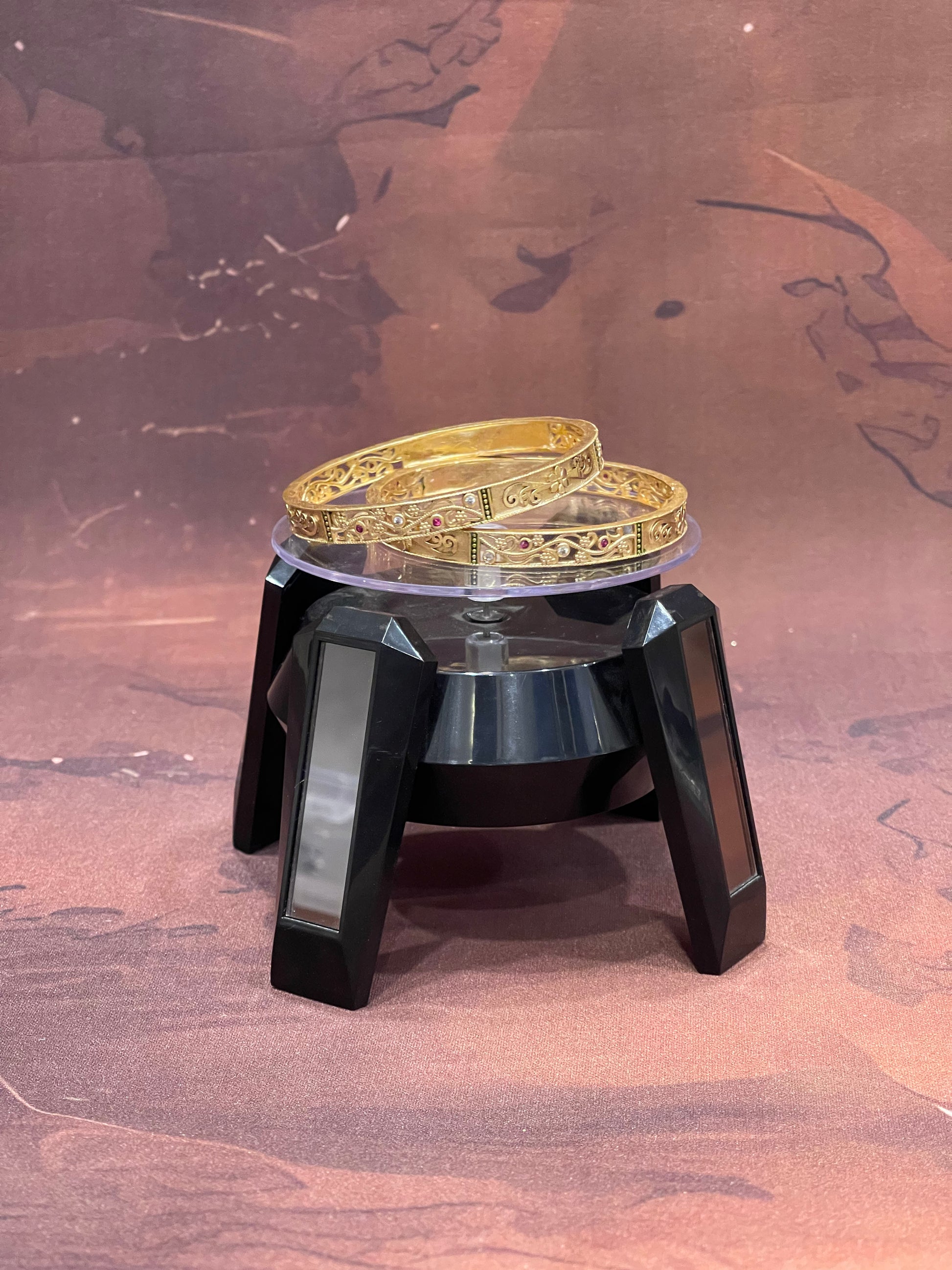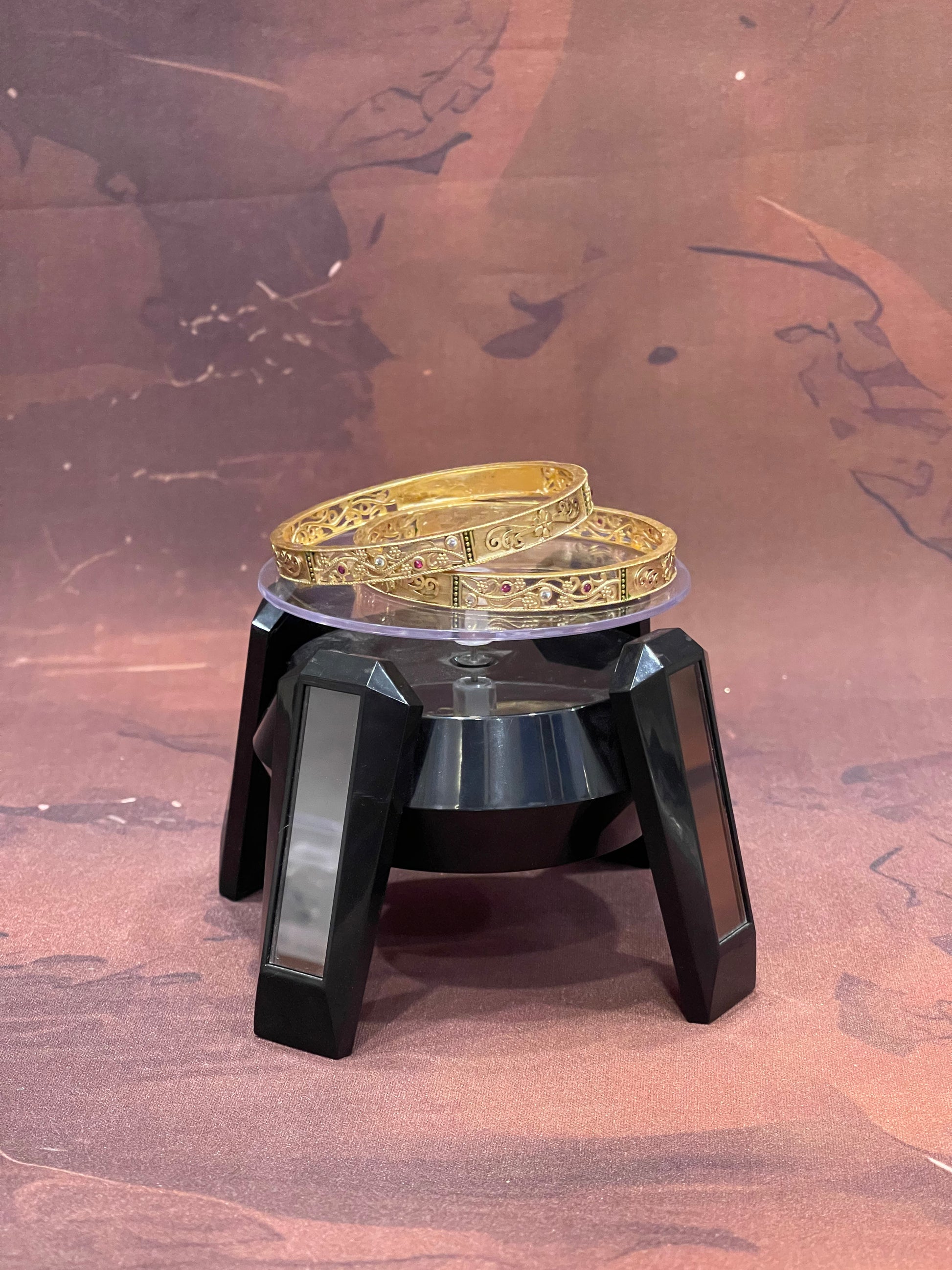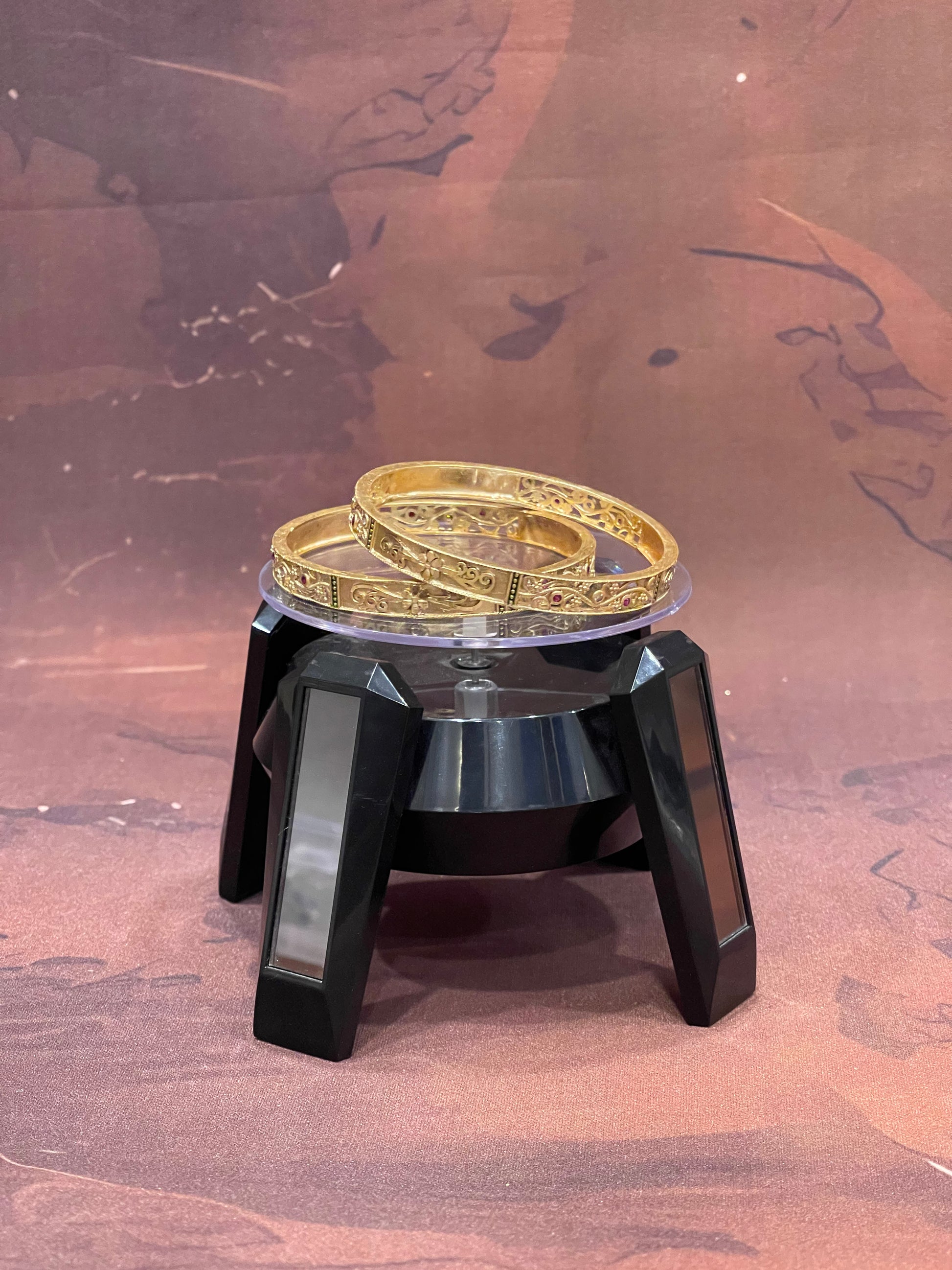 Gracefully crafted with floral etching and subtle ruby-colored stones, these lightweight gold-toned bangles add refined charm to any traditional or semi-formal look.