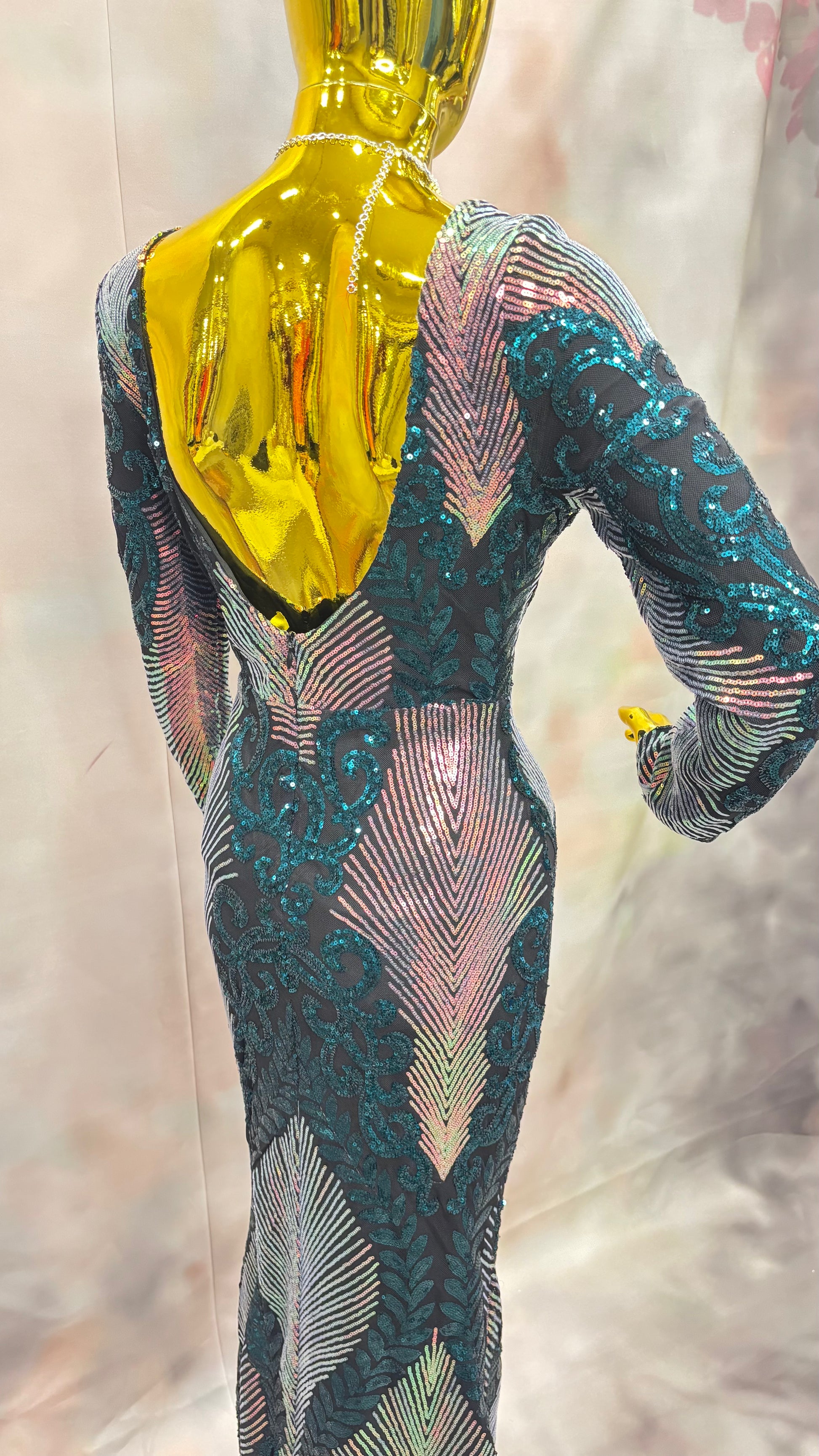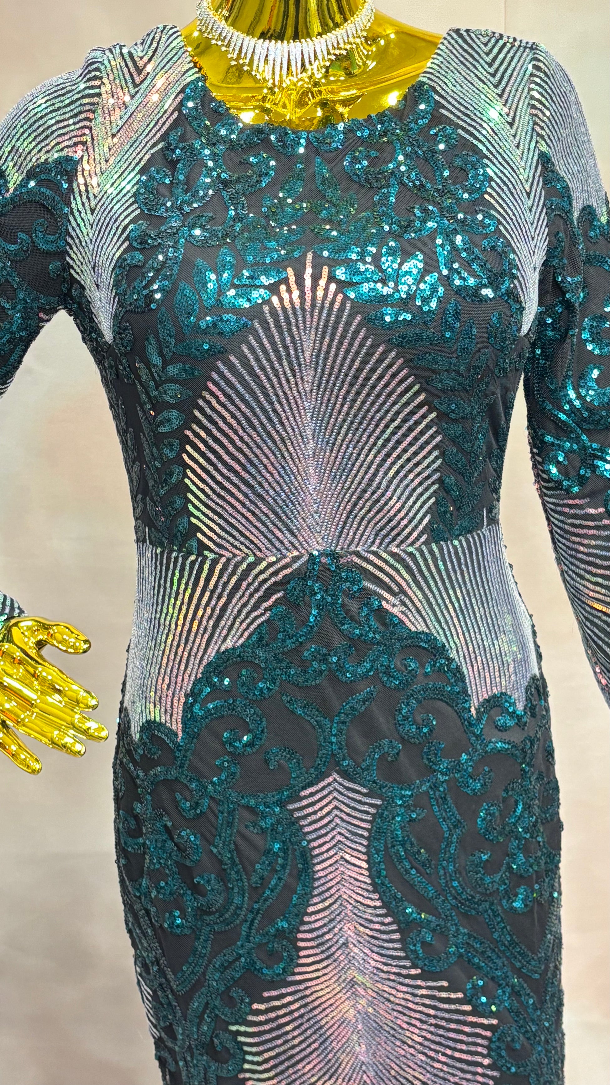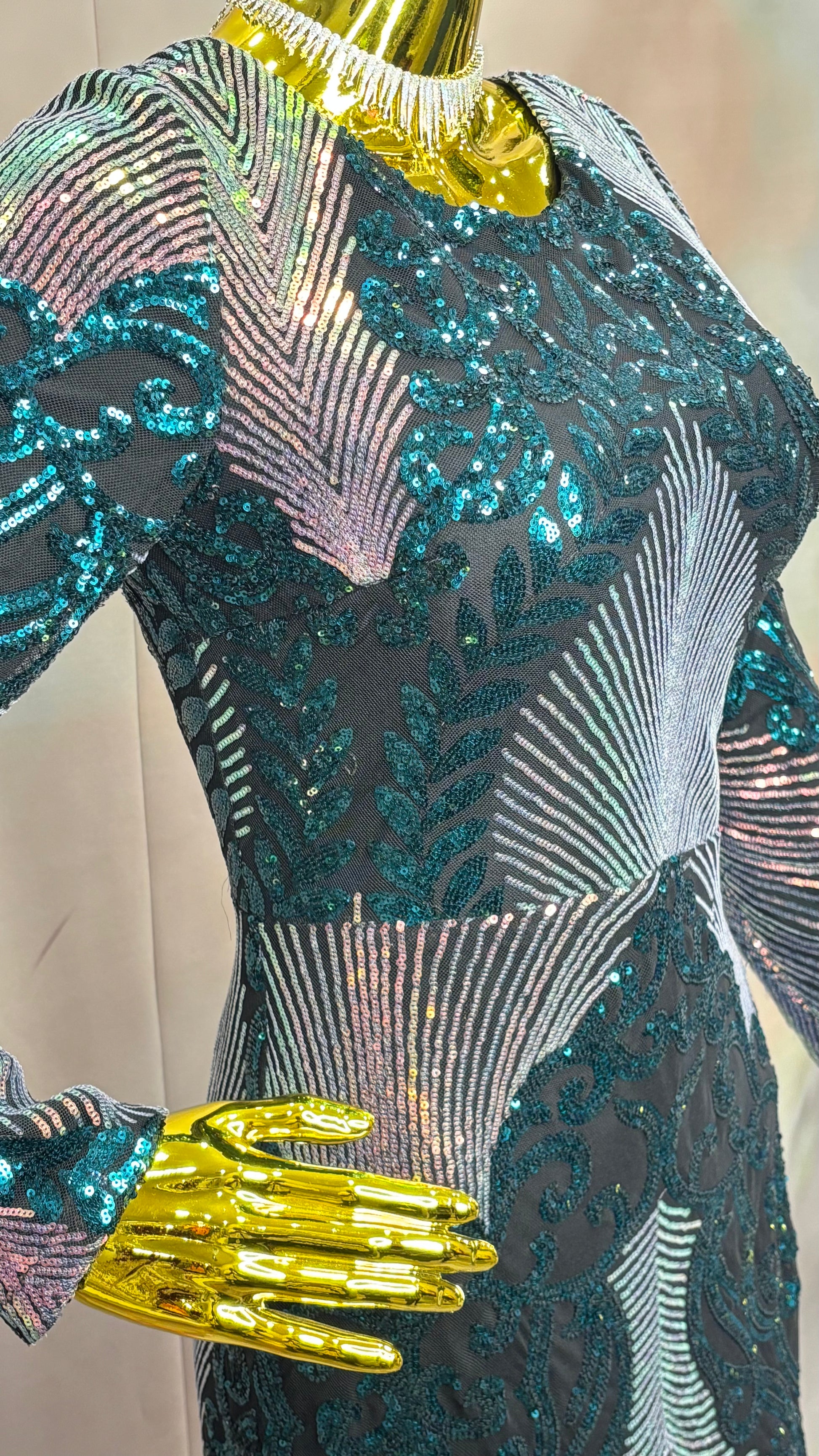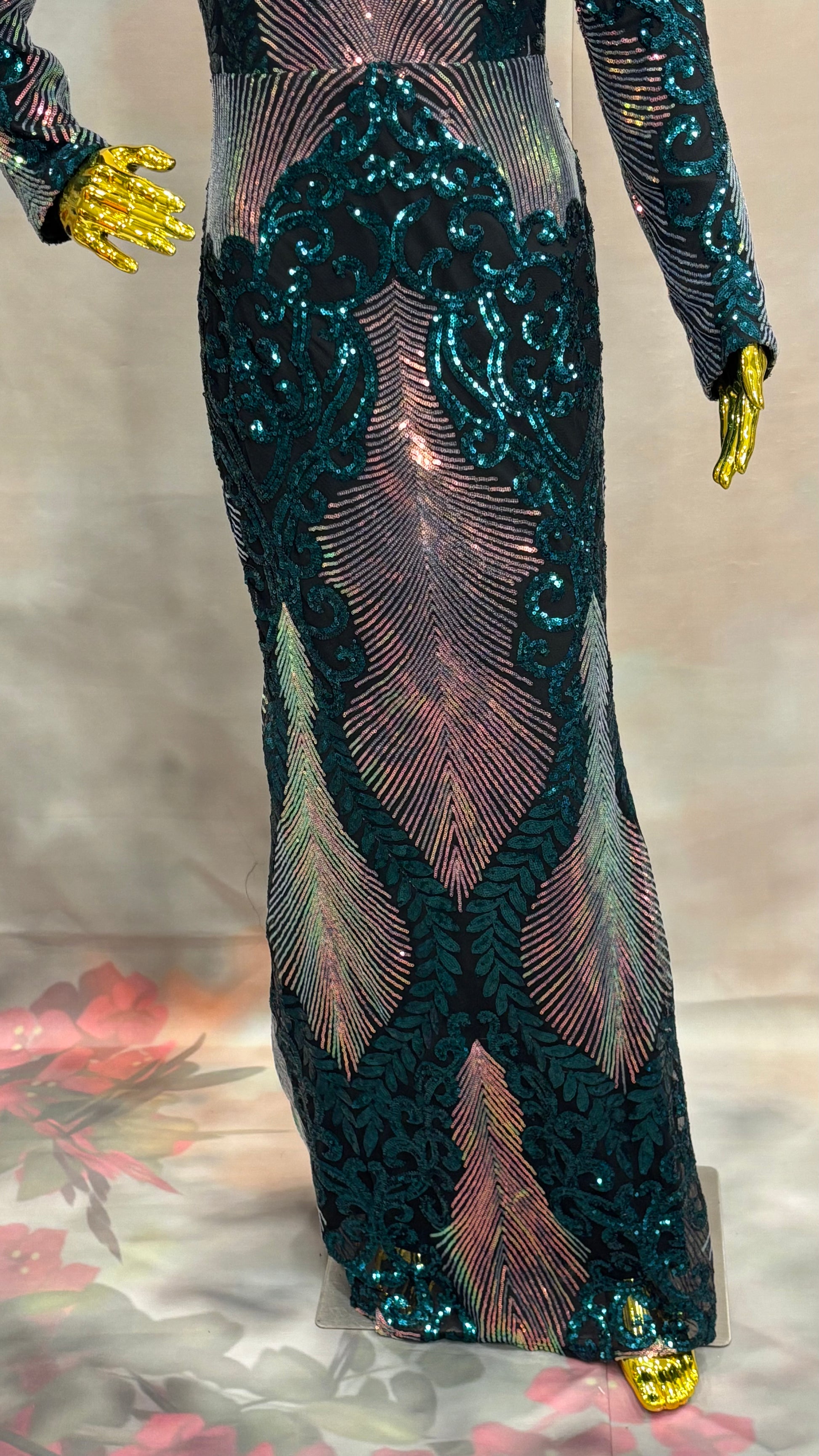 Mystic Mirage – Teal Sequin Feather Motif Gown