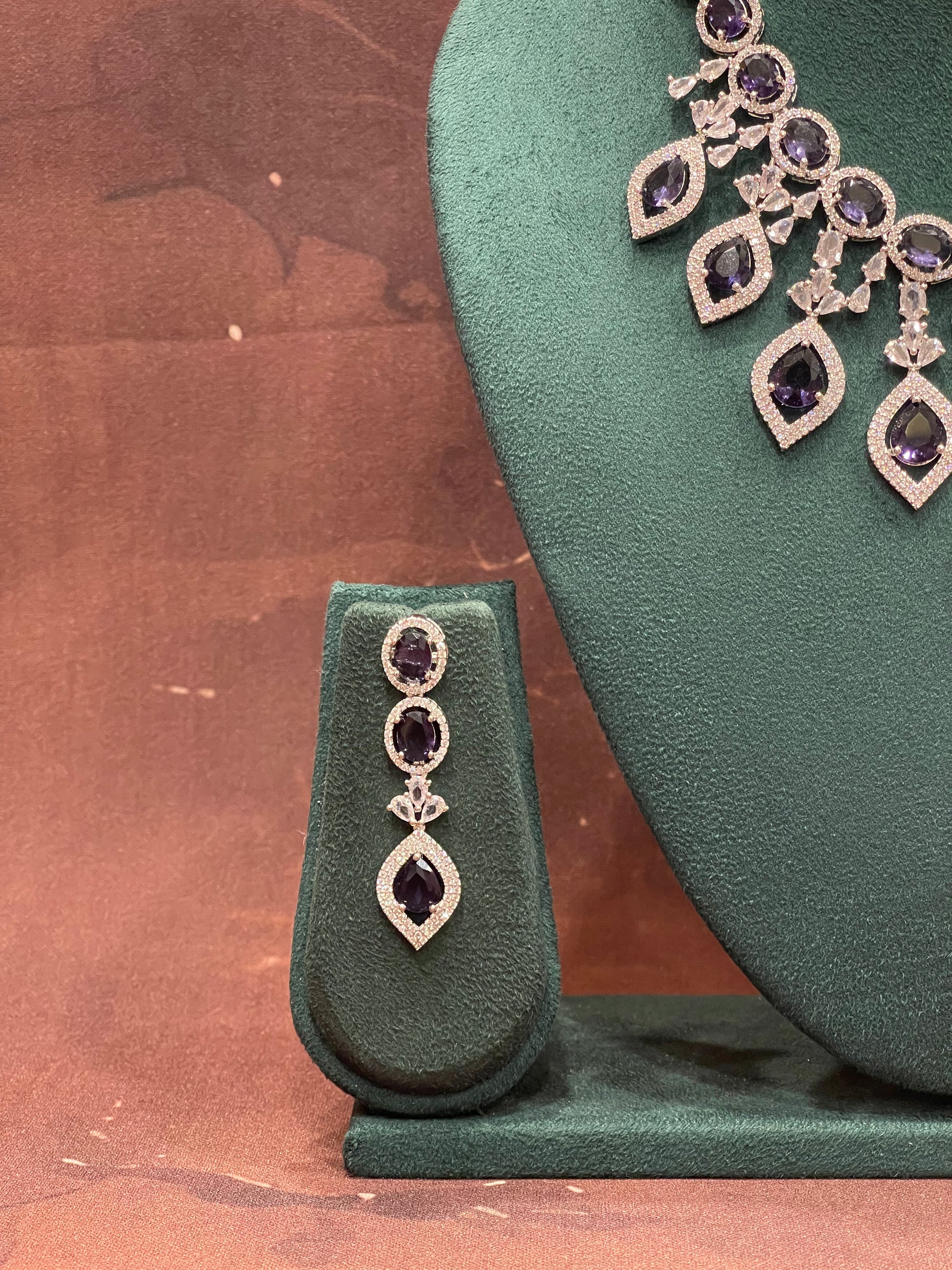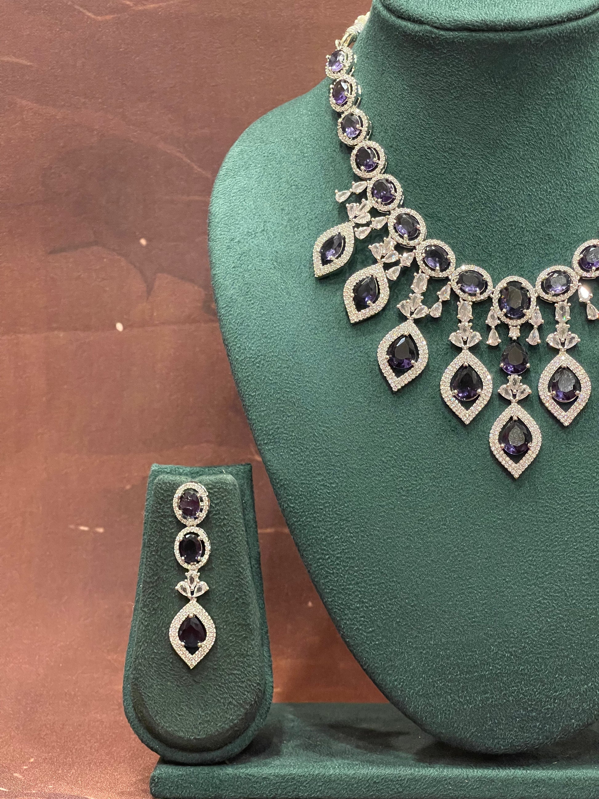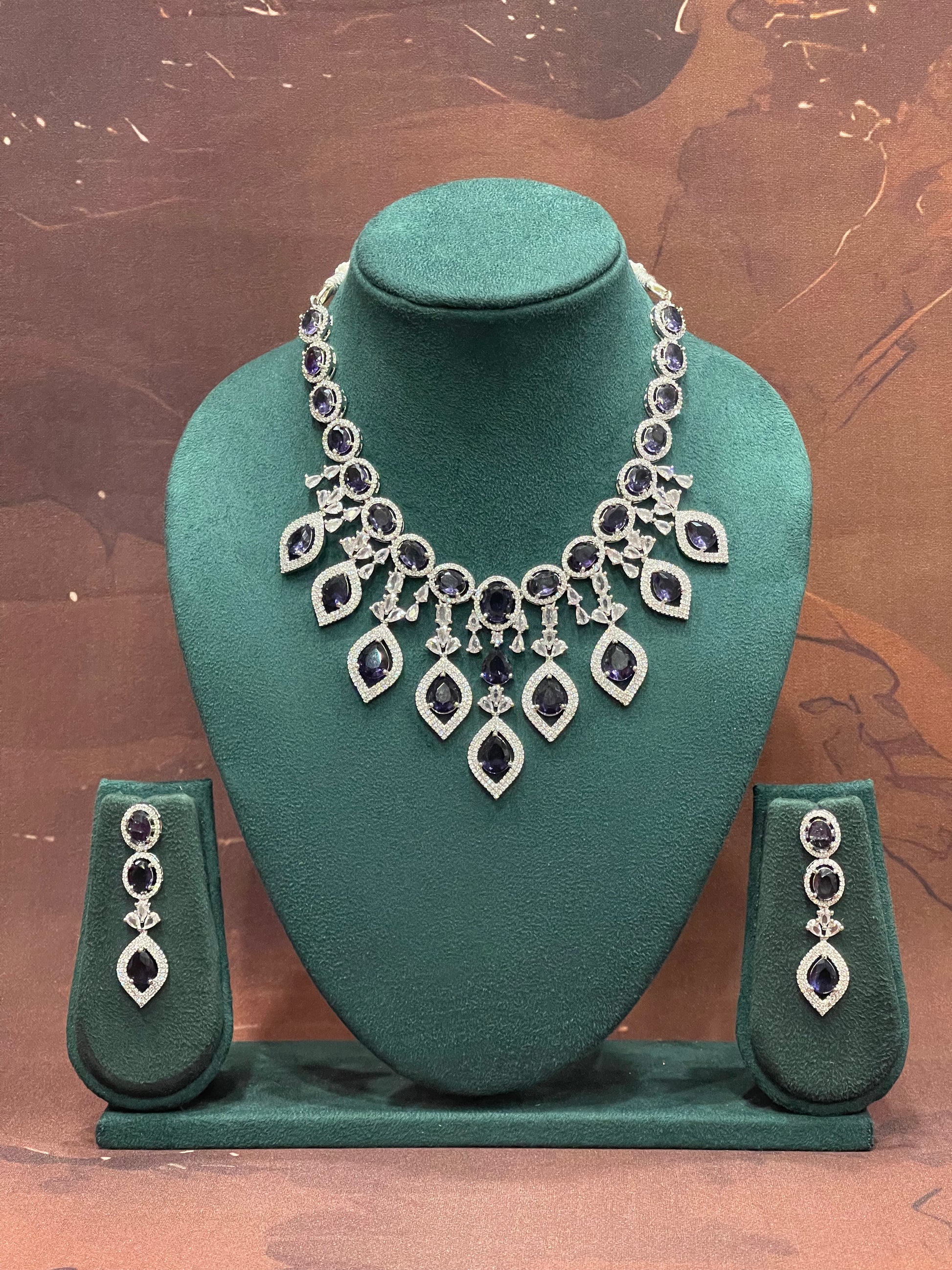 Midnight blue crystal drop necklace with diamond-style detailing and matching earrings.