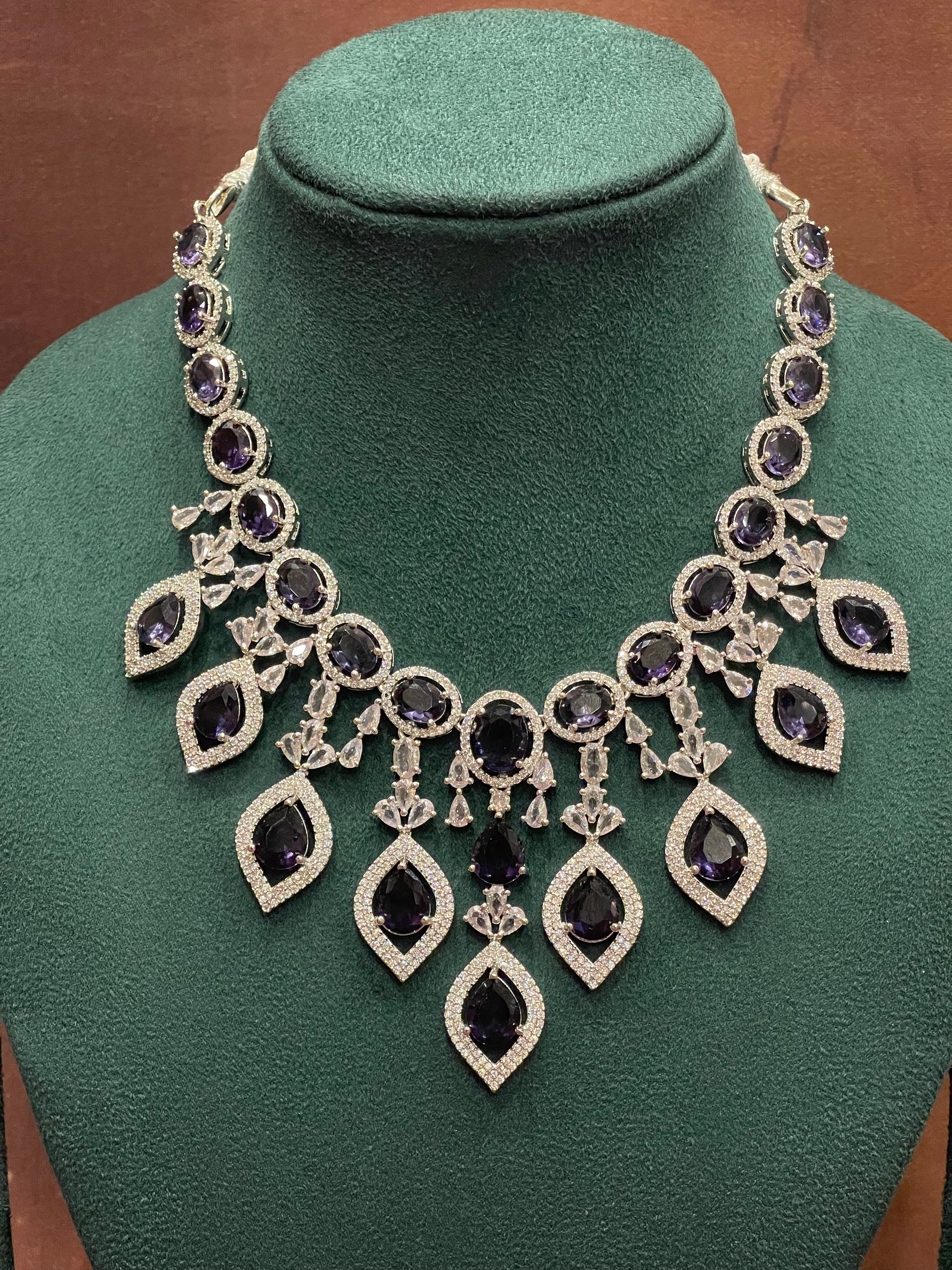 Rent the Midnight Blue Crystal Drop Necklace Set at FZO, Jubilee Hills. This stunning necklace showcases deep blue marquise-cut stones in diamond-style frames, arranged in a cascading drop design with intricate detailing, paired with elegant drop earrings – ideal for receptions, evening events, and cocktail parties.
