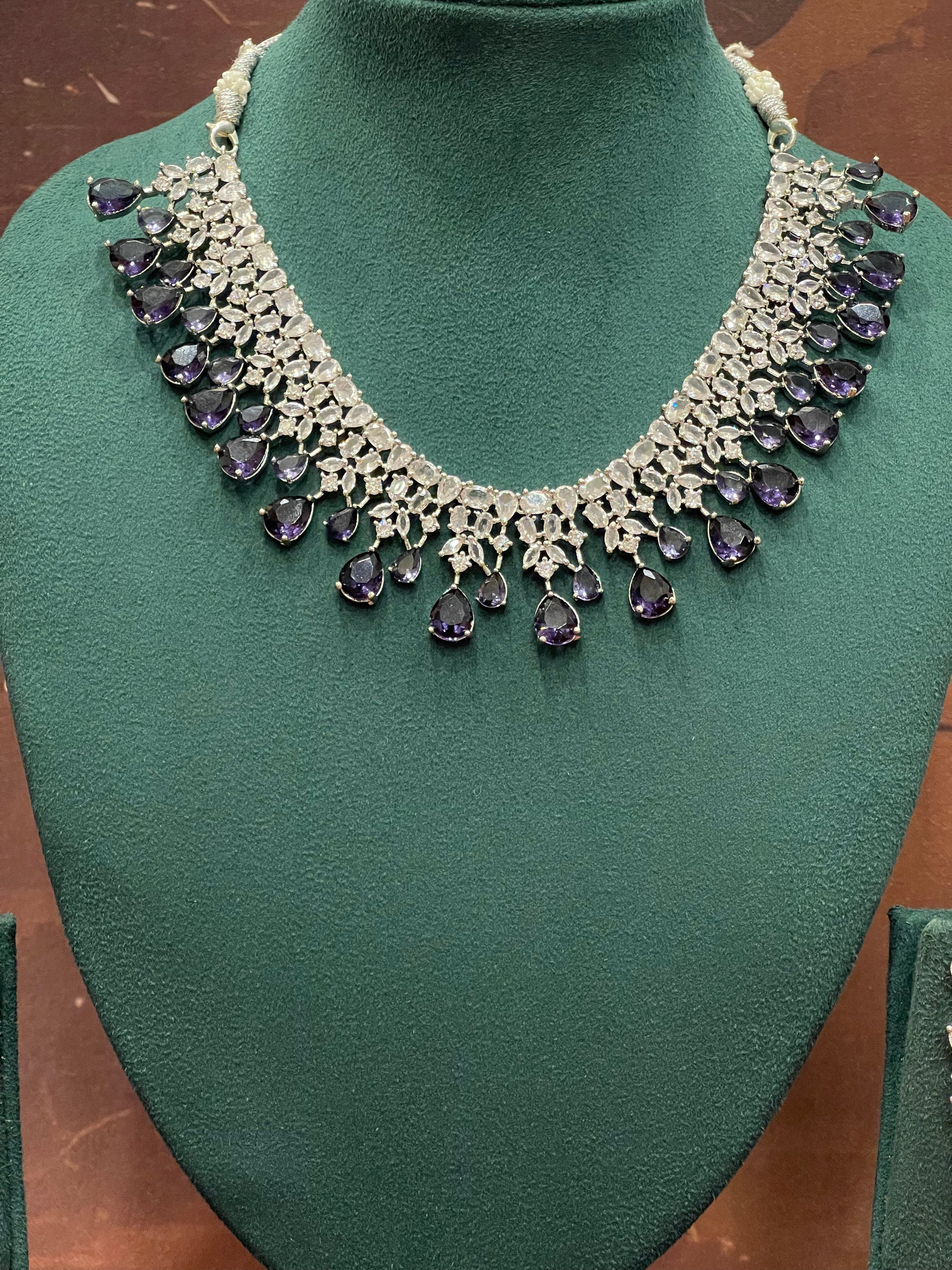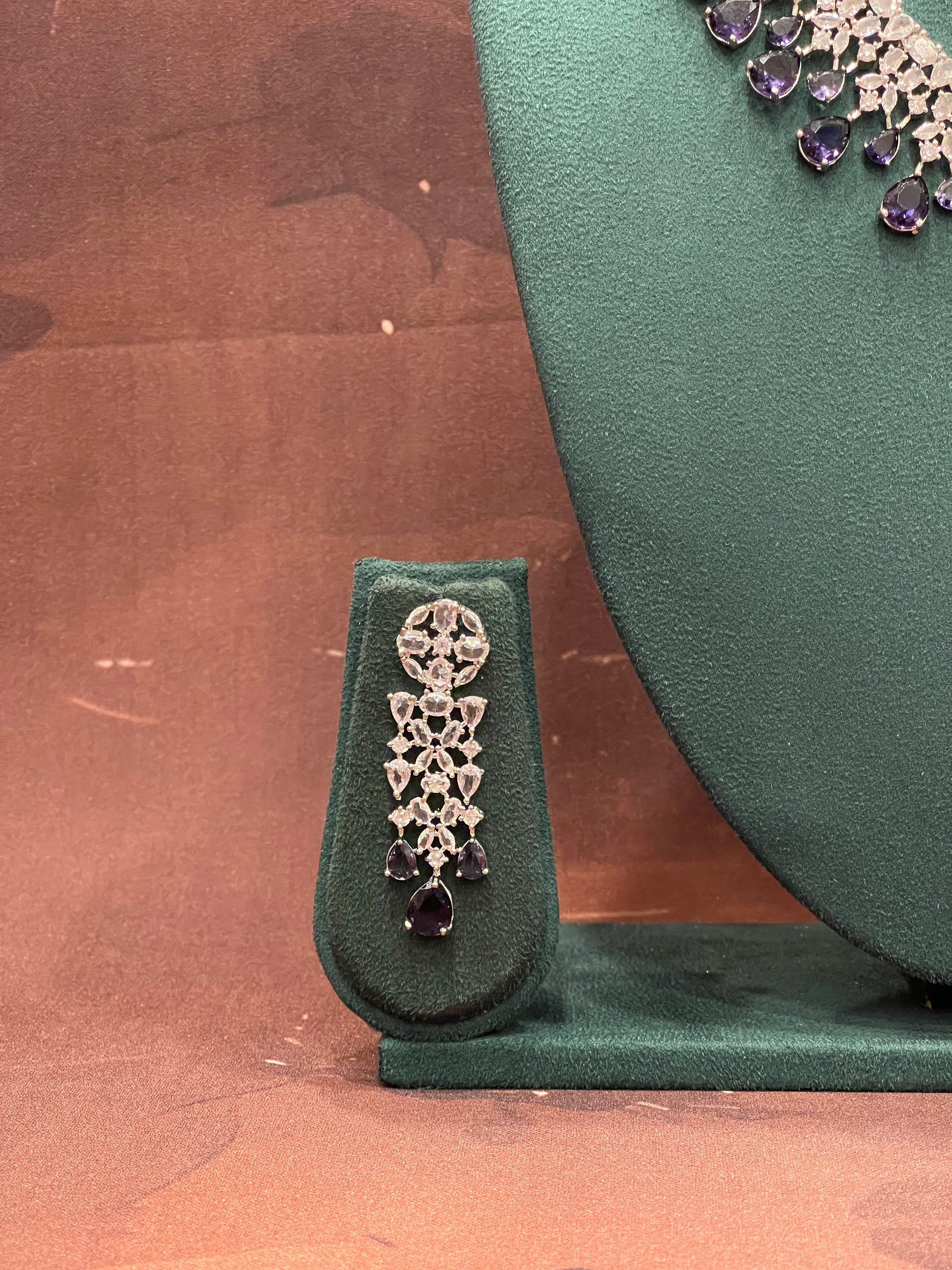 Diamond-studded silver necklace with cascading violet crystal drops, paired with matching long earrings.
