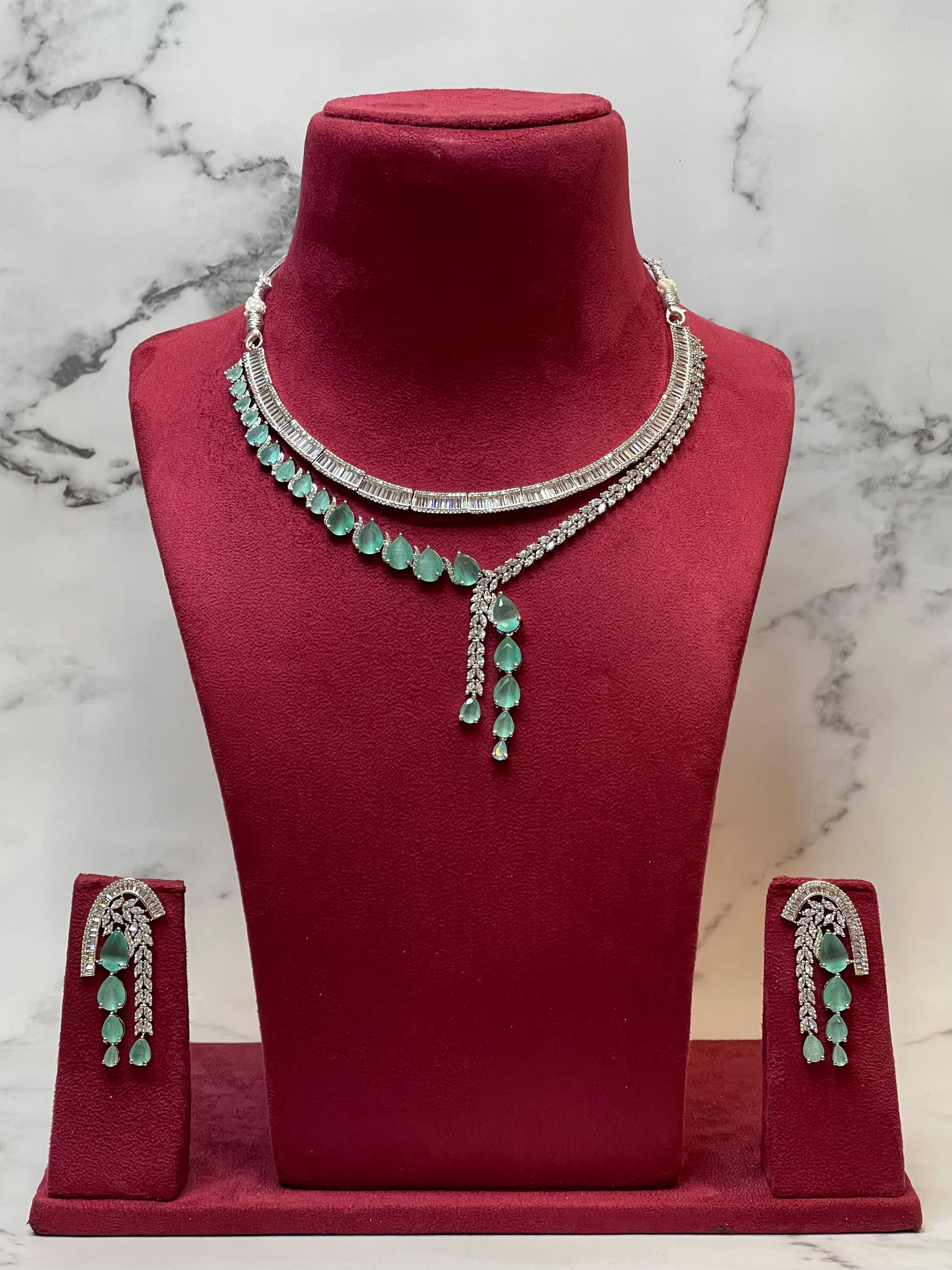 Mint Cascade – Layered CZ Necklace Set with Dangling Drops