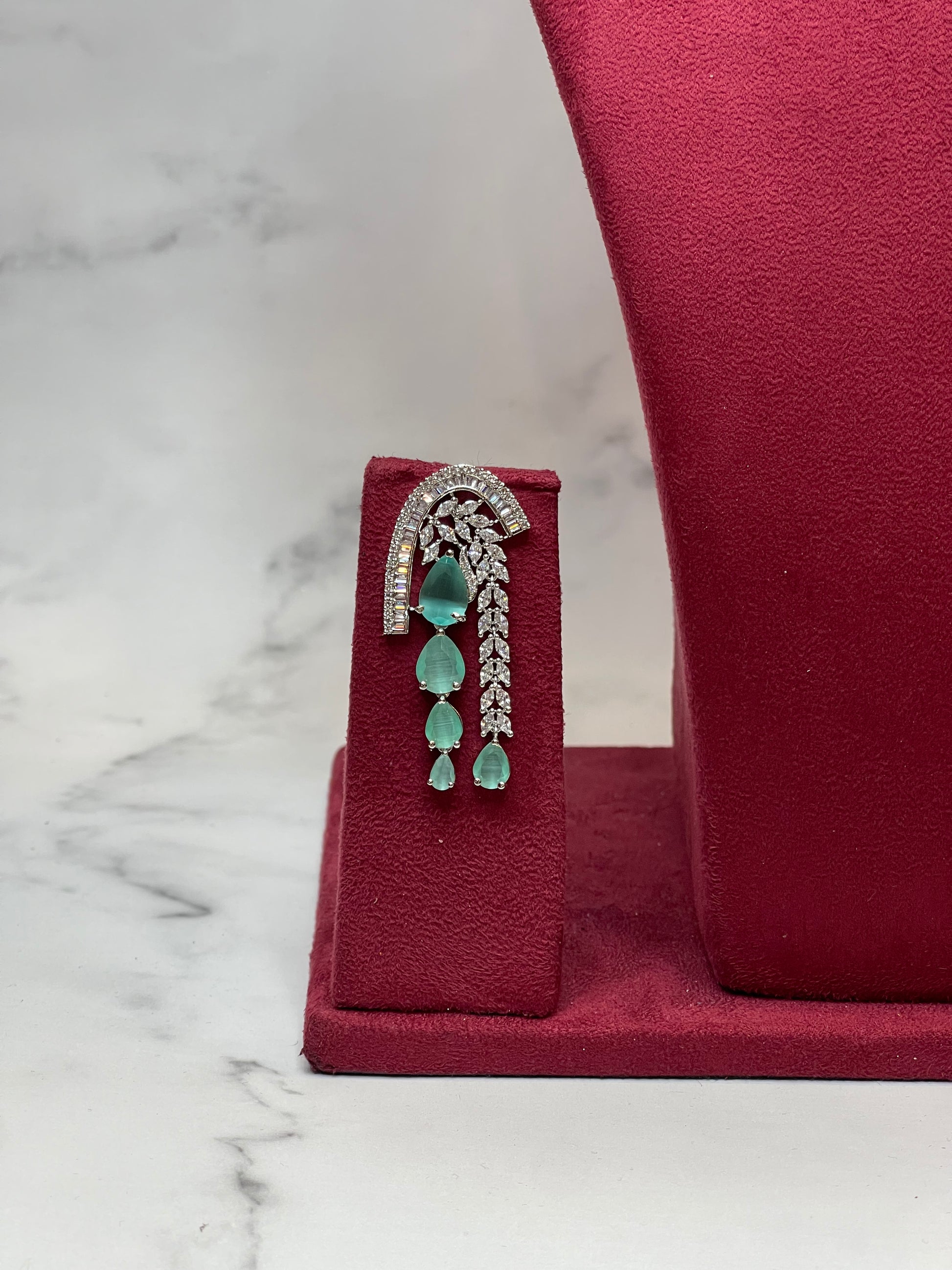 Make a bold entrance with our Mint Cascade Statement Set, now available for rent at FZO, Jubilee Hills, Hyderabad. This avant-garde piece combines sleek silver baguette stones with cascading mint green drops, offering a perfect blend of freshness and edge for cocktail nights and fashion-forward bridal events.