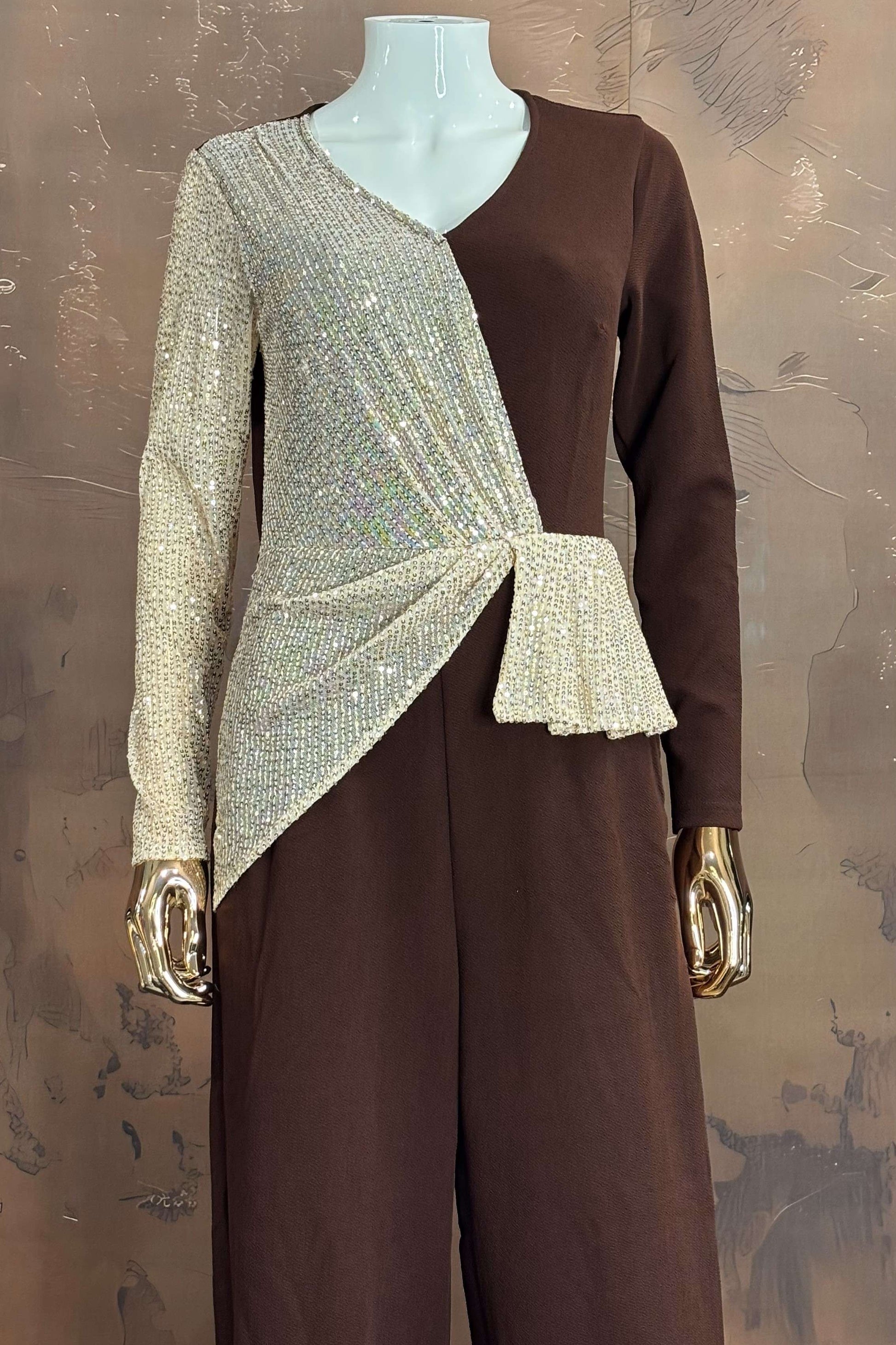 Elevate your evening look with this dual-tone designer jumpsuit featuring a rich mocha base and shimmering silver sequin drape. A perfect choice for cocktail nights, receptions, and upscale parties.