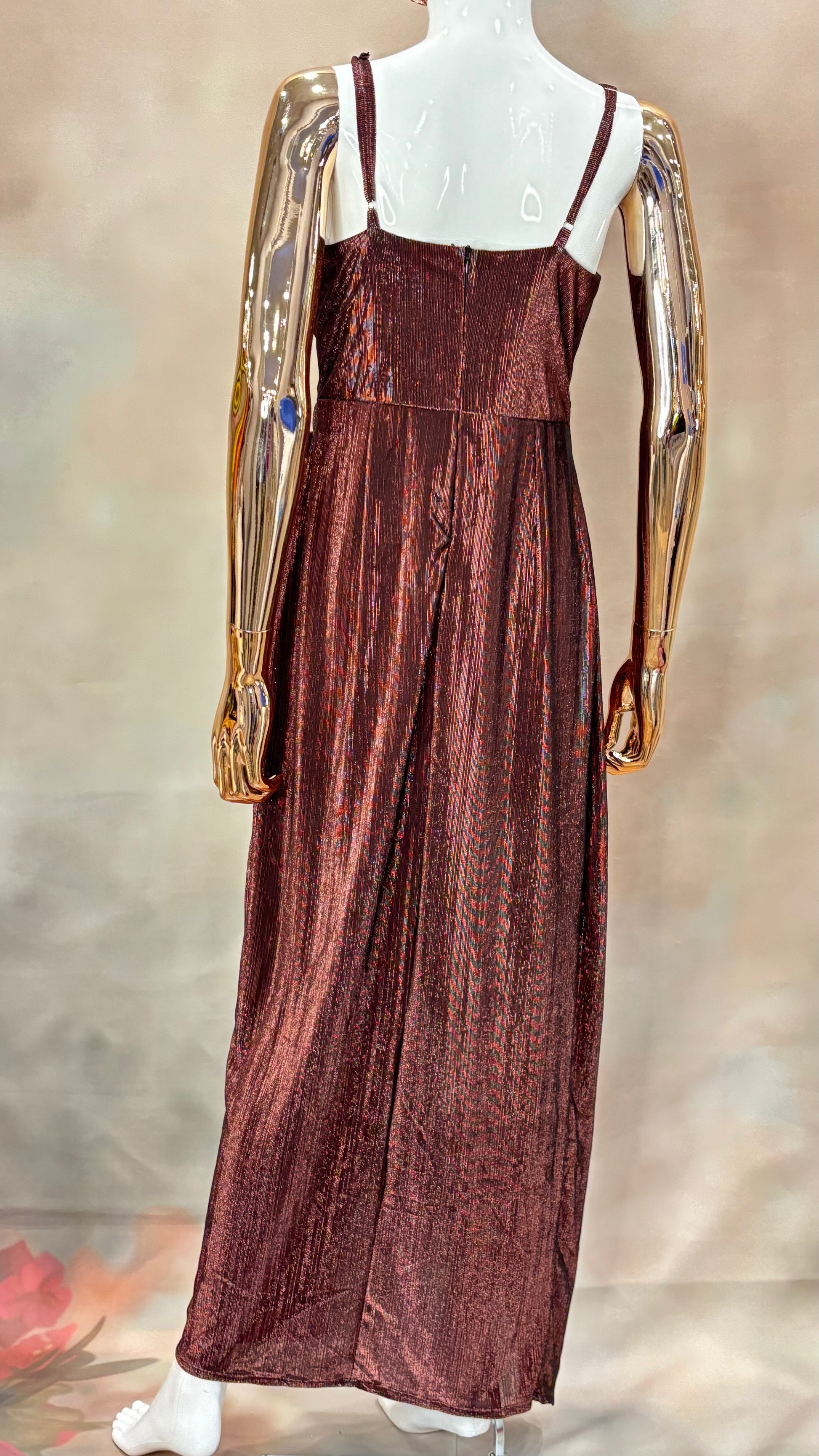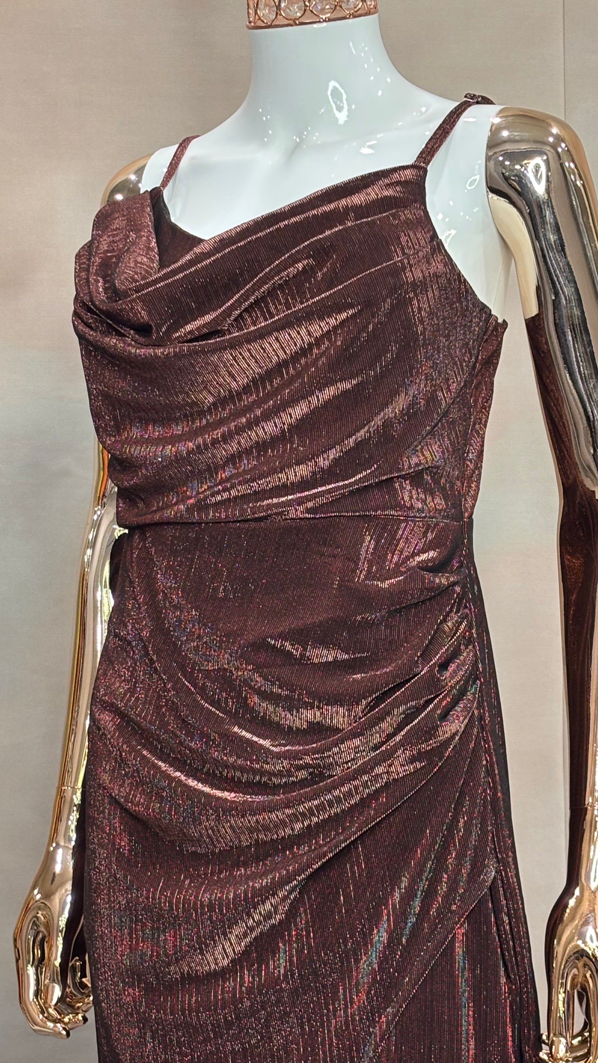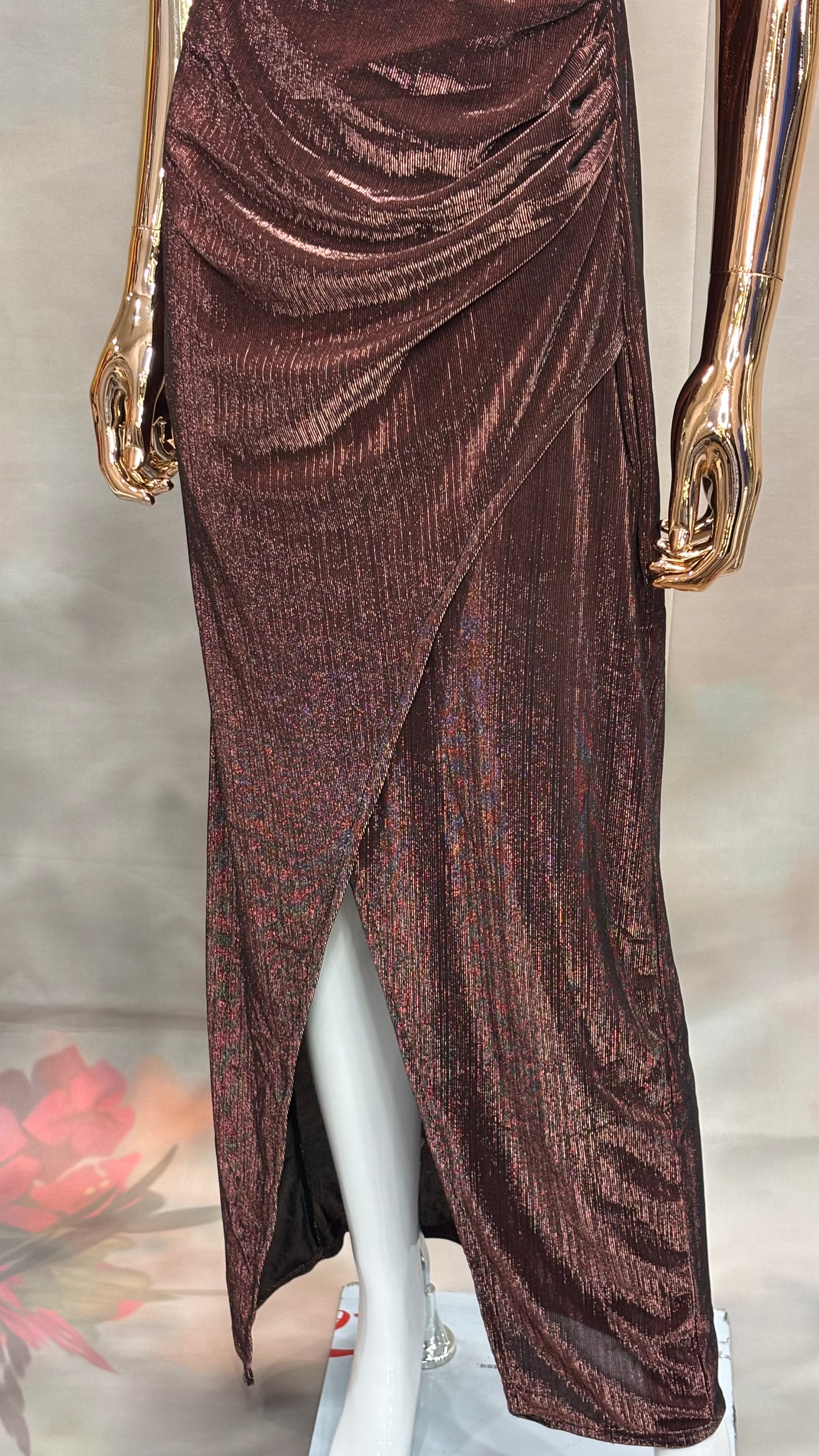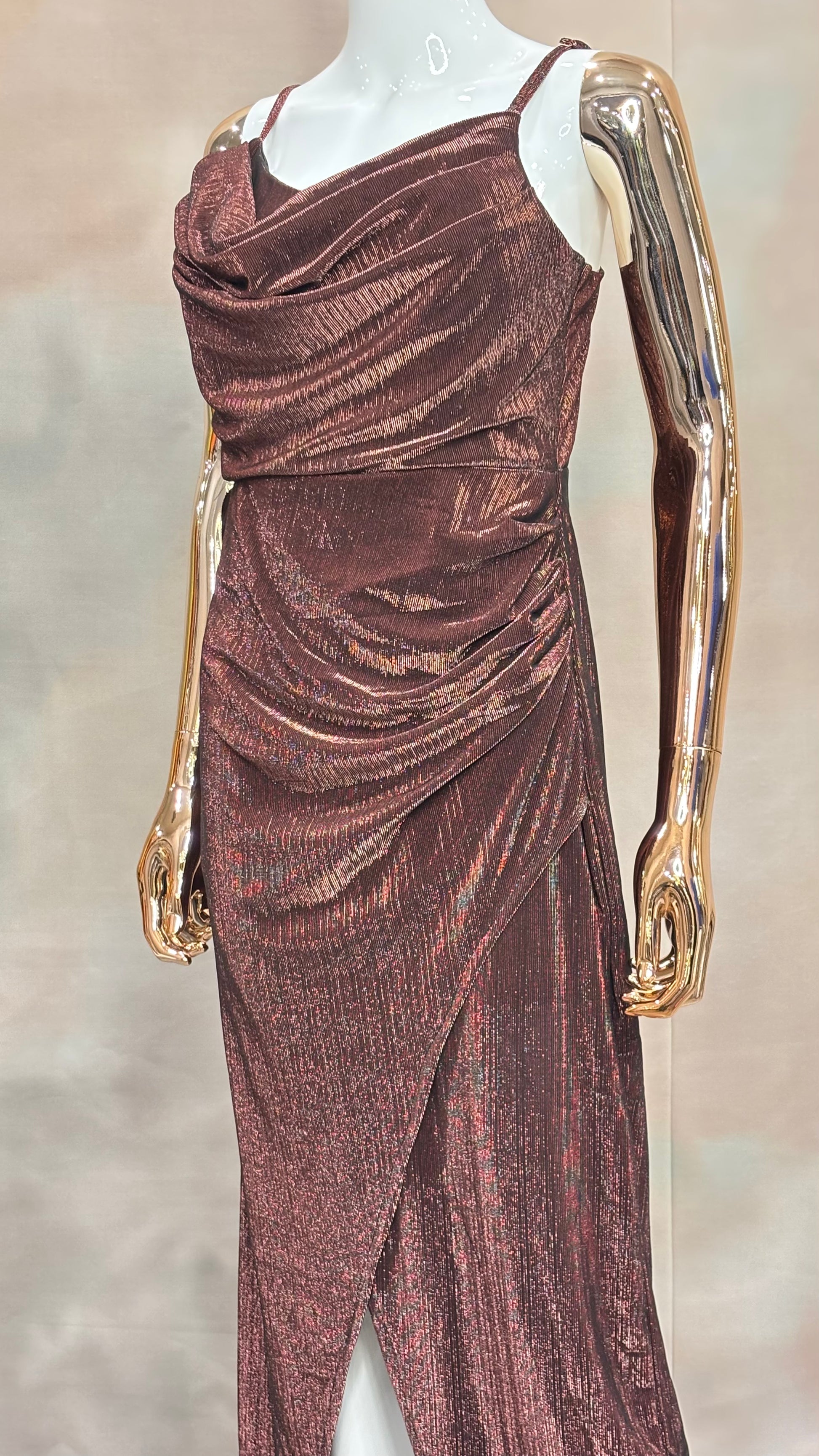 • Sleek & Shimmery: Metallic fabric with draped detailing and slit design