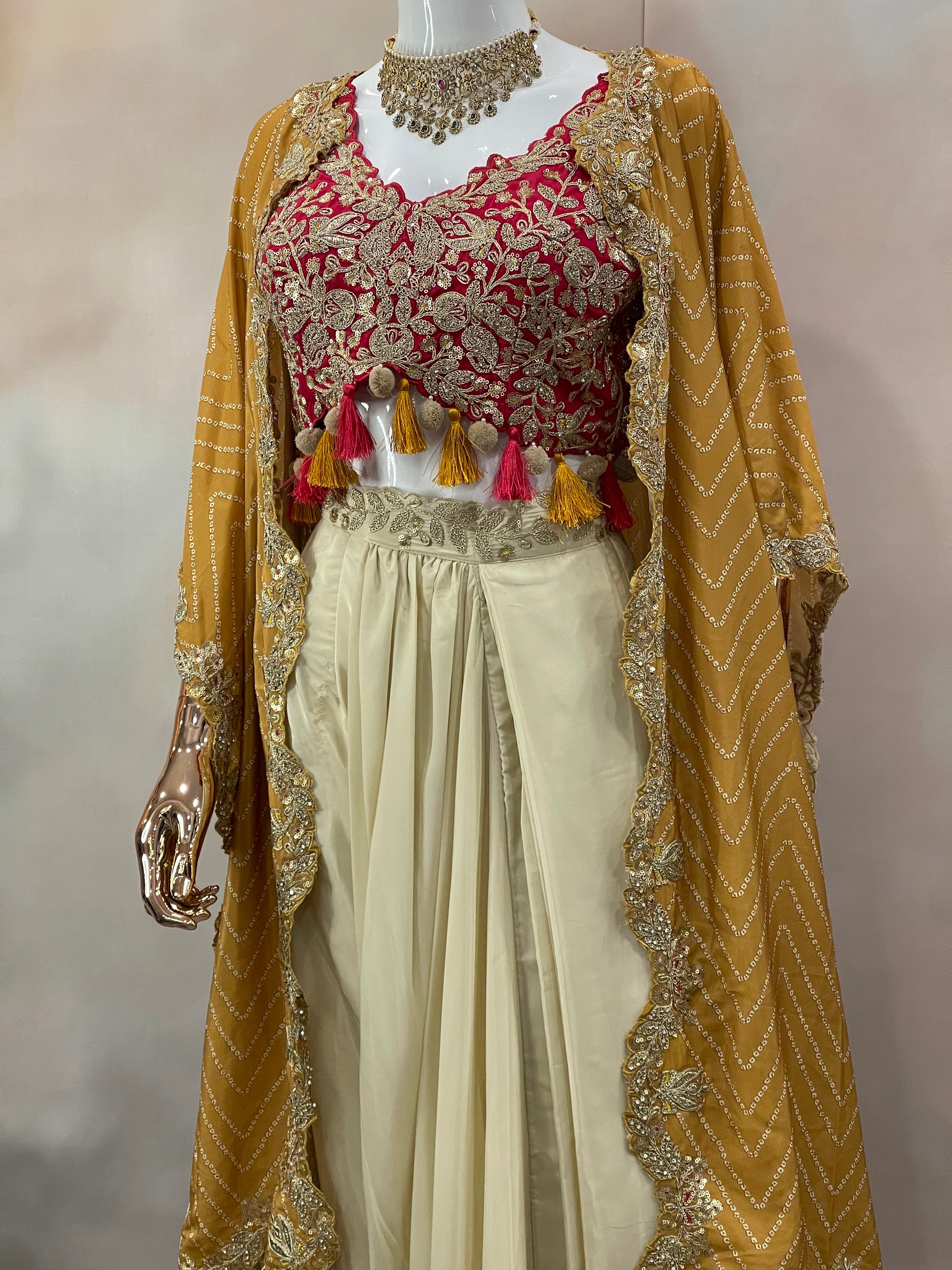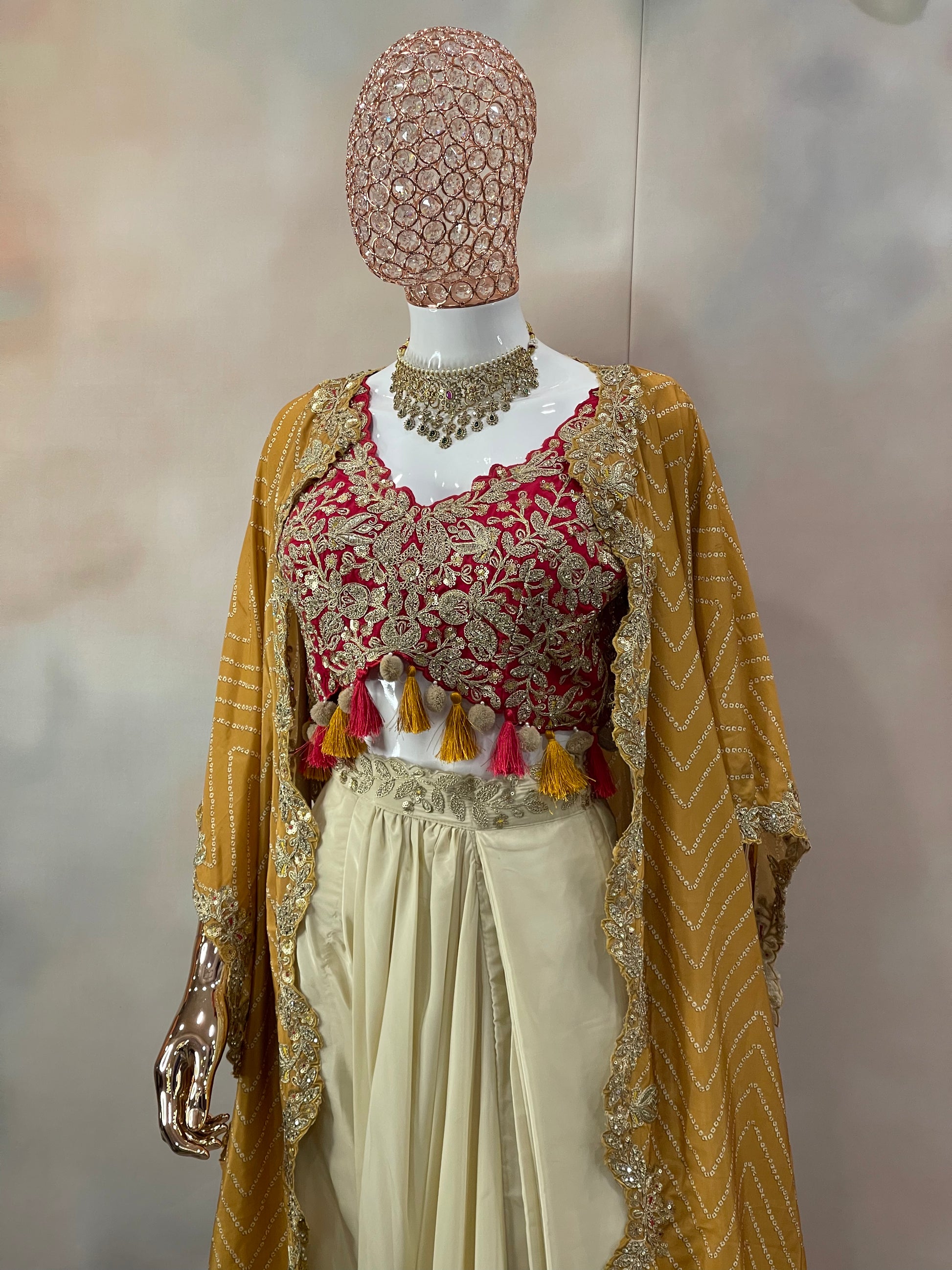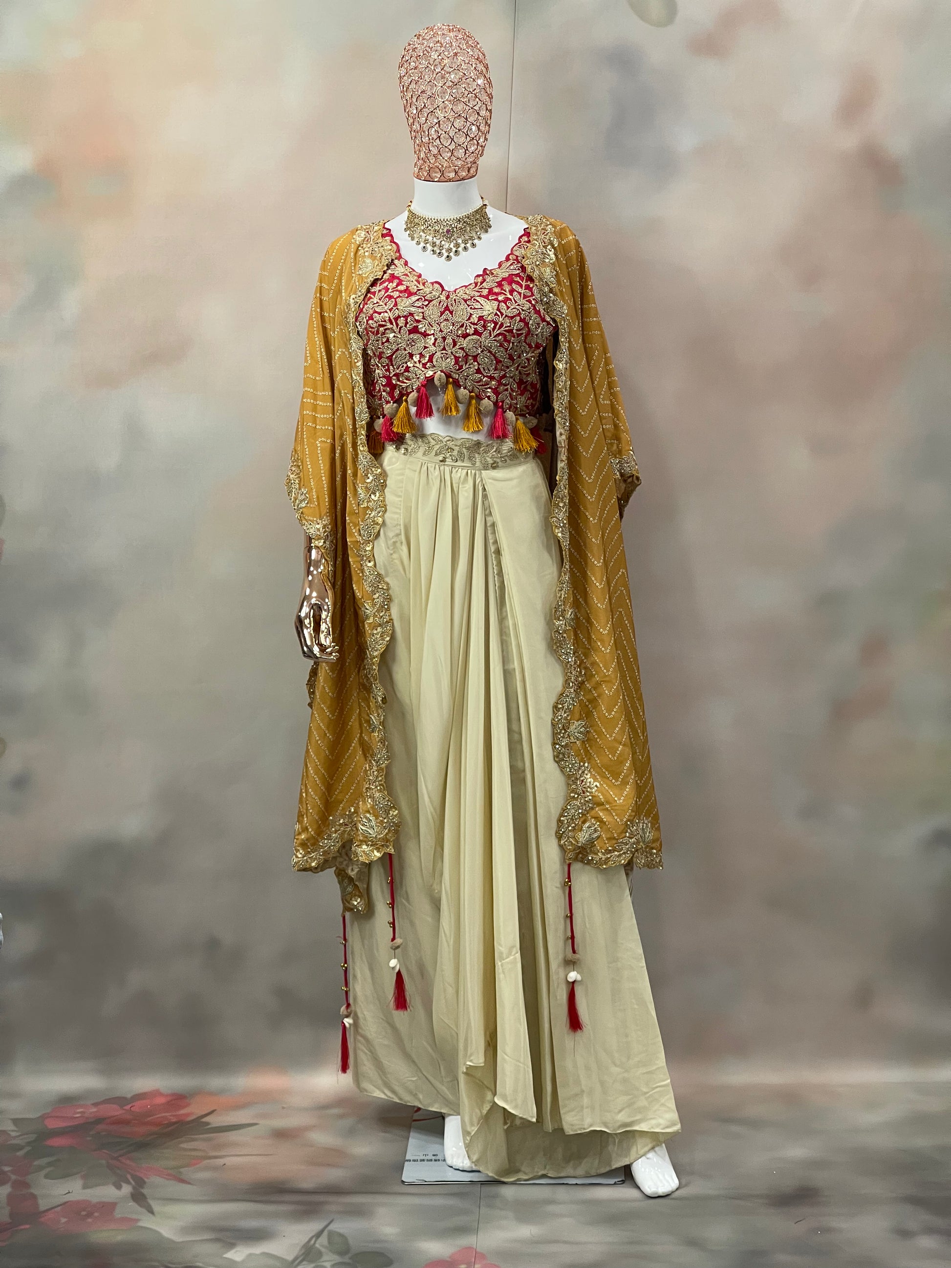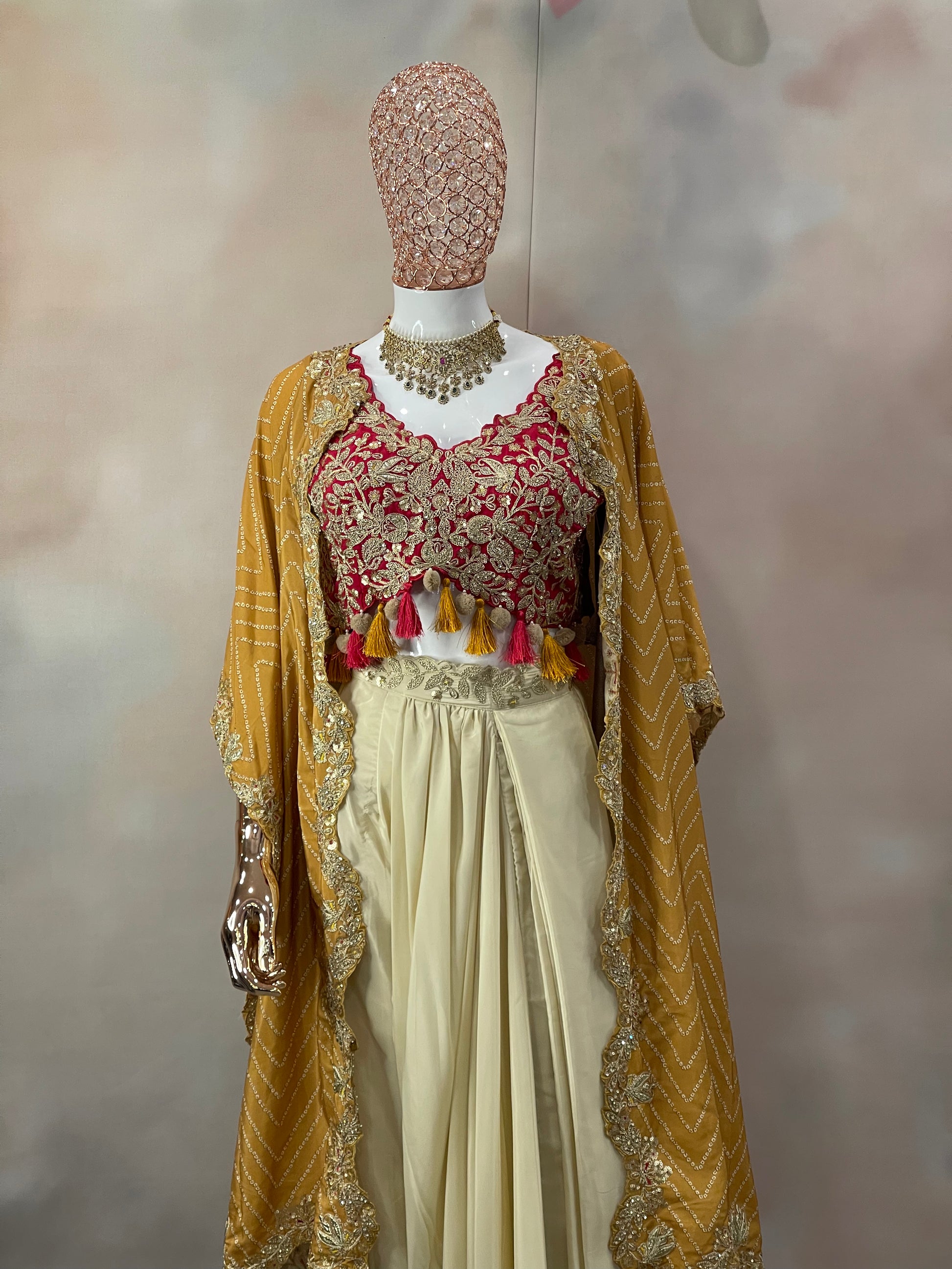 Mustard Charm – Pre-Draped Saree with Red Embroidered Blouse & Cape