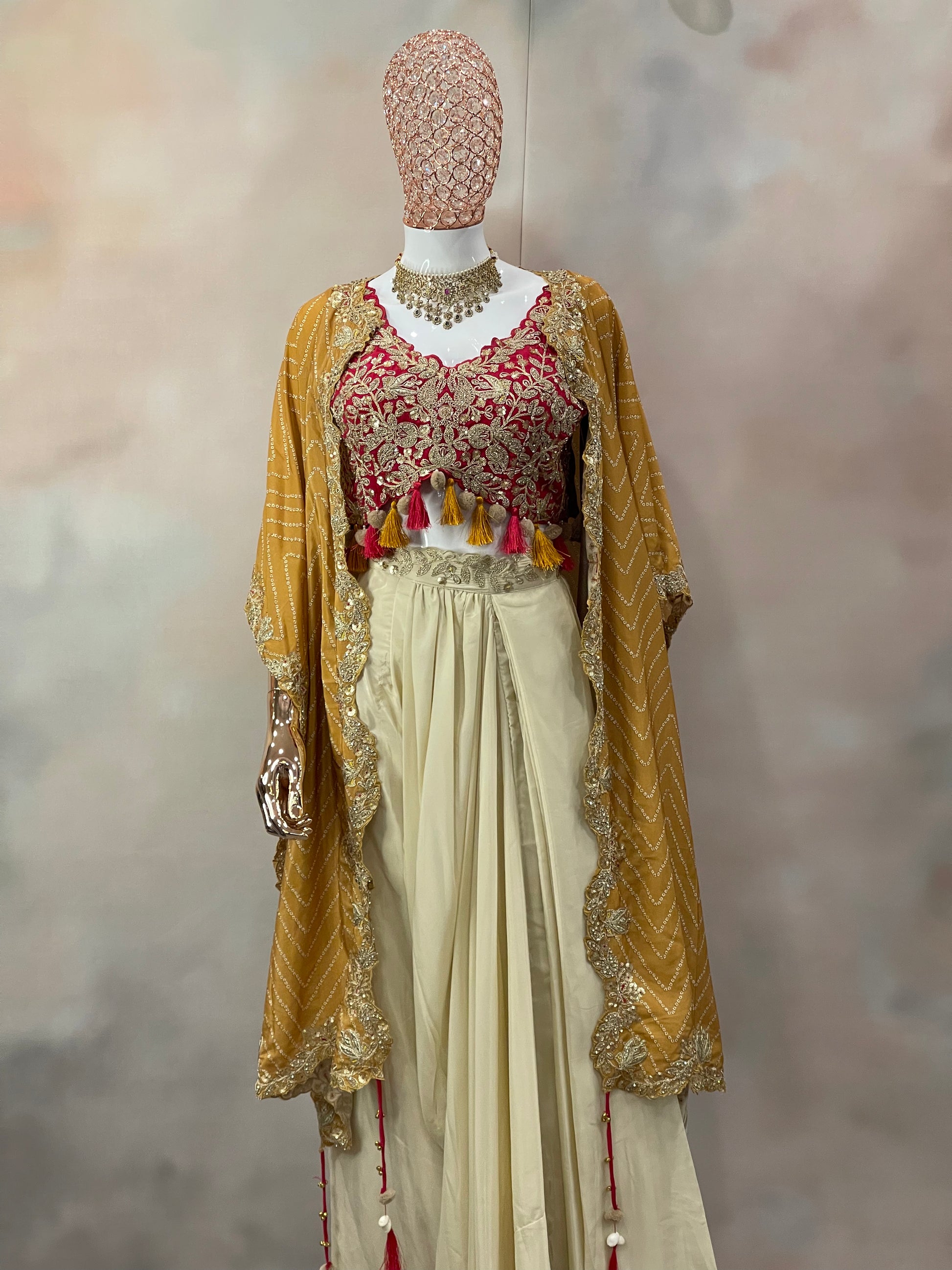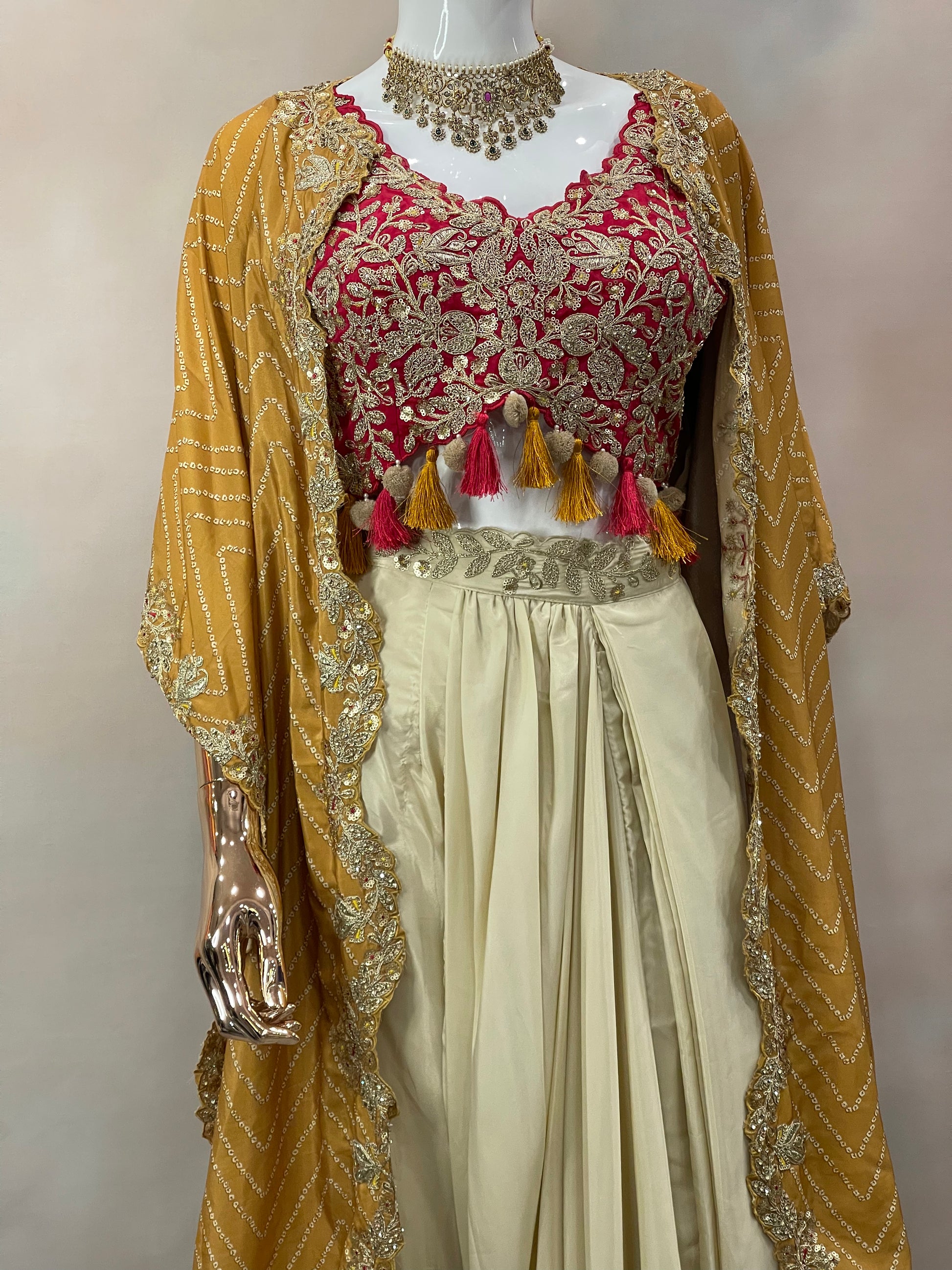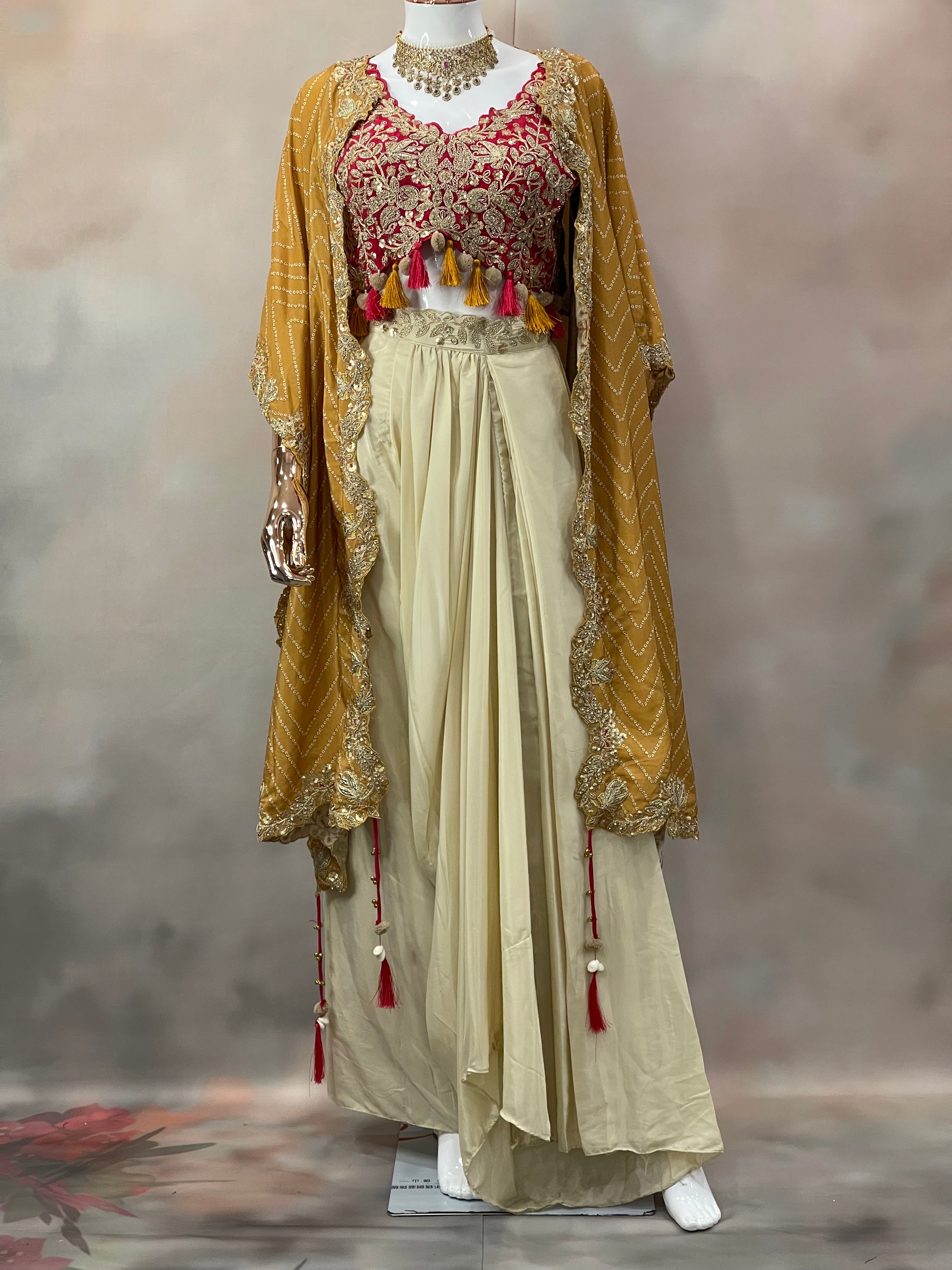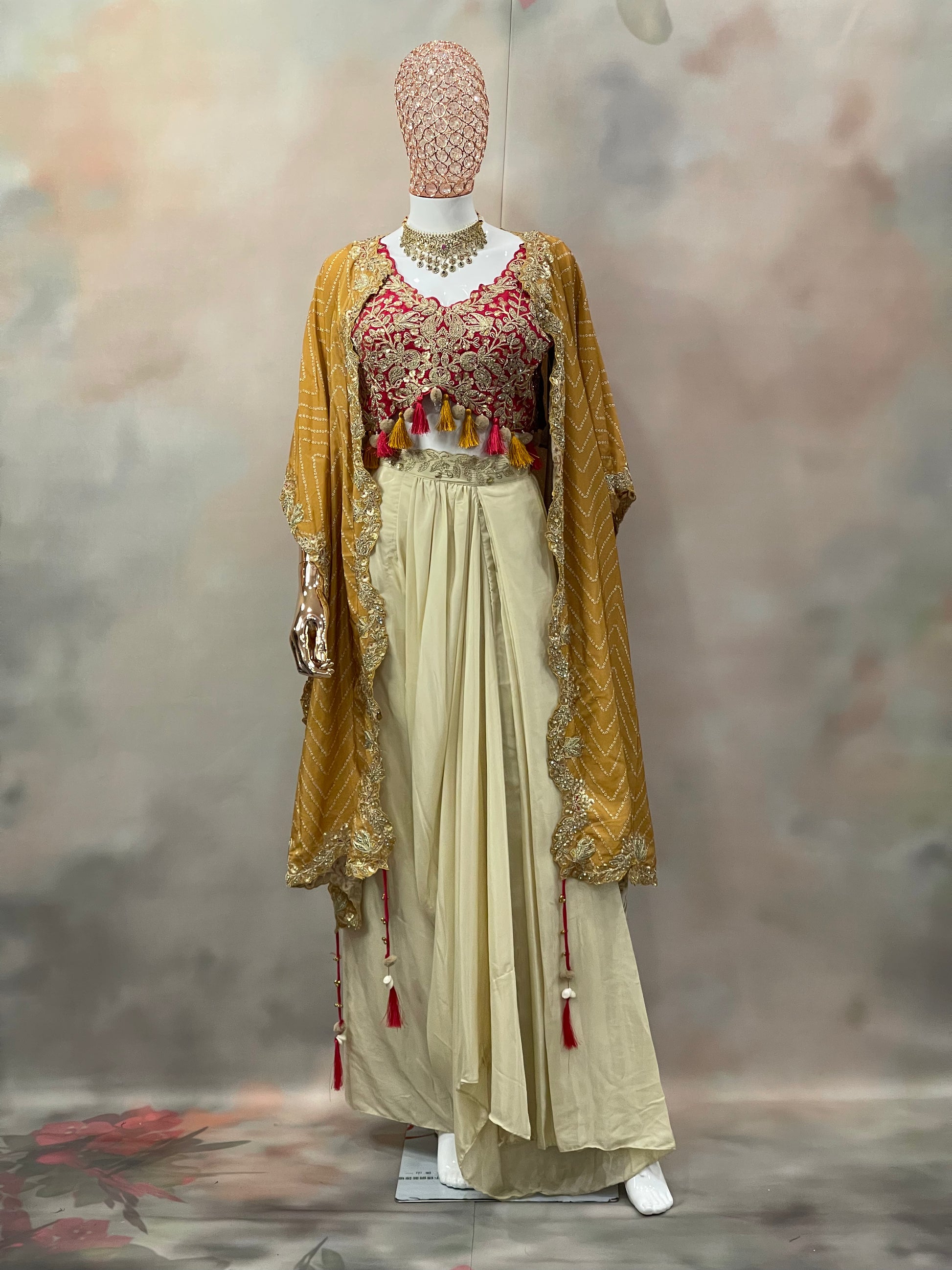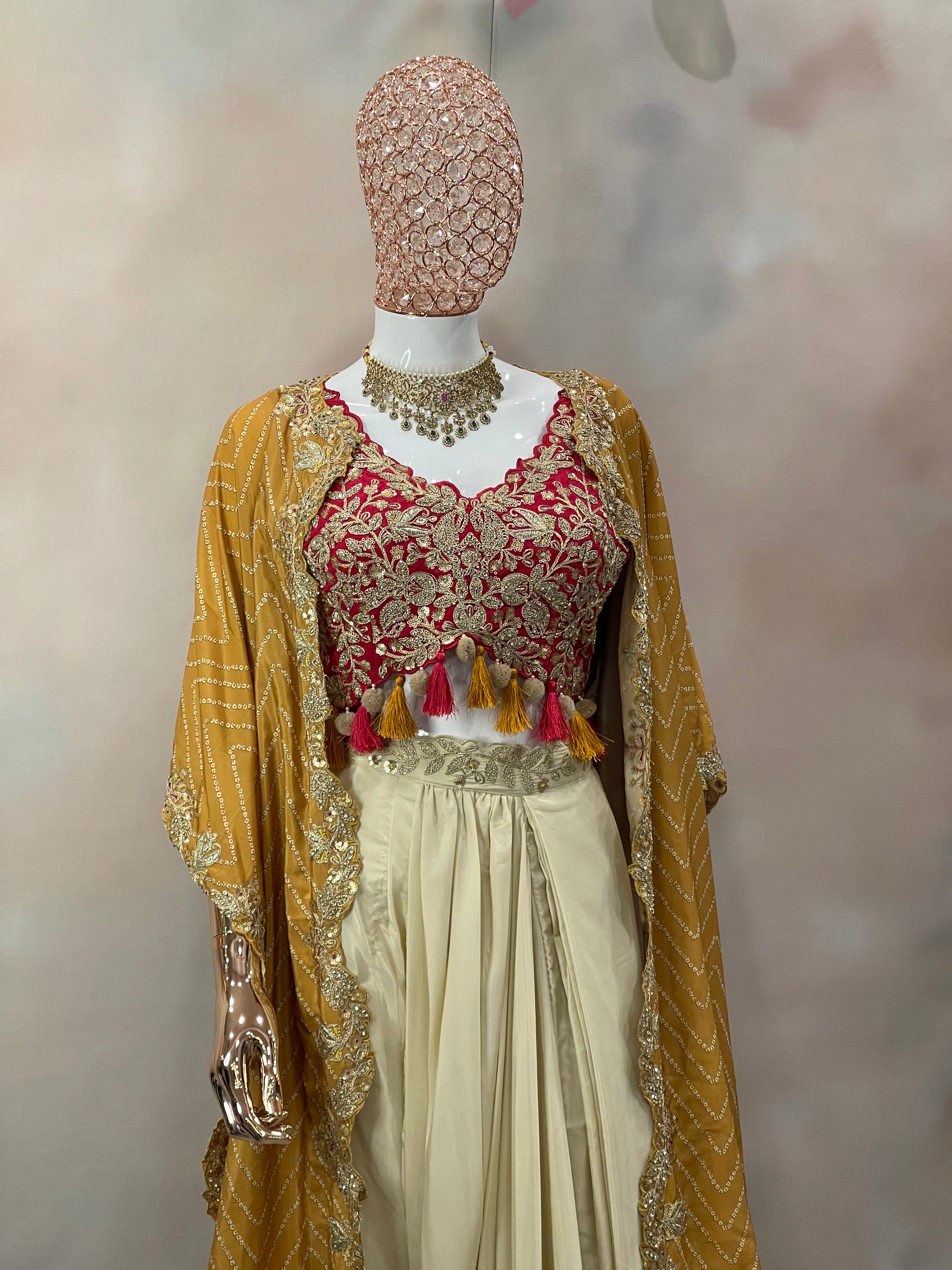Mustard Charm – Pre-Draped Saree with Red Embroidered Blouse & Cape