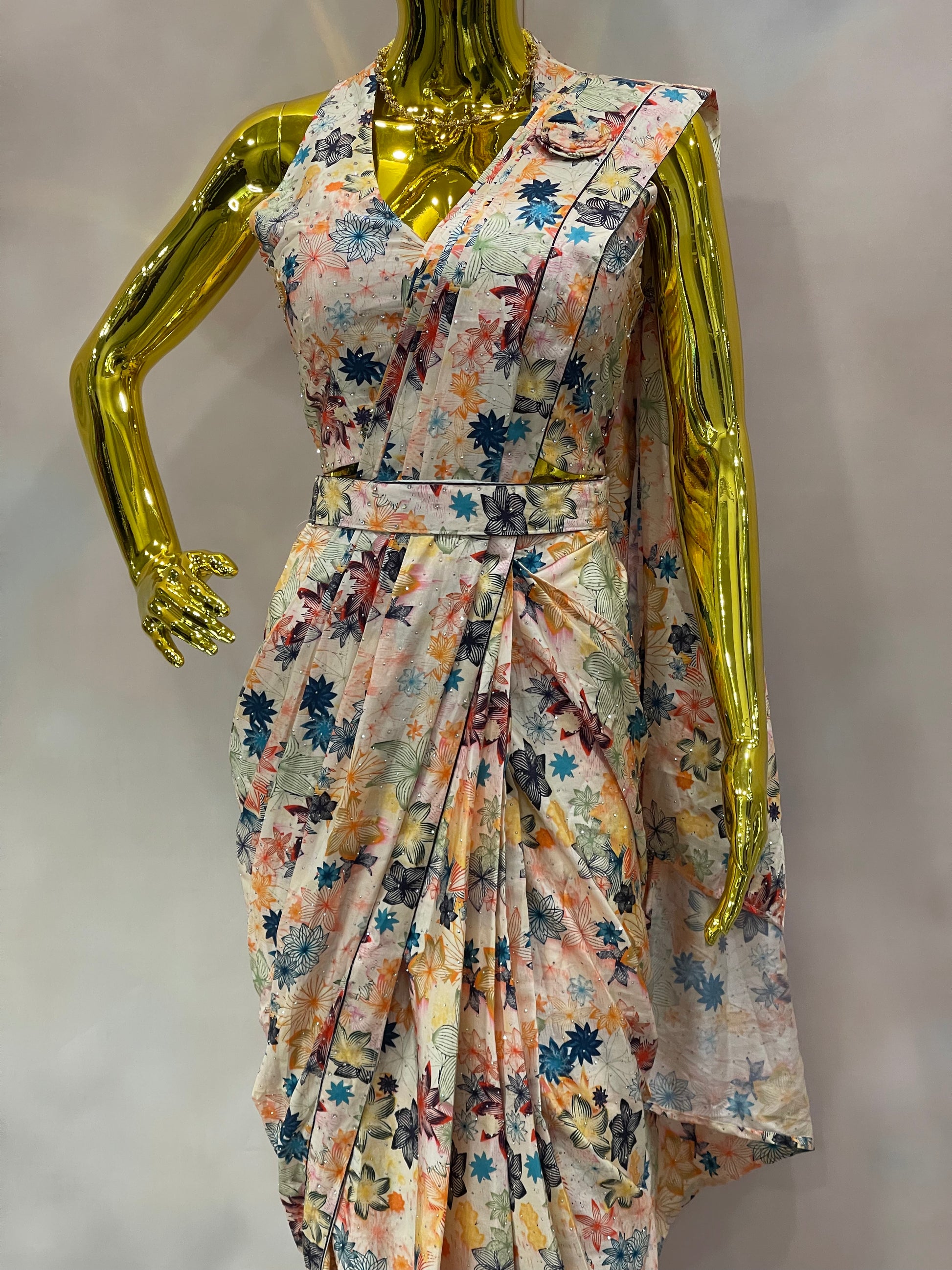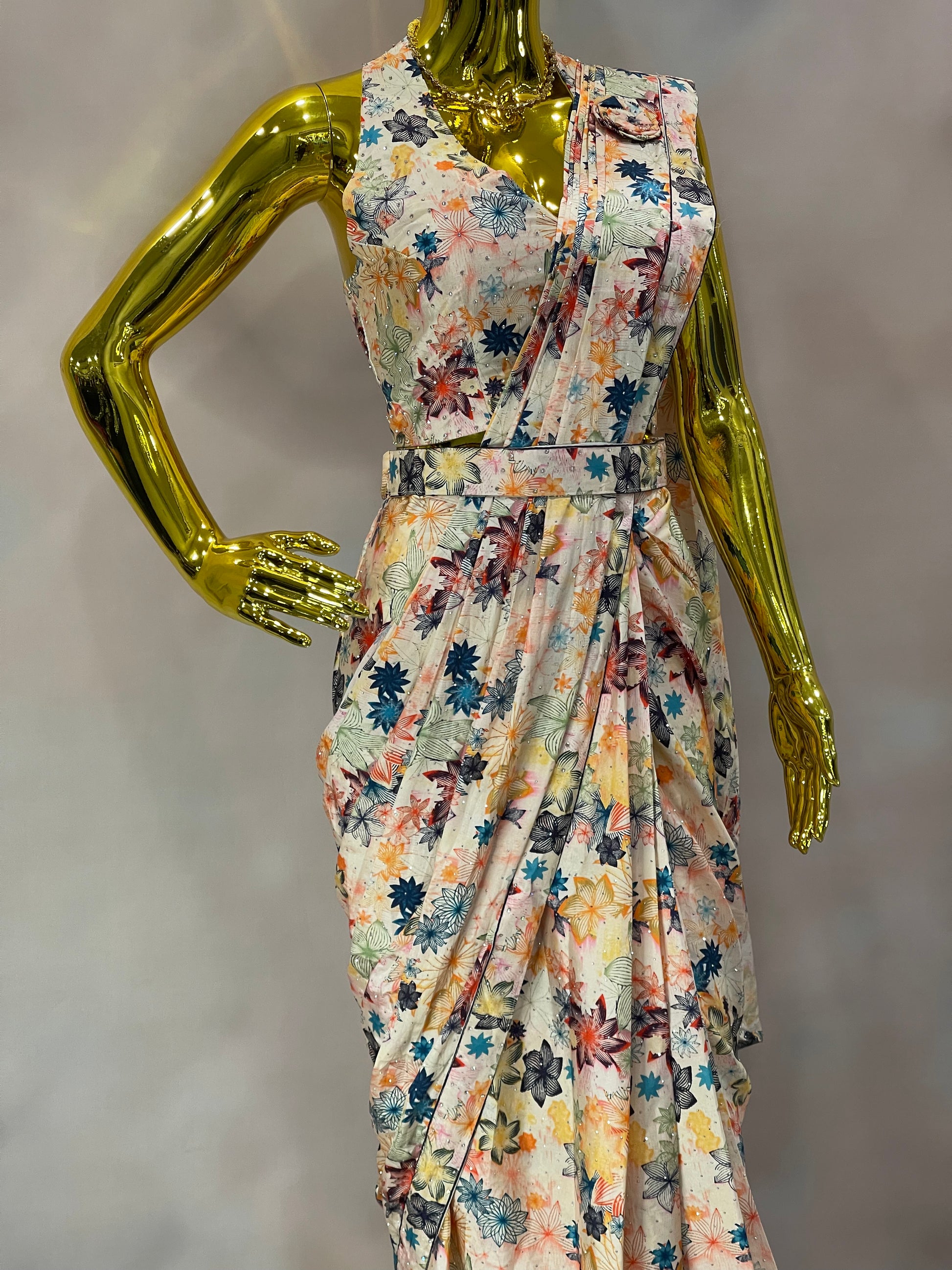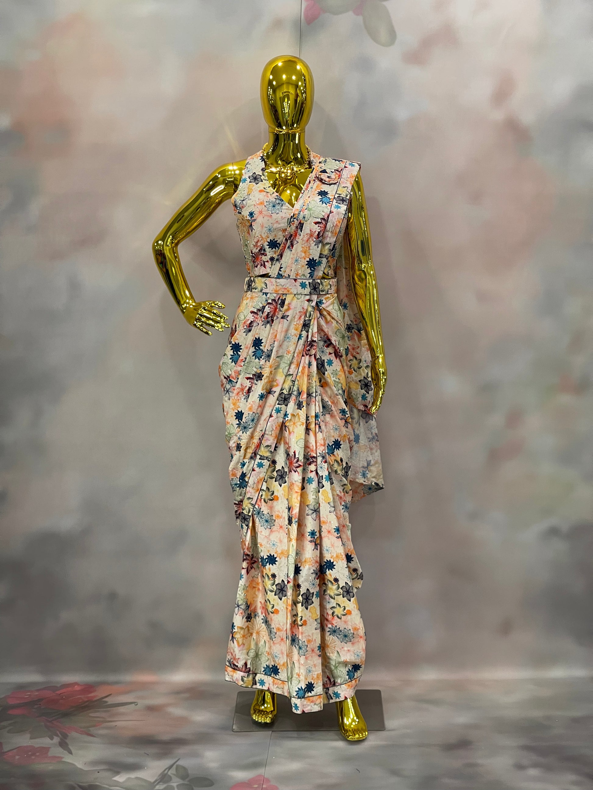 A breezy and elegant pastel floral saree crafted in soft fabric, styled with a contemporary pre-draped silhouette and matching blouse. Perfect for day events or light evening celebrations, this saree offers effortless charm with modern ease.
