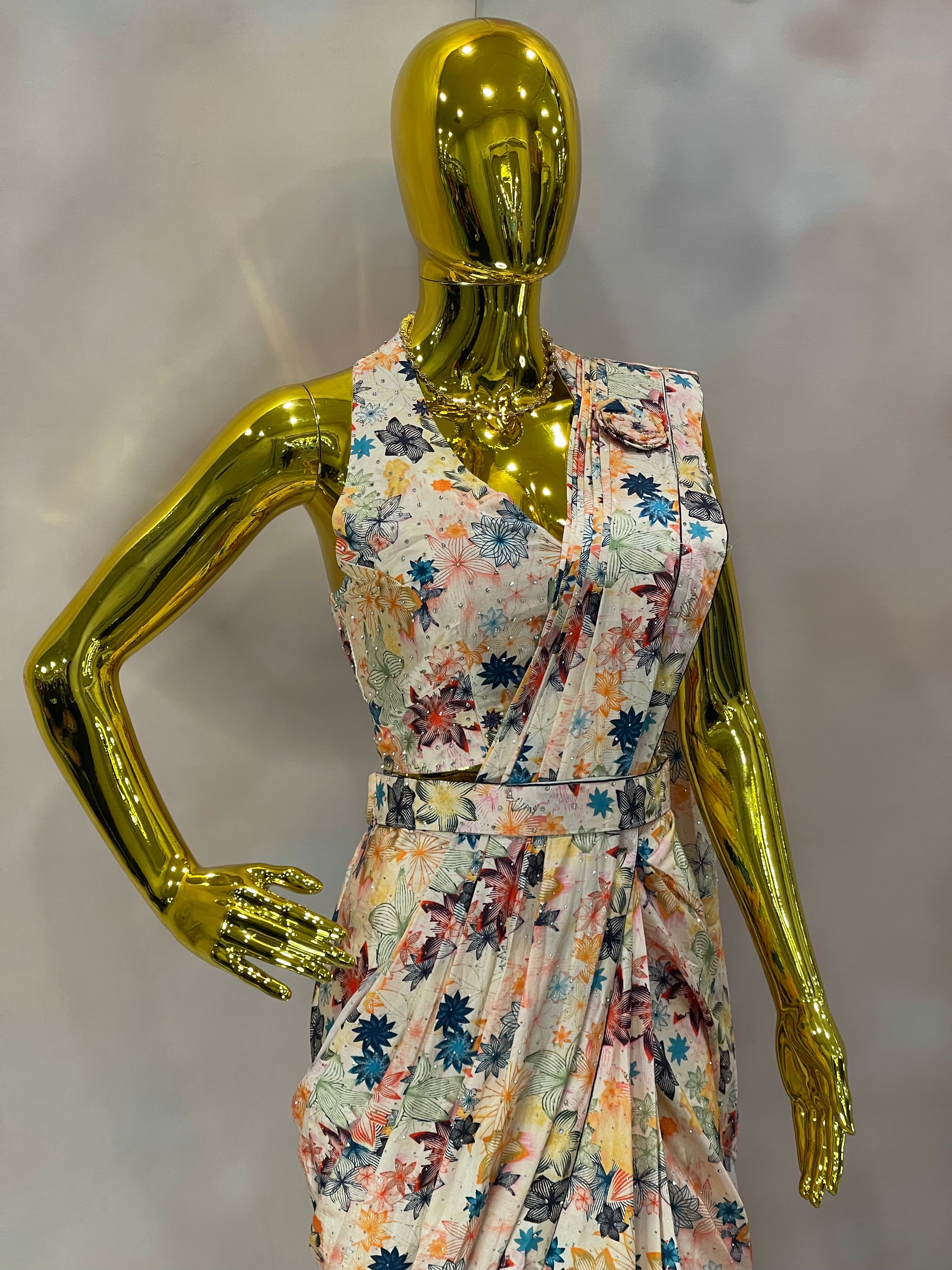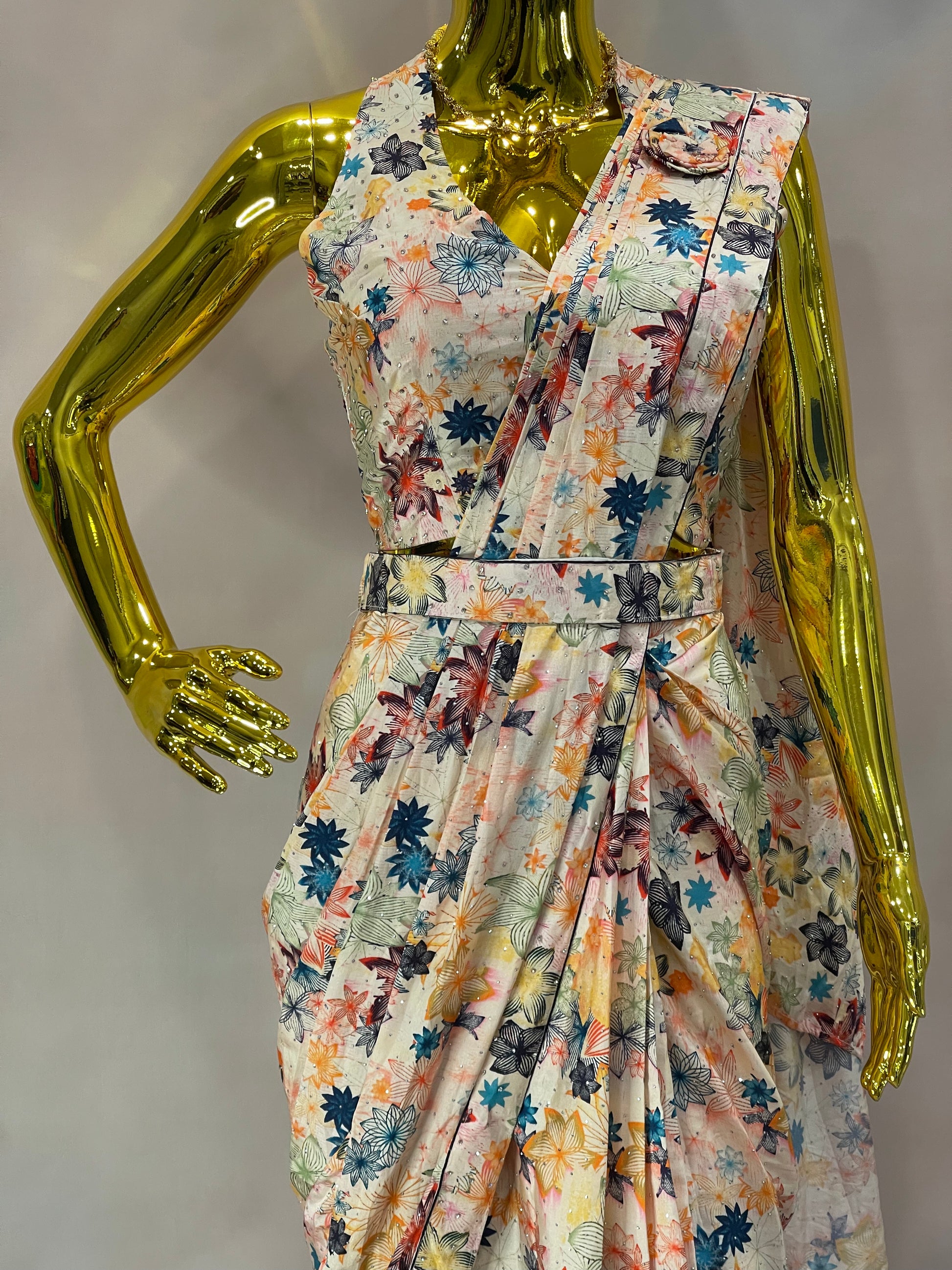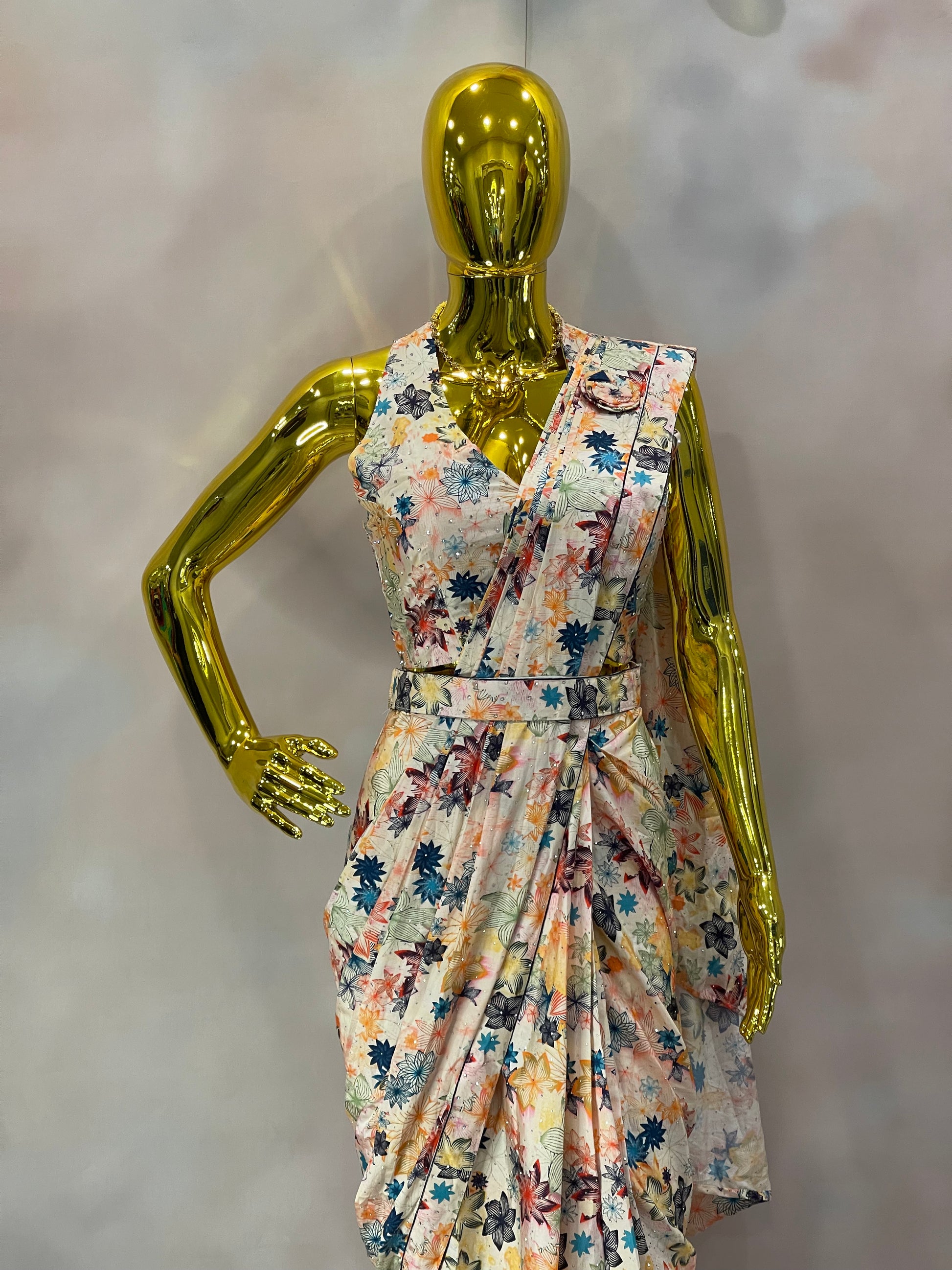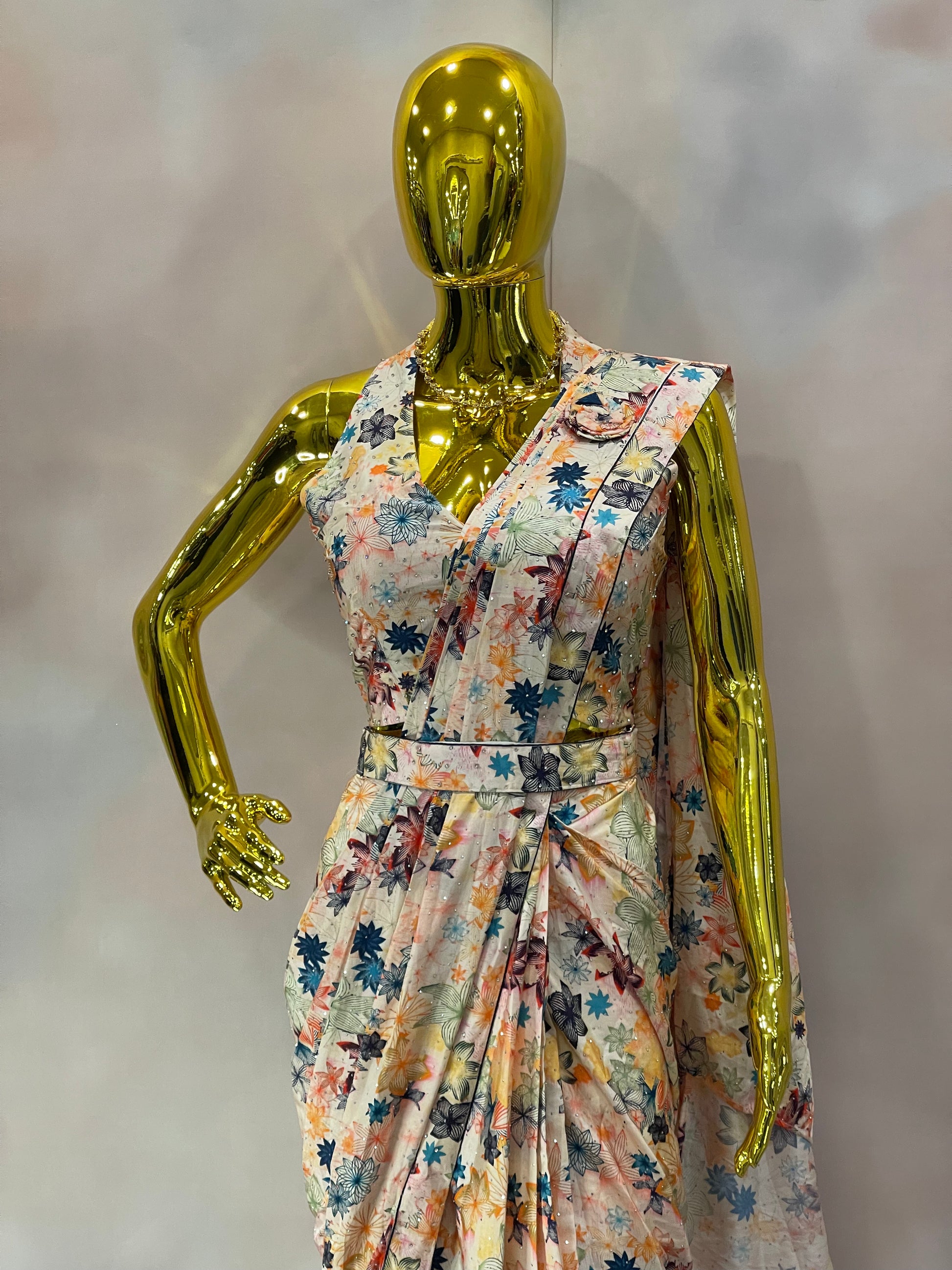A breezy and elegant pastel floral saree crafted in soft fabric, styled with a contemporary pre-draped silhouette and matching blouse. Perfect for day events or light evening celebrations, this saree offers effortless charm with modern ease.