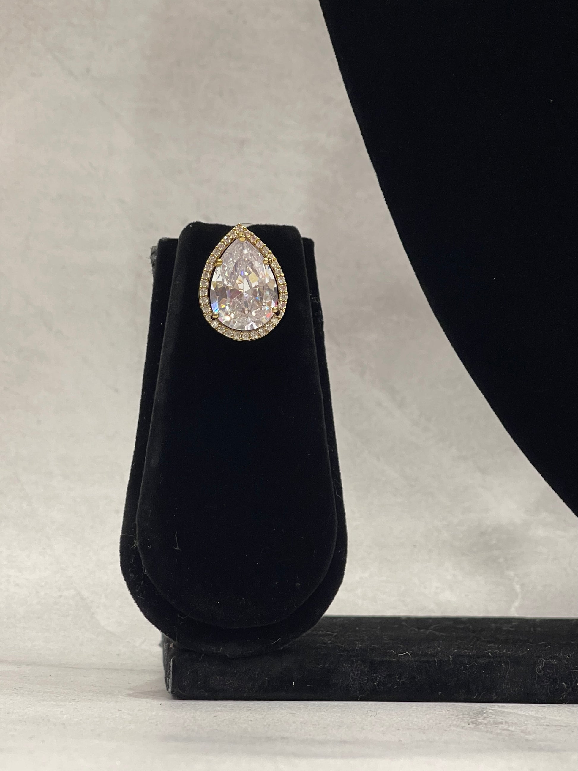 Elevate your bridal elegance with this stunning cubic zirconia necklace set, featuring a layered floral design that cascades gracefully to a pear-shaped pendant. Paired with matching teardrop earrings, this set is crafted for brides who desire sparkle with sophistication. The gold-tone finish and high-shine stones create a look that’s timeless yet glamorous, perfect for your most cherished occasions. Available exclusively for rent at FZO, Jubilee Hills.