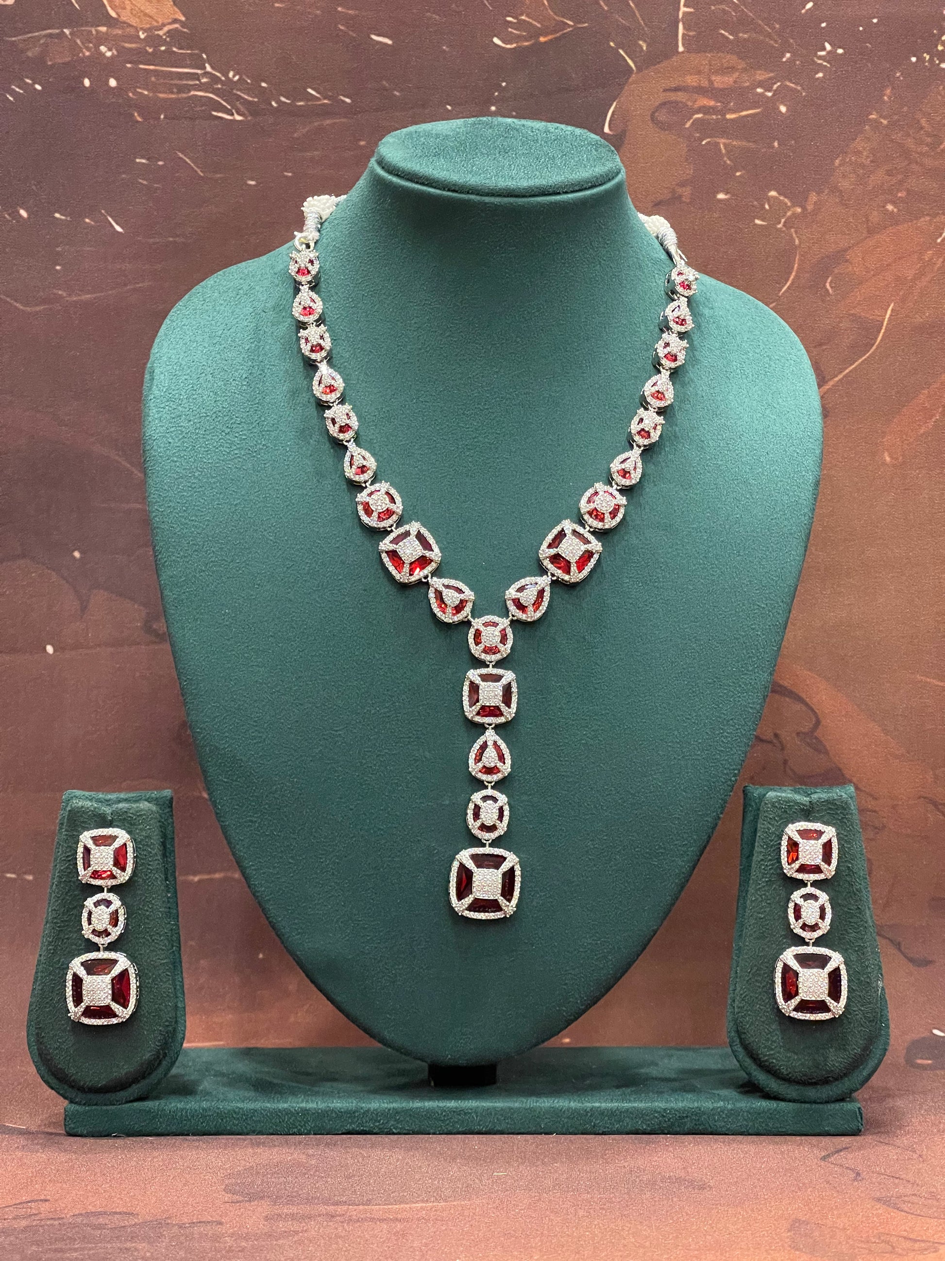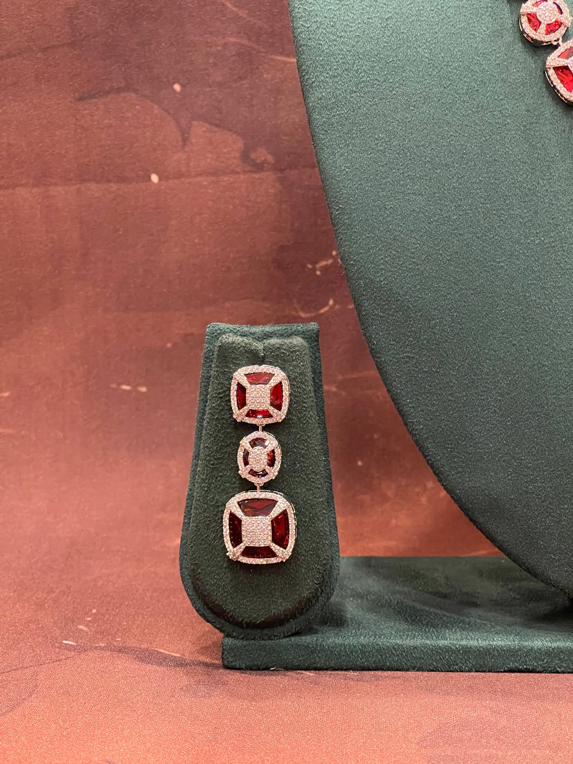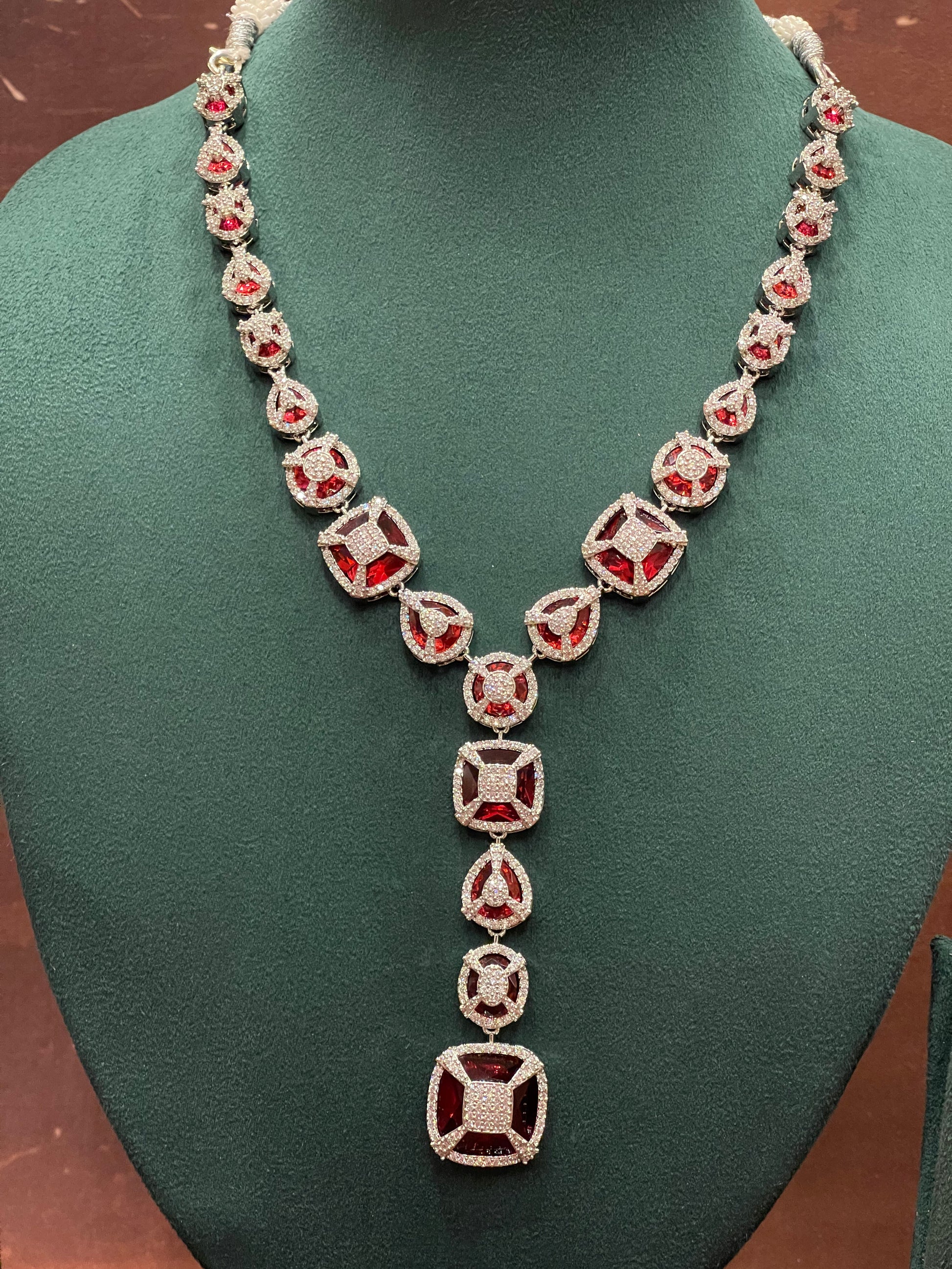 A meticulously balanced necklace with bold ruby centerpieces surrounded by pavé crystal work. Comes with matching geometric drop earrings for a cohesive and bold look.