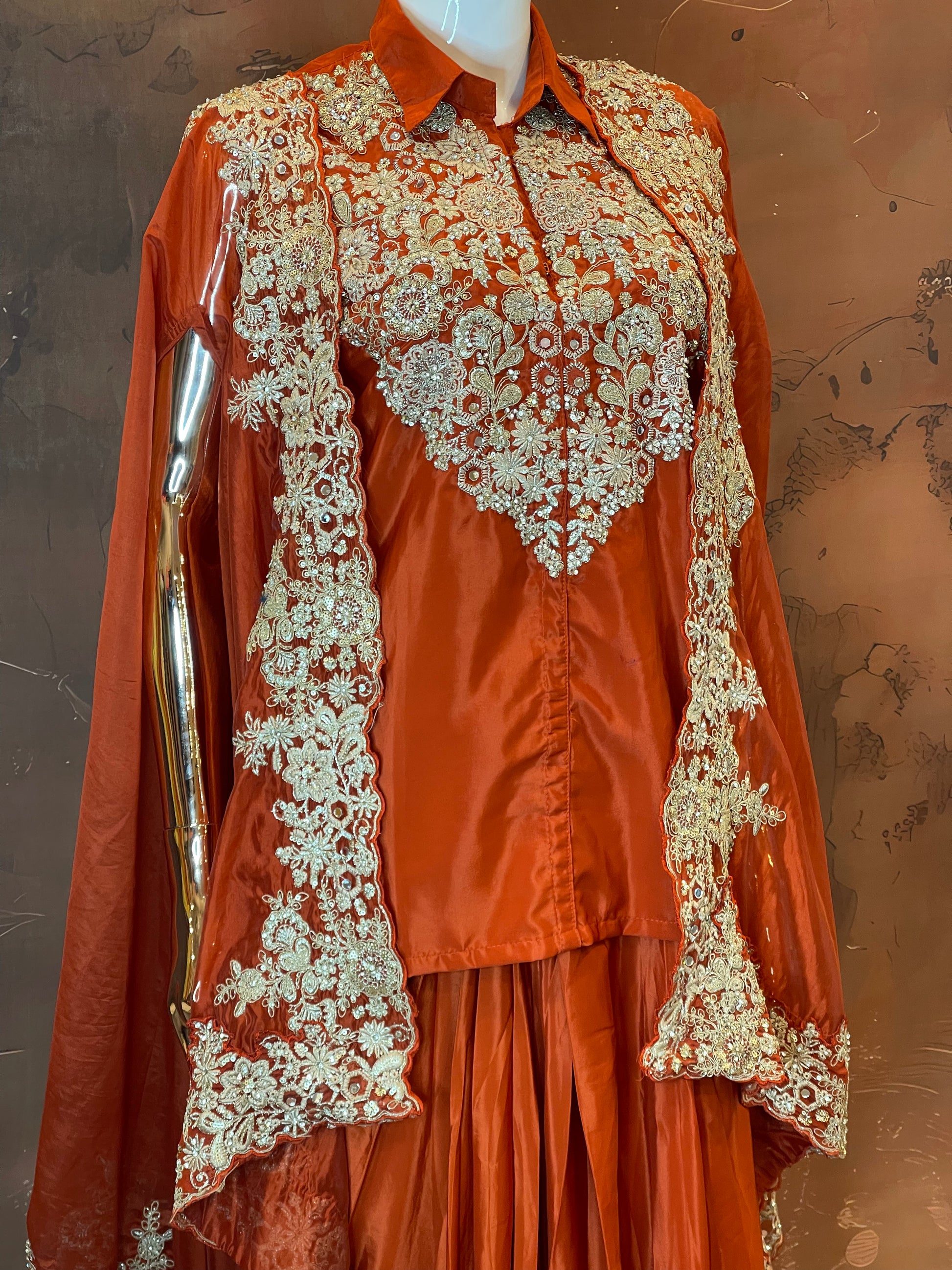 Command attention with this majestic rust-orange lehenga set, featuring a collared blouse paired with an intricately embroidered cape overlay. Accented with rich gold threadwork, this ensemble is a powerful blend of tradition and contemporary flair – exclusively at FZO, Hyderabad.