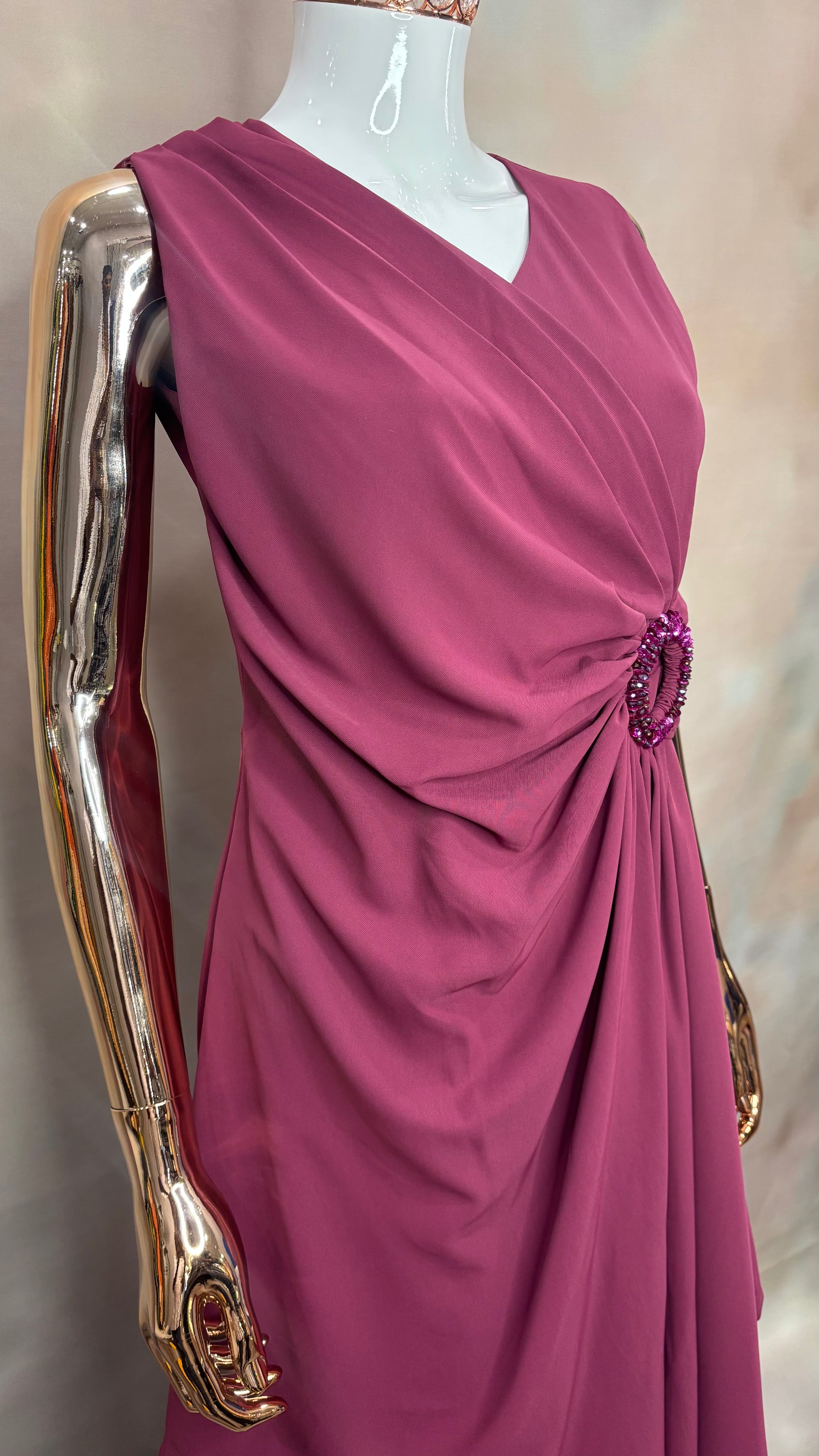 Grace meets modern elegance in our Rosewood Drape gown – a flowing mauve ensemble featuring soft layers and a delicately ruched waist with a statement beaded clasp. With its asymmetrical drape and sleeveless cut, this partywear gown is perfect for cocktail evenings, formal gatherings, or bridesmaid looks.