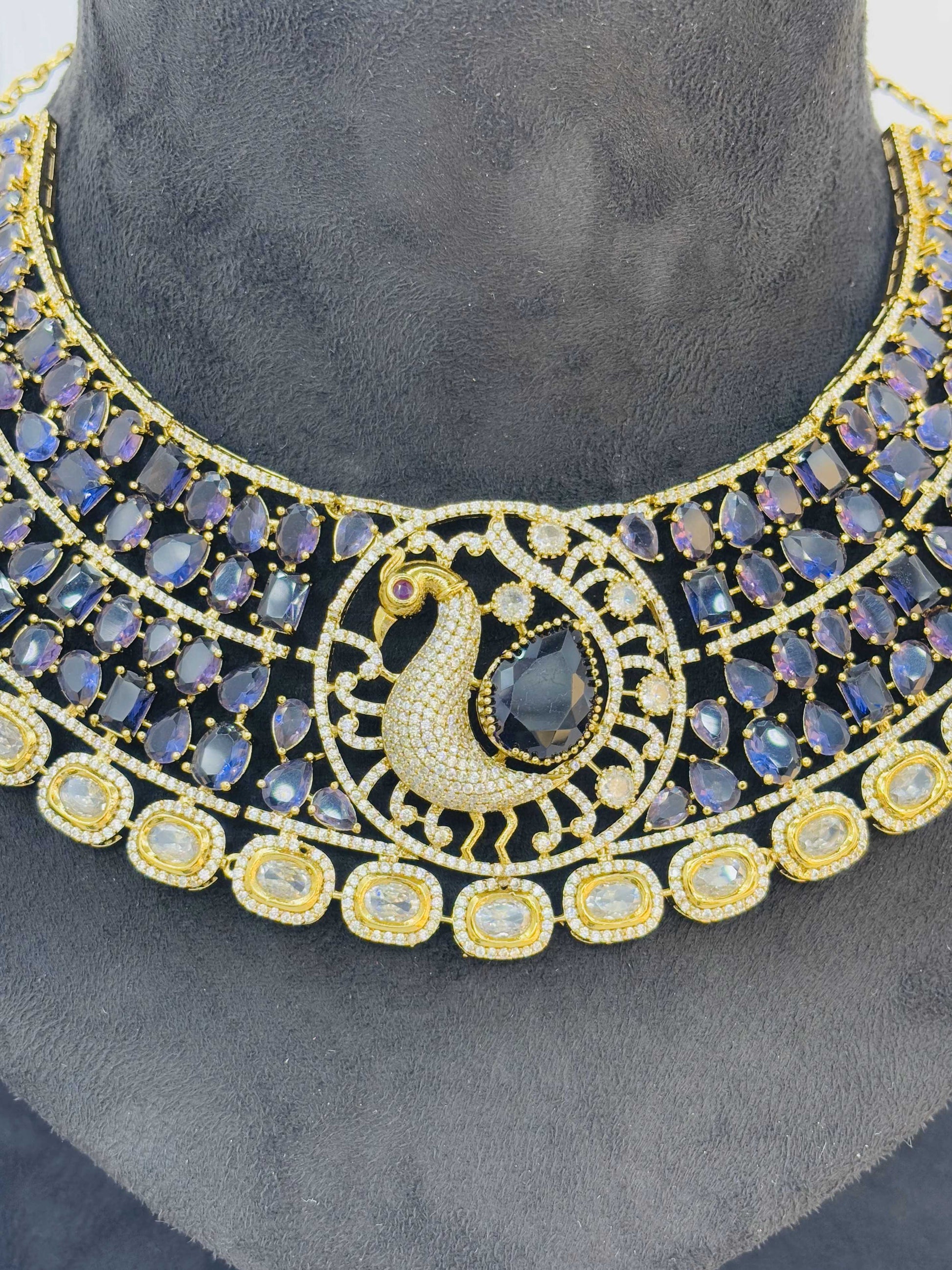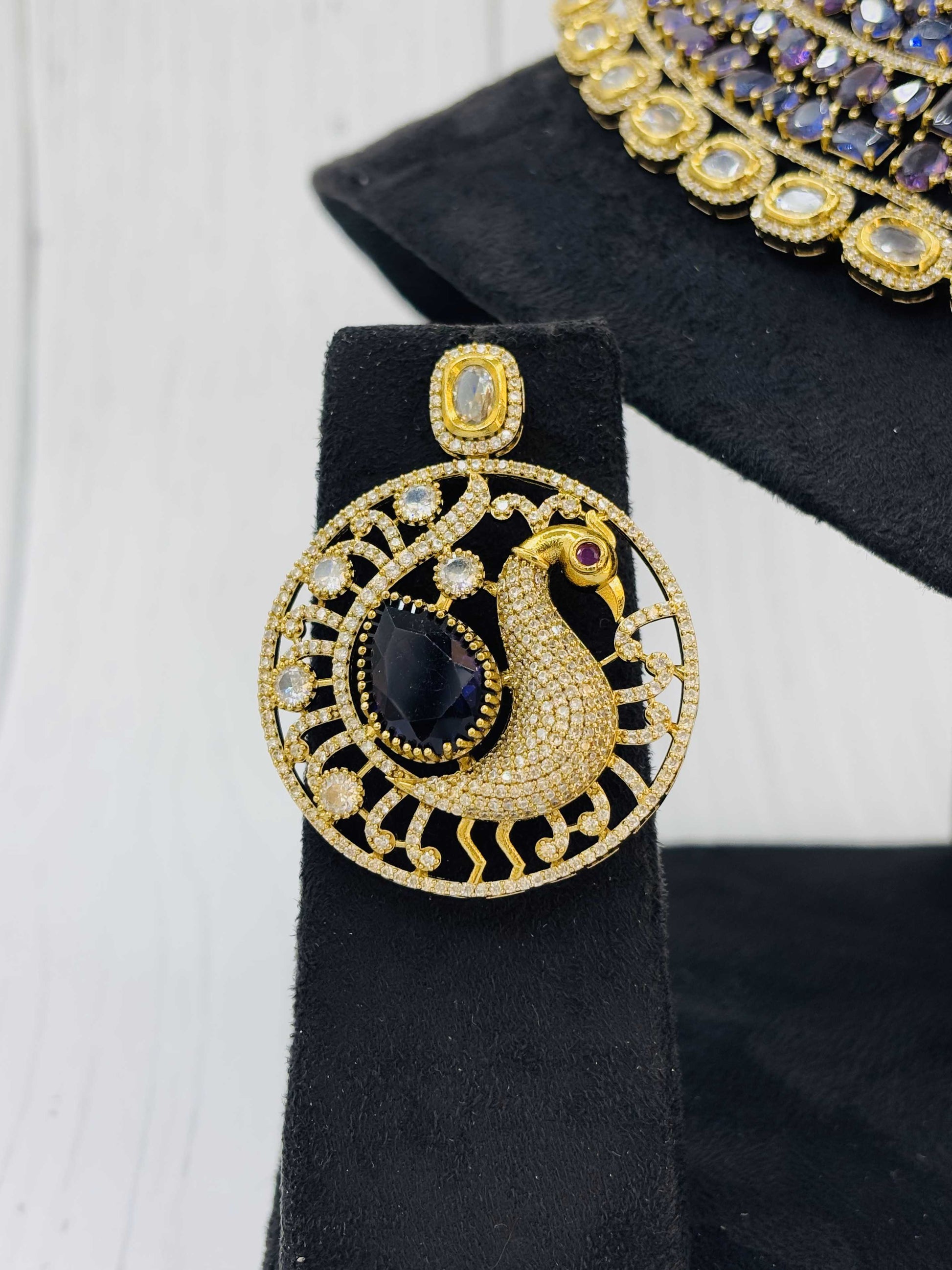 Rent our Royal Peacock Amethyst Choker at FZO, Jubilee Hills, Hyderabad. This striking piece features rich amethyst-toned stones and a detailed peacock centerpiece—perfect for making a bold and elegant style statement.