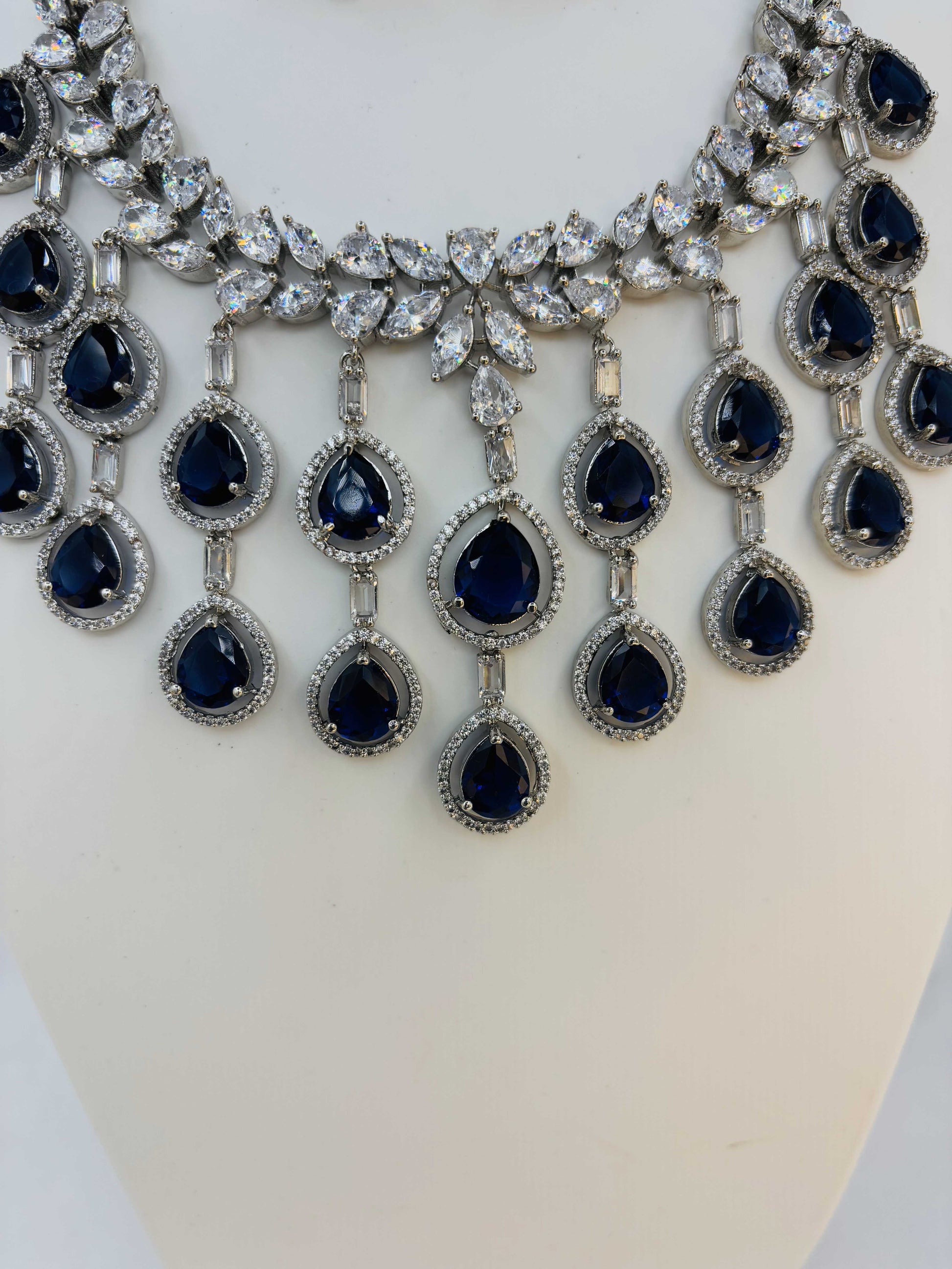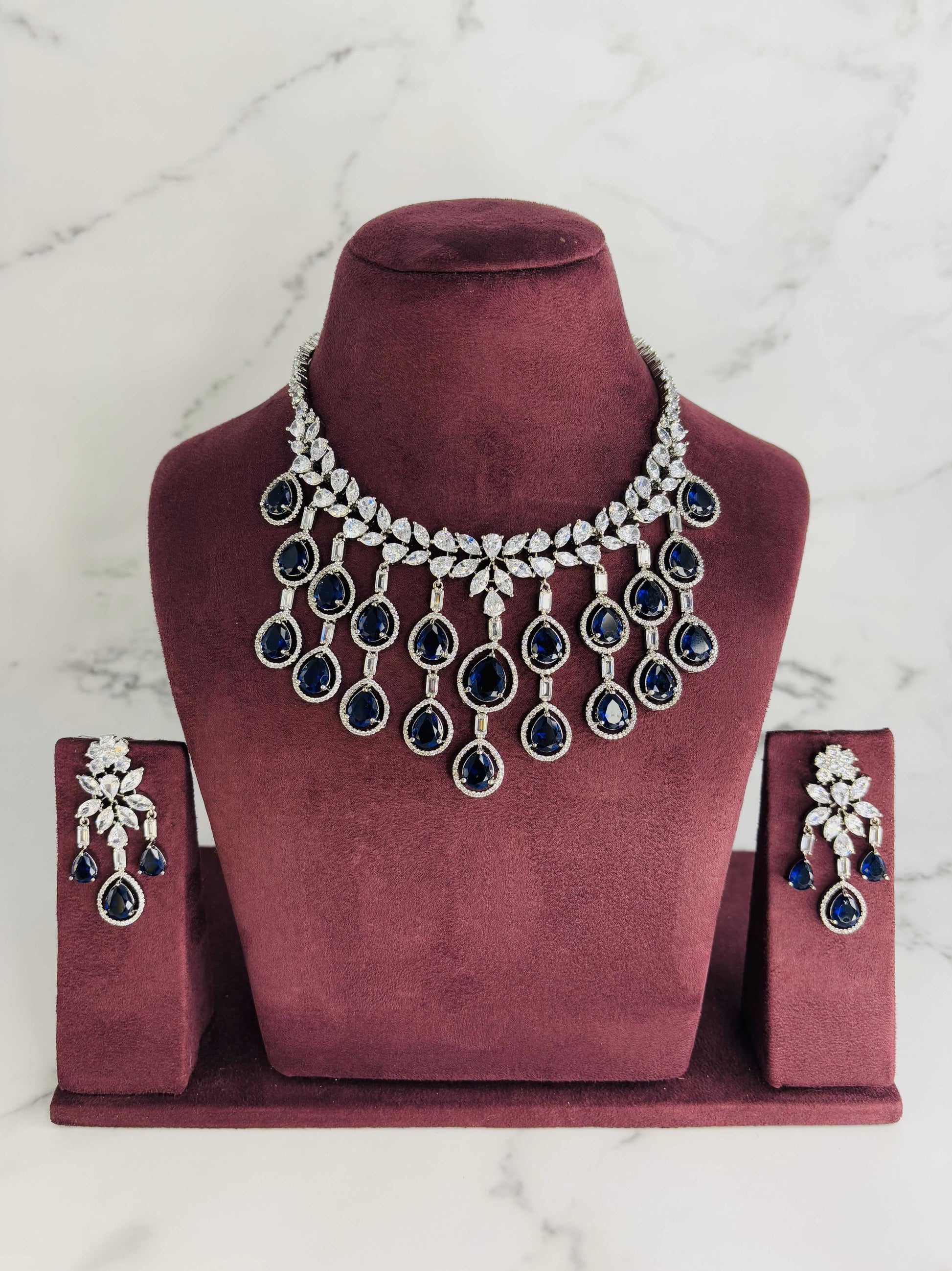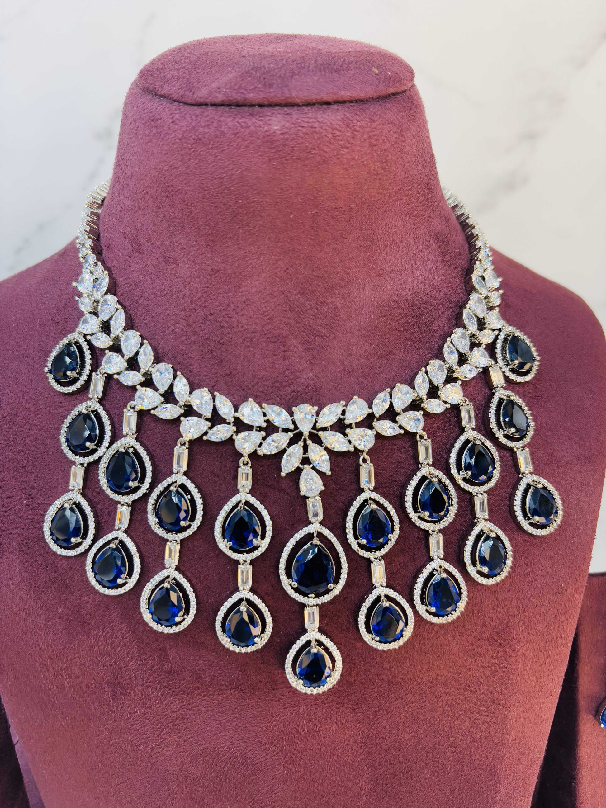 Rent our Sapphire Blue Diamond Necklace Set at FZO, Jubilee Hills, Hyderabad. This dazzling set showcases sapphire-hued teardrop stones paired with sparkling diamond-finish accents—crafted for refined and radiant elegance.