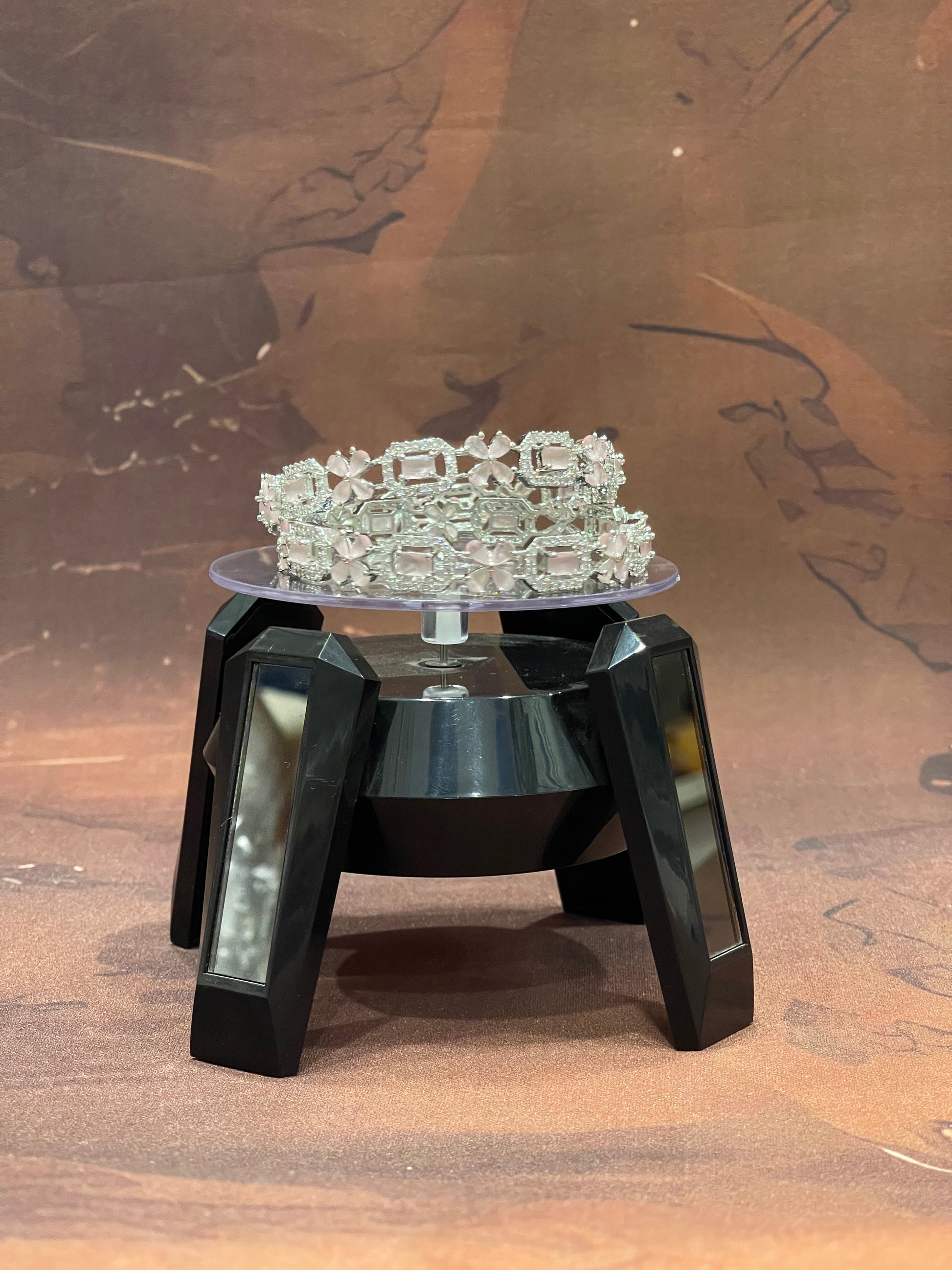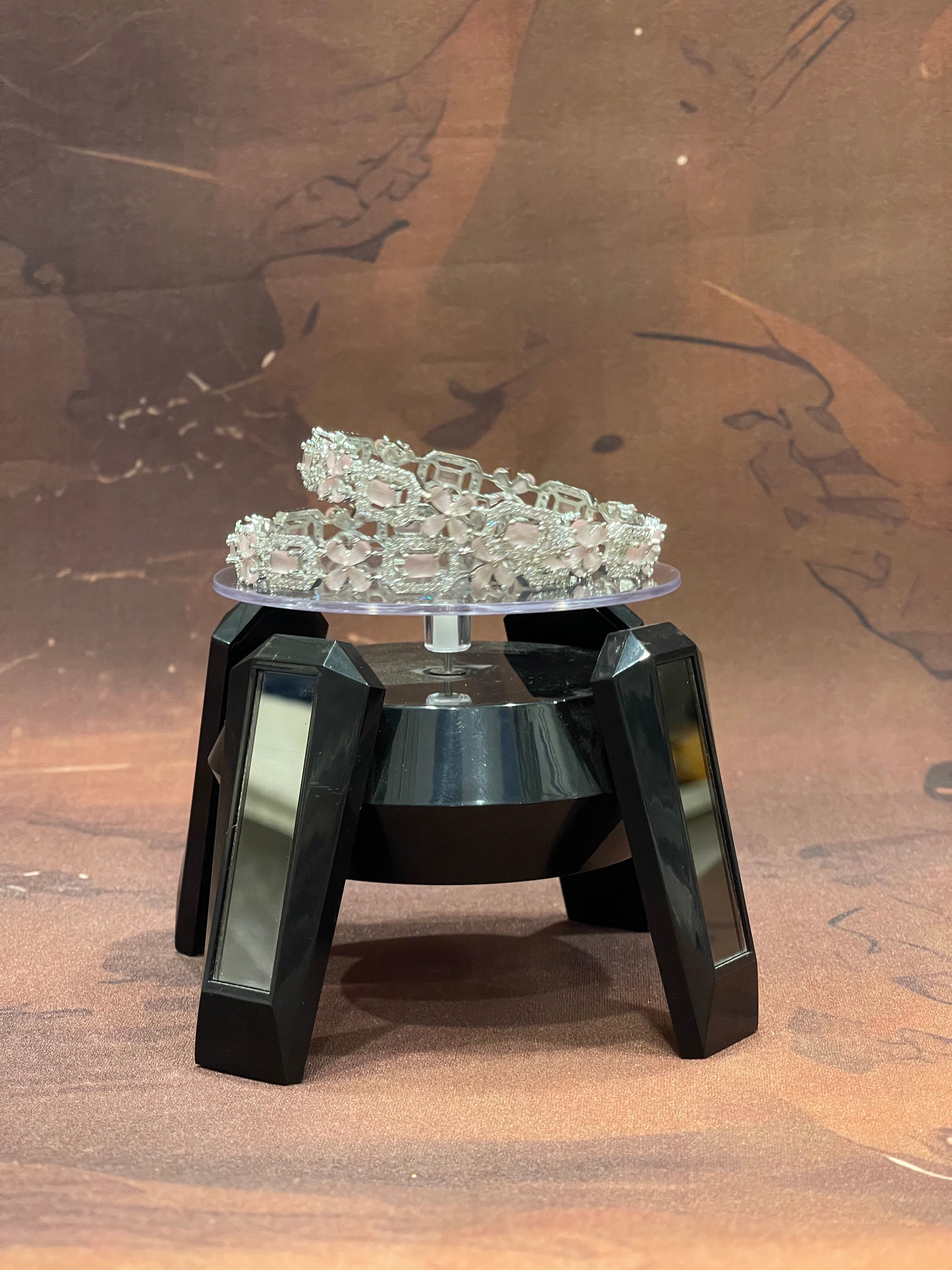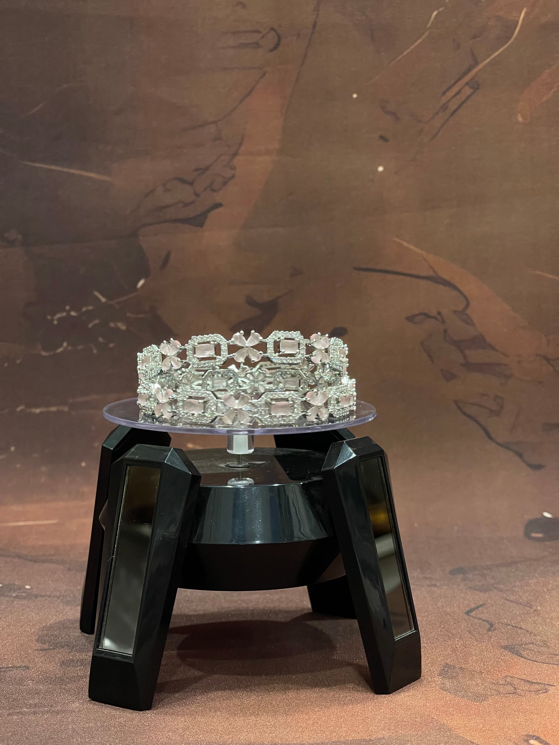 These graceful silver bangles are embellished with soft baby pink stones arranged in floral motifs and geometric frames — a delicate statement for feminine charm.