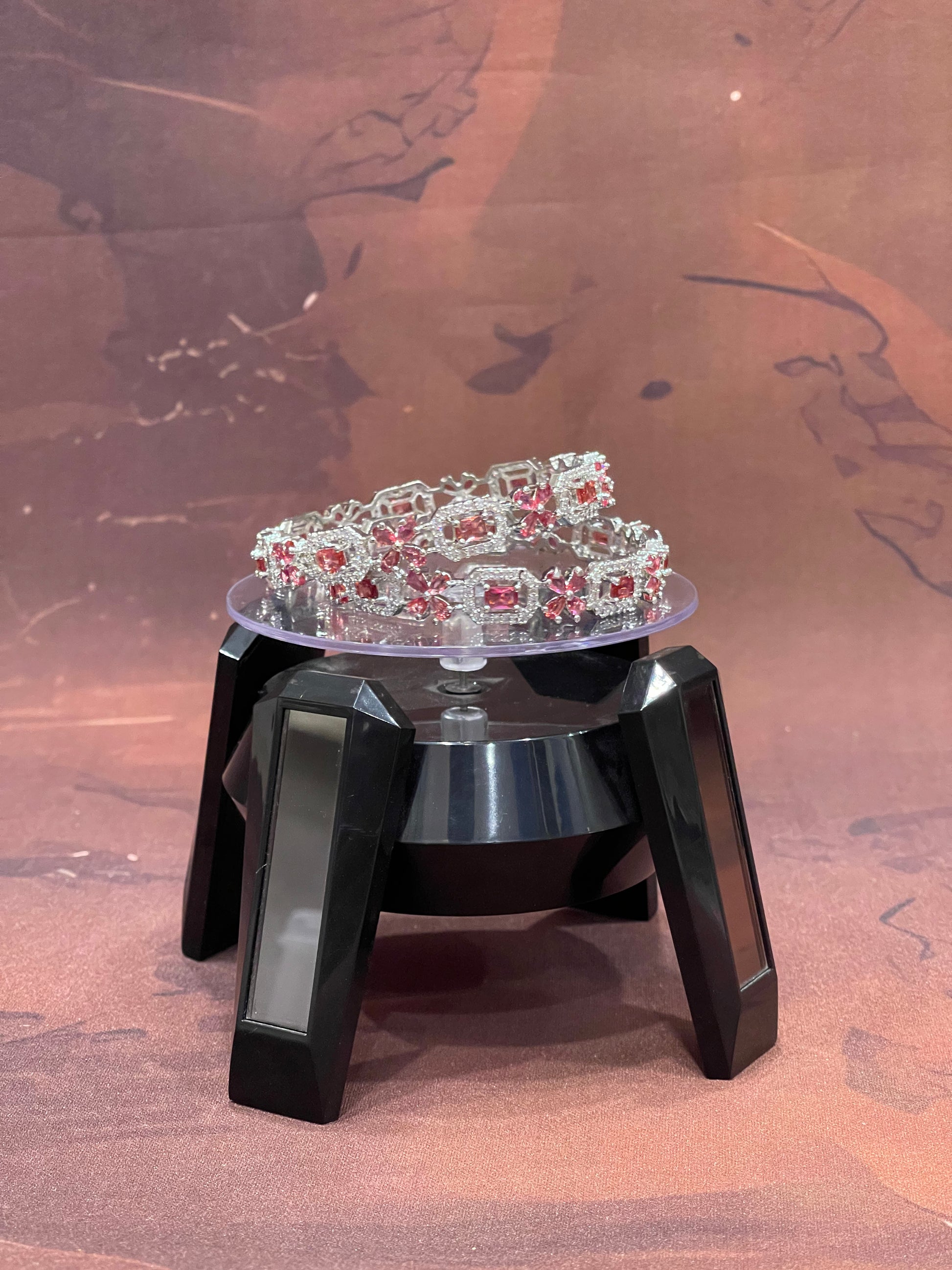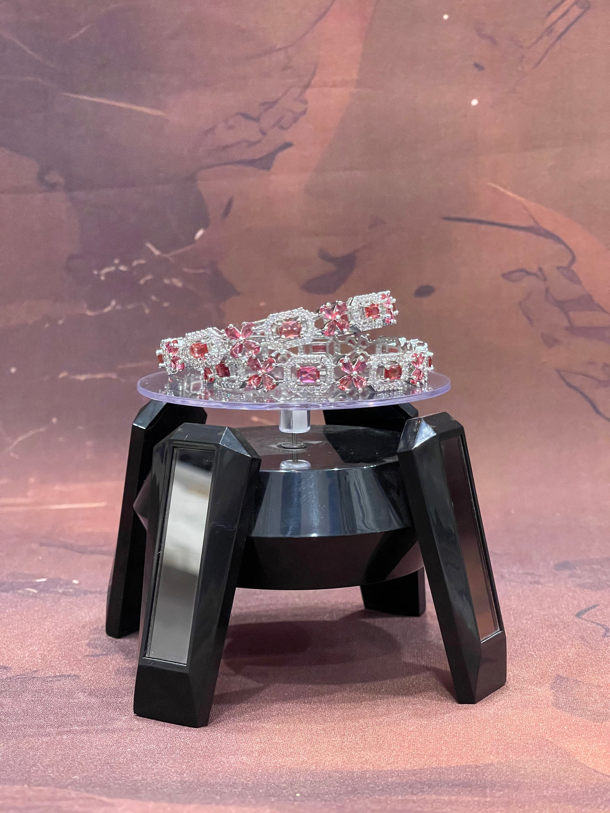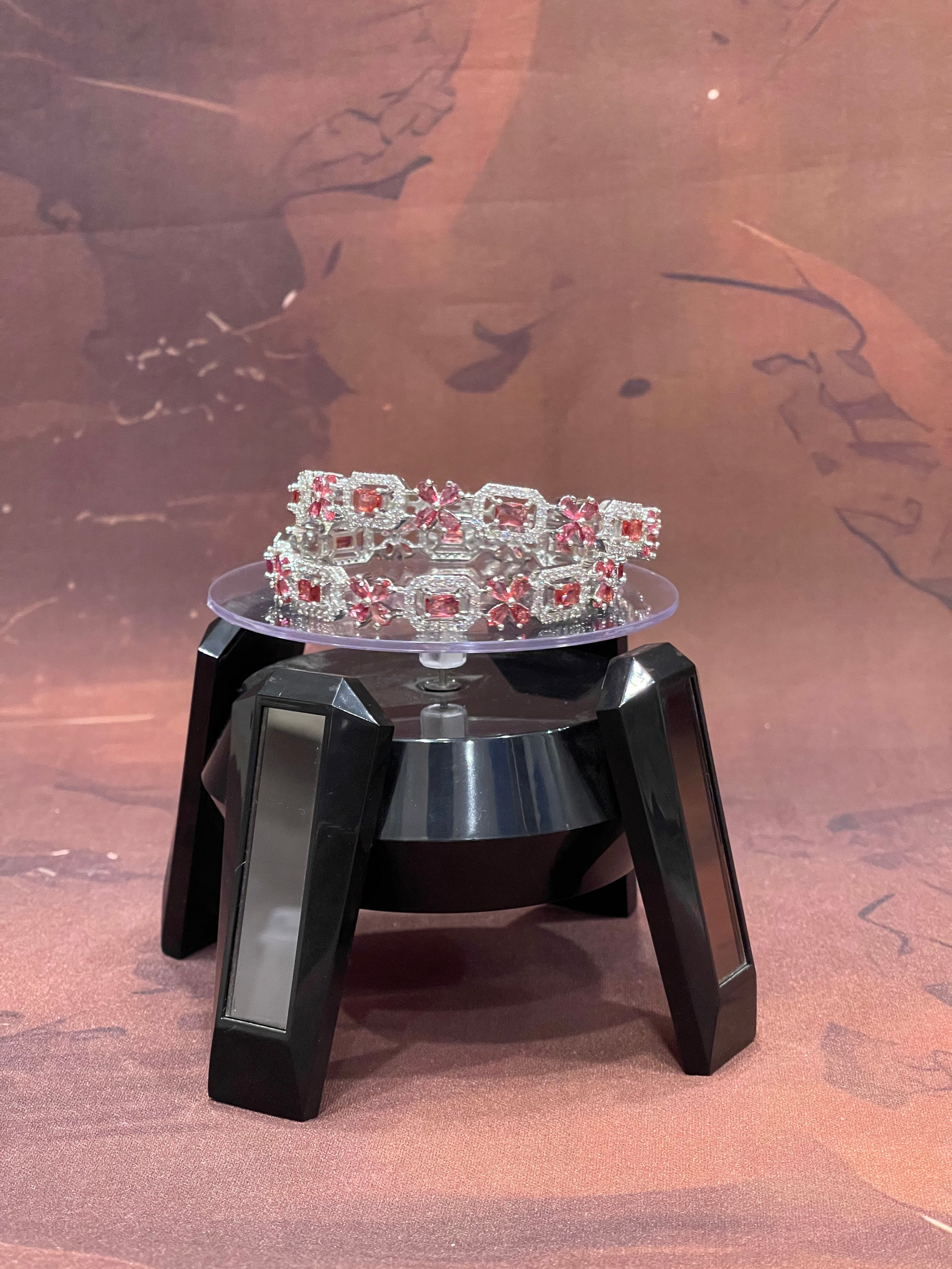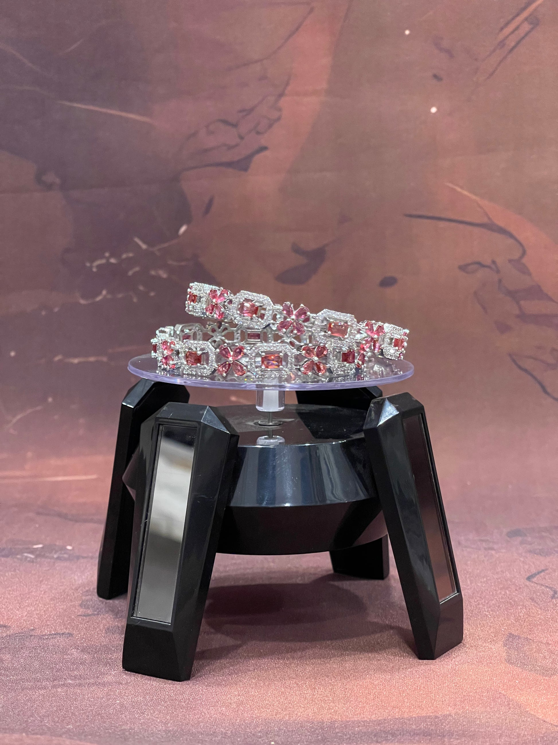 hese glamorous silver-finish bangles are embellished with vibrant ruby pink stones in alternating floral and square-cut motifs. A showstopper piece for any festive ensemble.