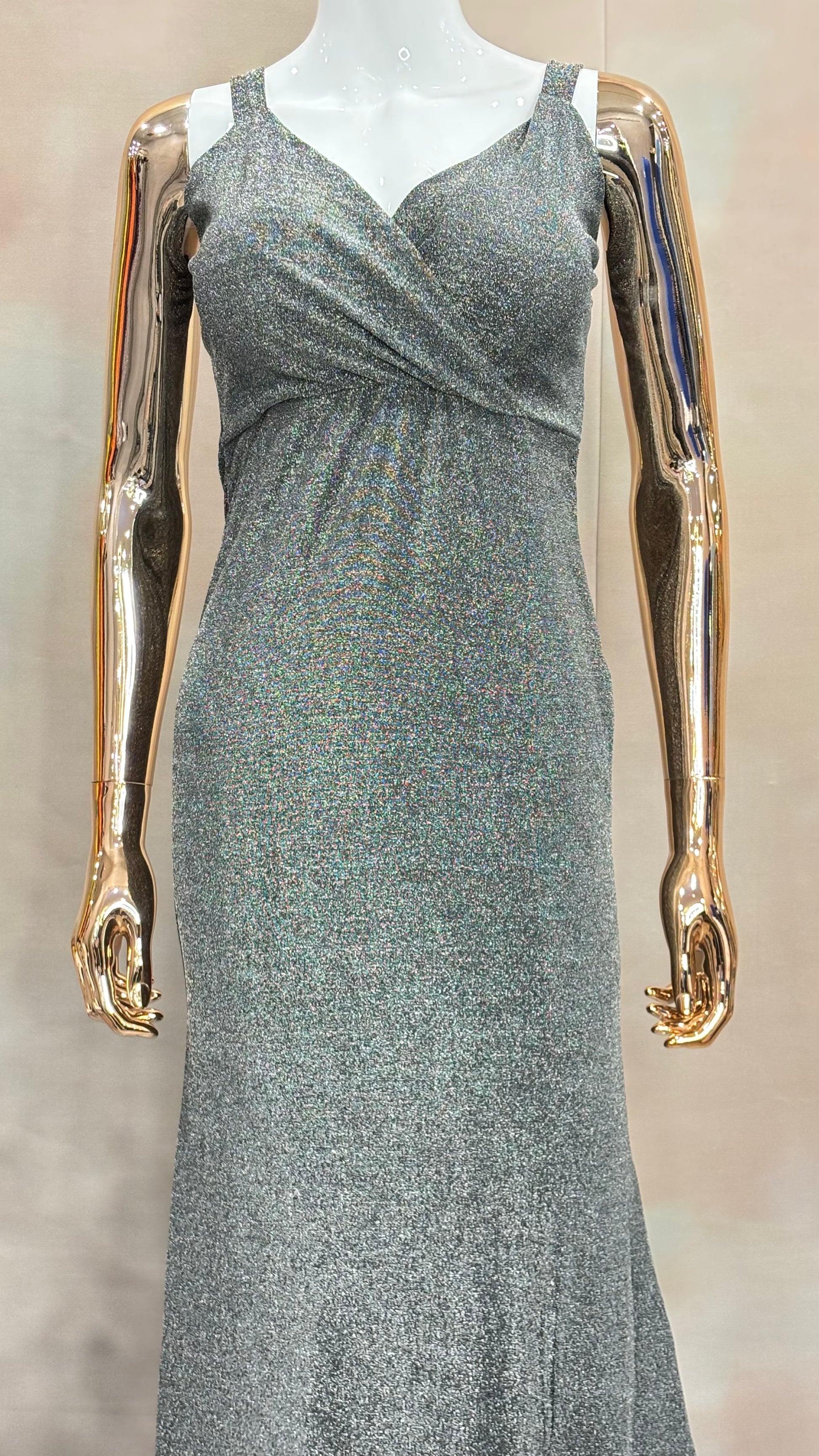 Radiate confidence with this silver shimmer body-hugging gown featuring a crossover neckline and sleeveless cut. The sleek, stretch-fit silhouette enhances your curves while the glitter fabric brings just the right amount of dazzle. Now available for rent exclusively at FZO, Hyderabad.