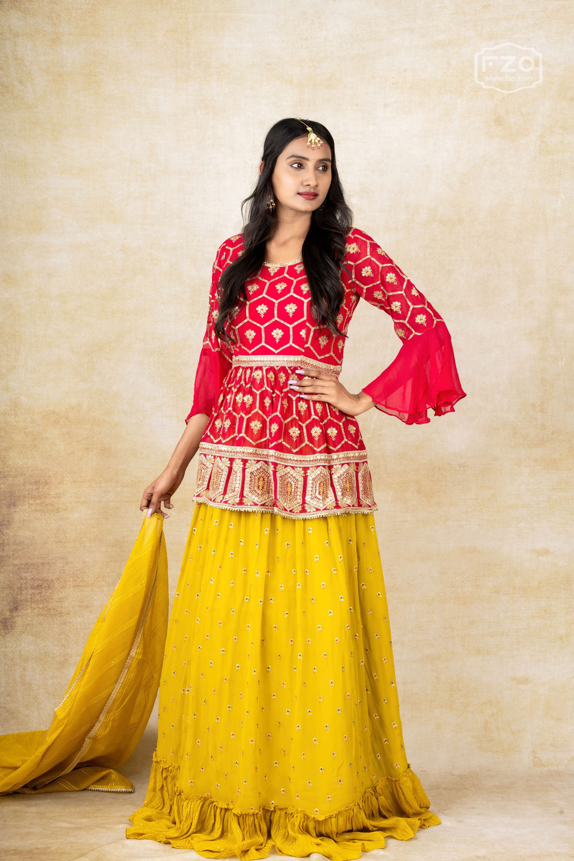 This vibrant yellow lehenga paired with a rich red peplum-style blouse is the perfect blend of festive charm and youthful flair. Designed with intricate embroidery and soft ruffle details, it's an ideal pick for haldi functions, mehendi events, and vibrant celebrations.
