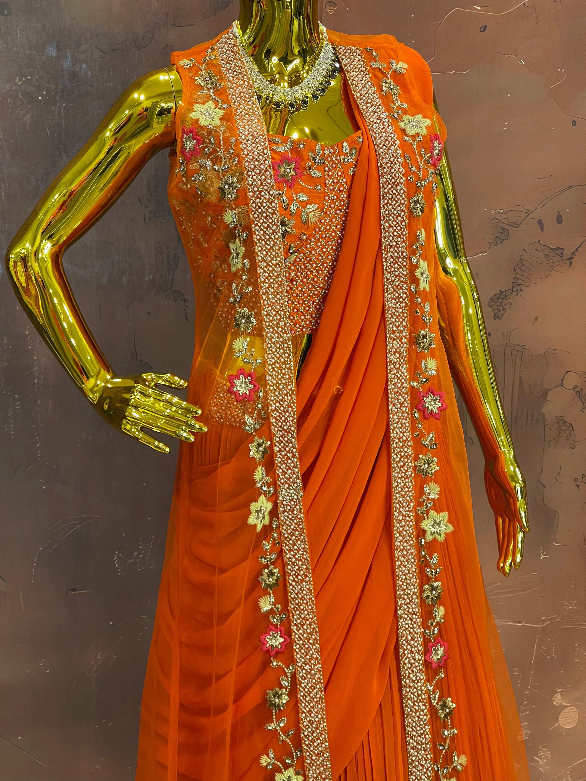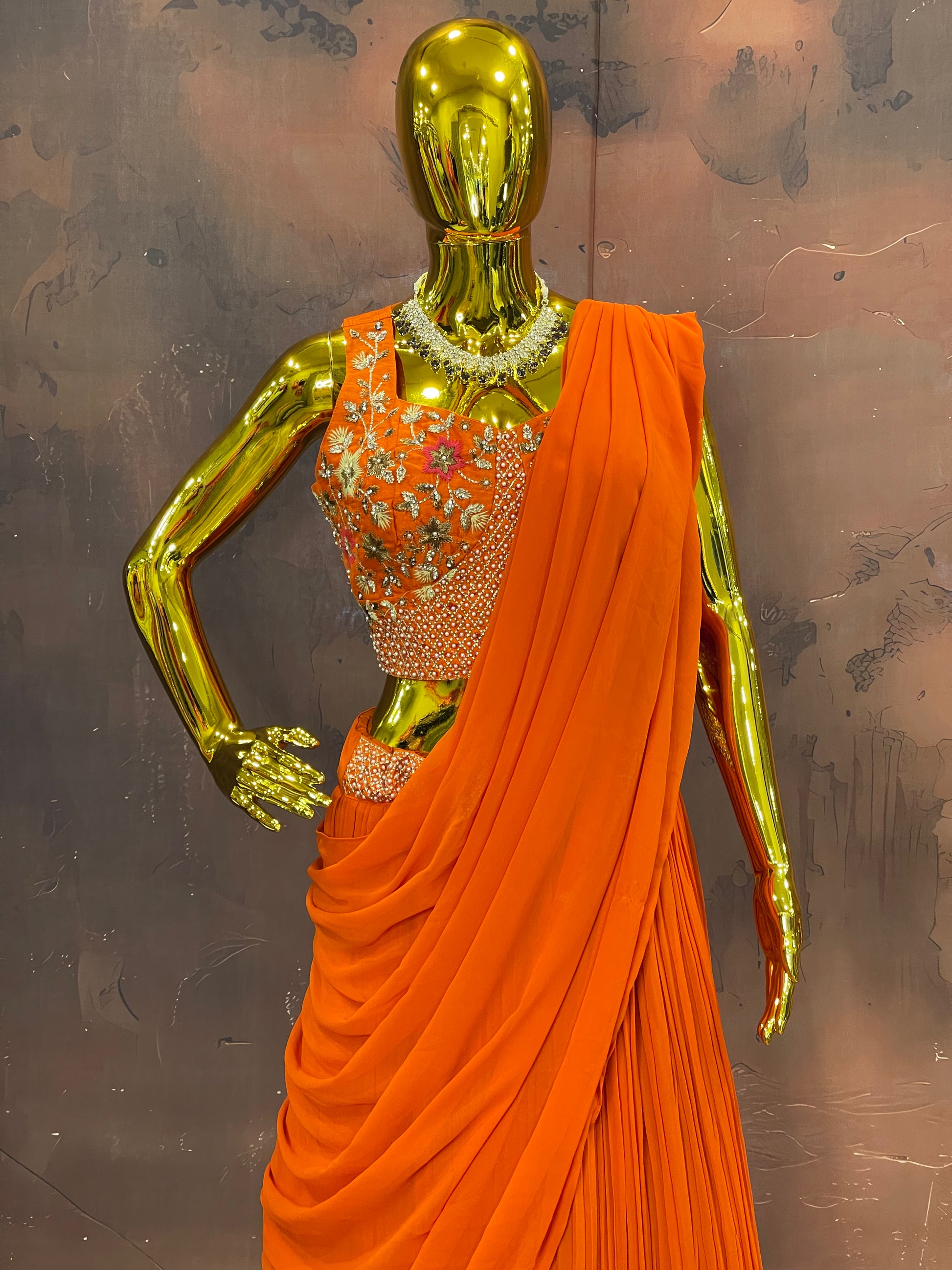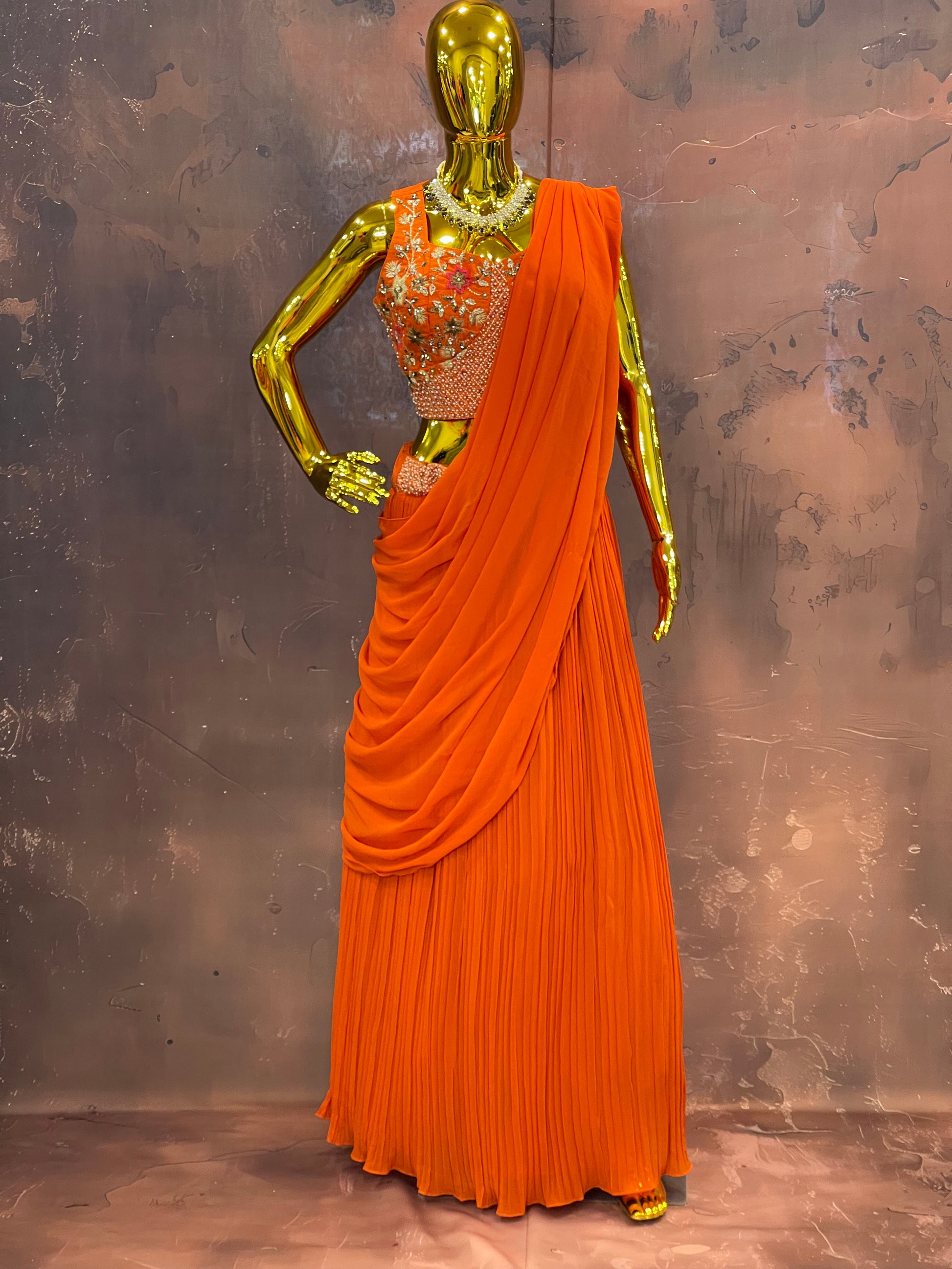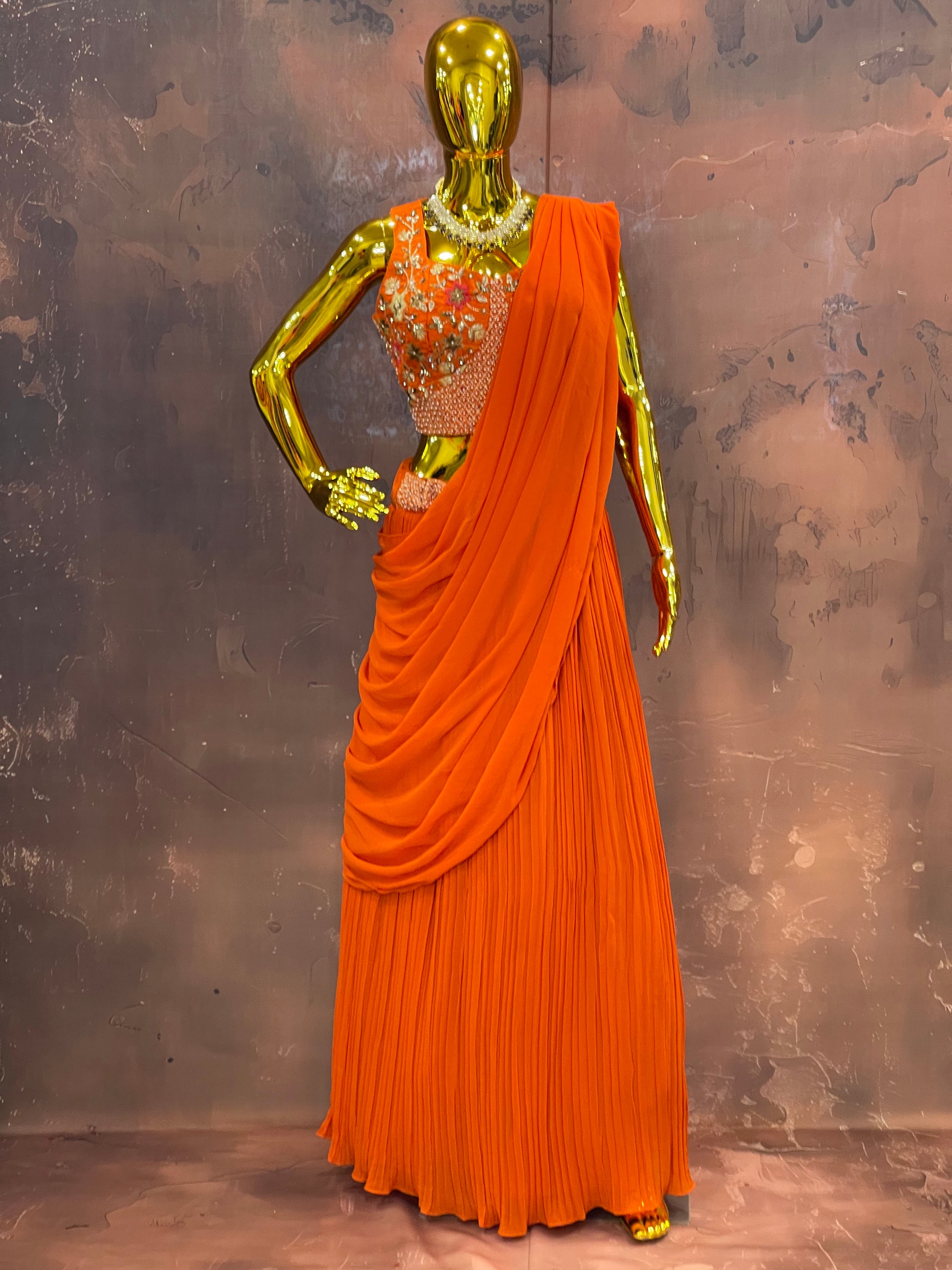 Glow with festive charm in our Tangerine Glint lehenga set – a vibrant and contemporary ensemble. Featuring a mirror and sequin hand-embroidered blouse with a pleated skirt and pre-stitched drape, this look is made for haldi events, mehendi functions, or daytime weddings.
