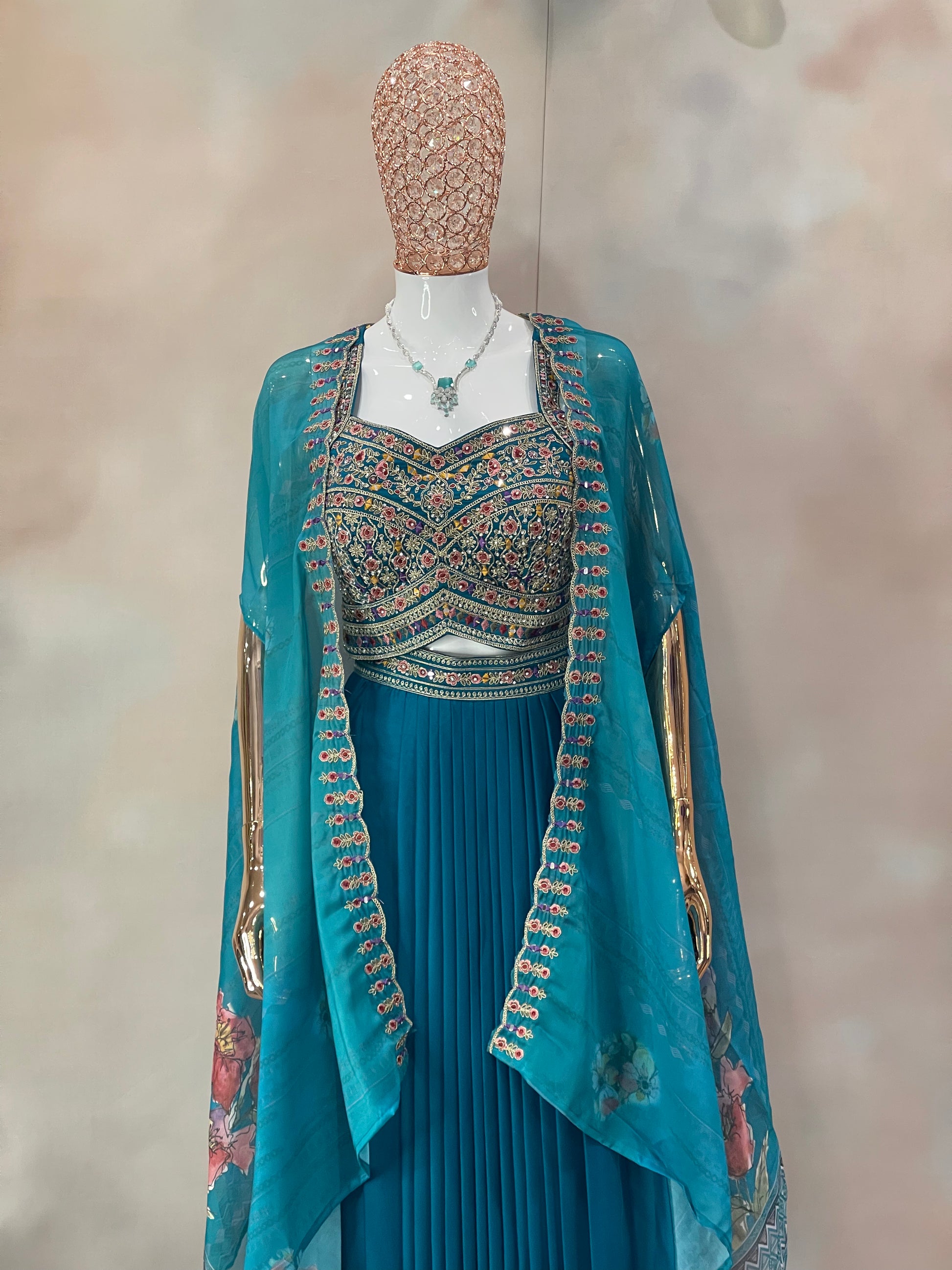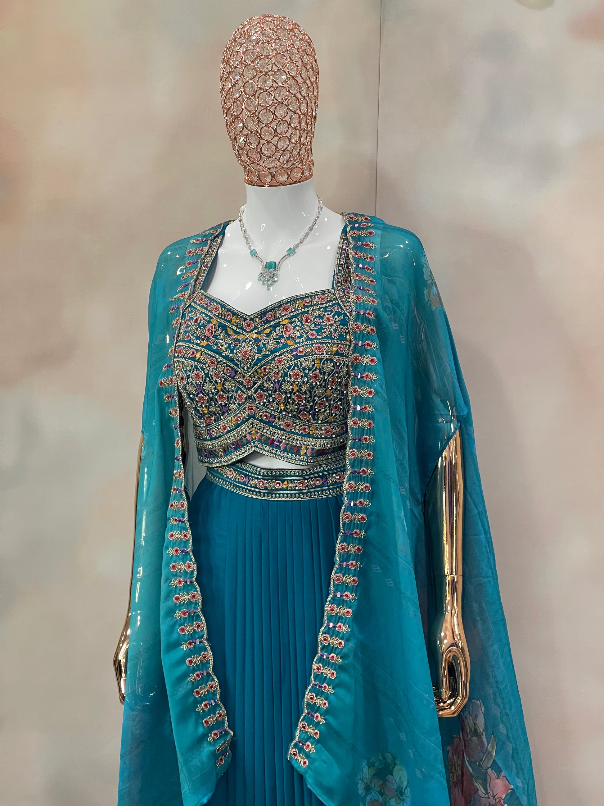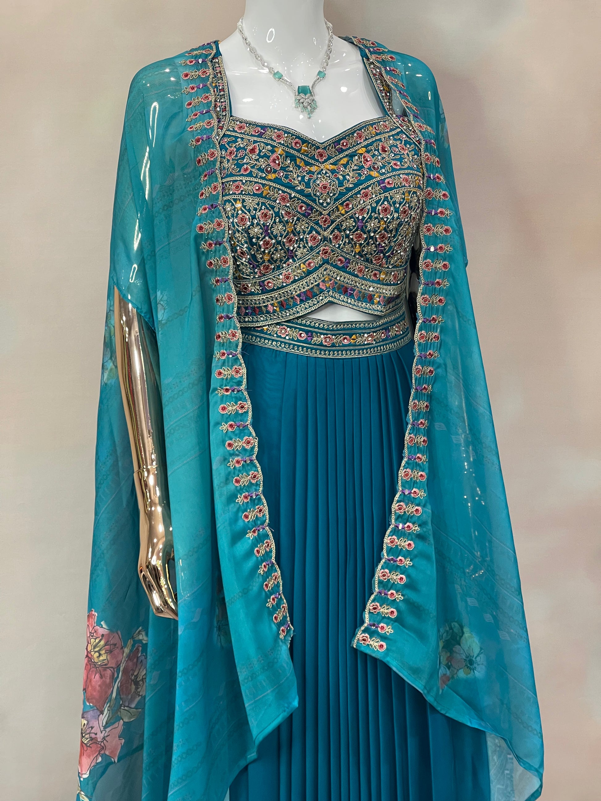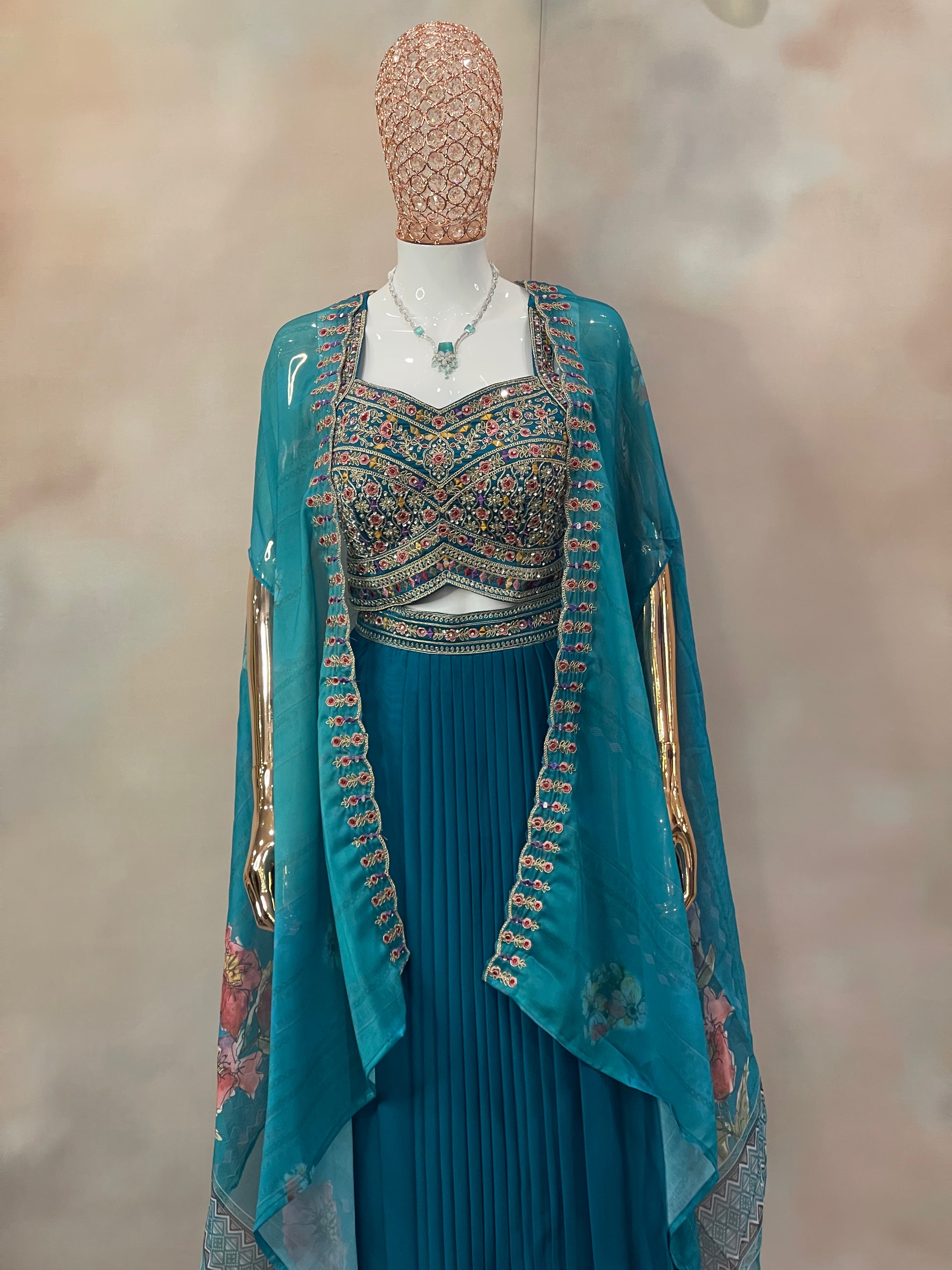 A stunning teal Indo-Western set featuring a heavily embroidered bustier-style blouse, paired with a finely pleated skirt and a sheer floral-detailed cape. An elegant fusion of modern silhouette and intricate craft, designed for statement occasions.