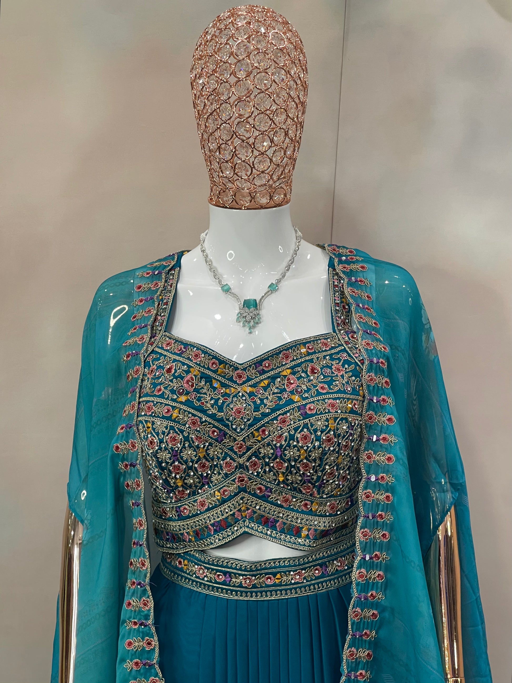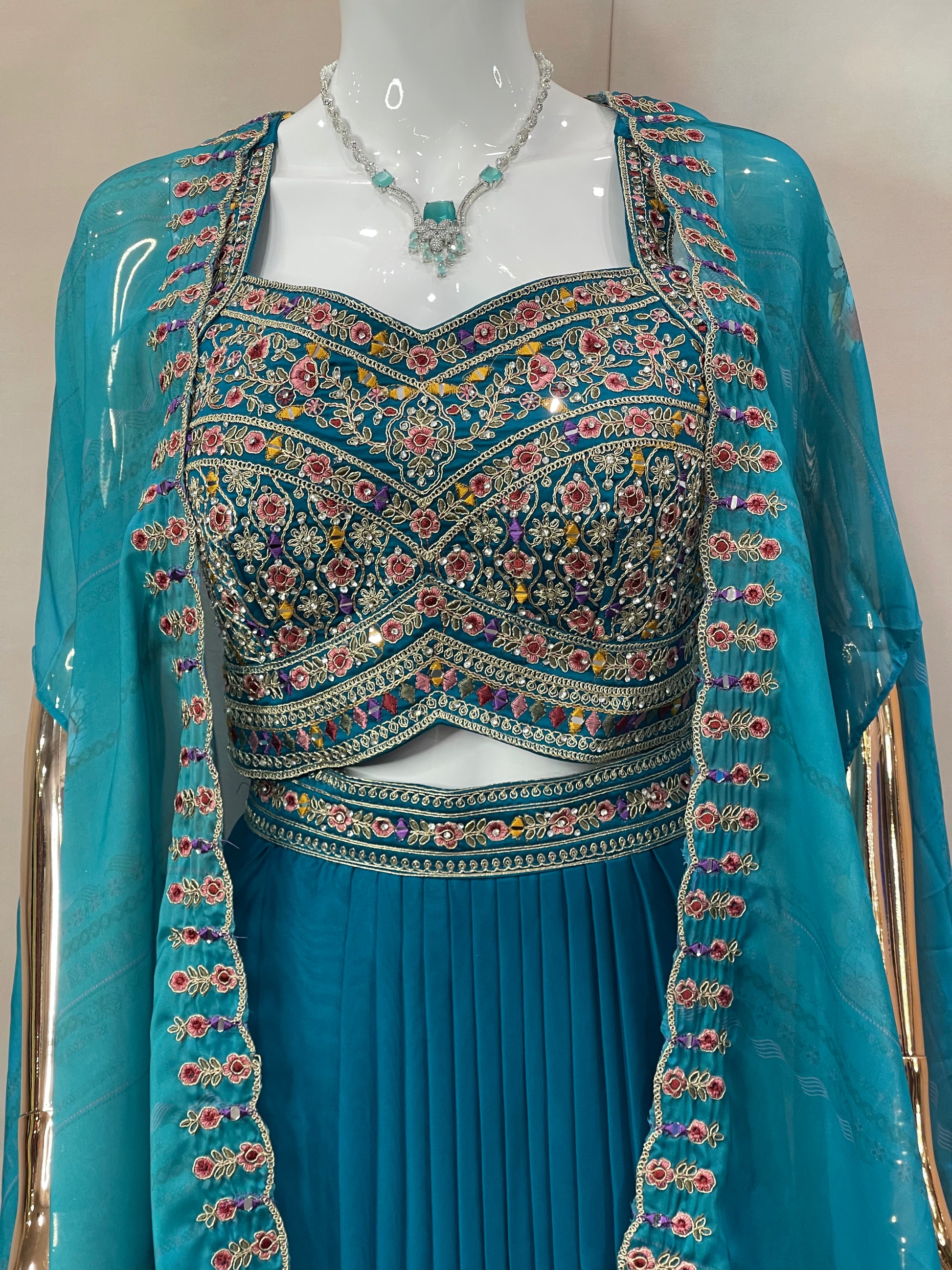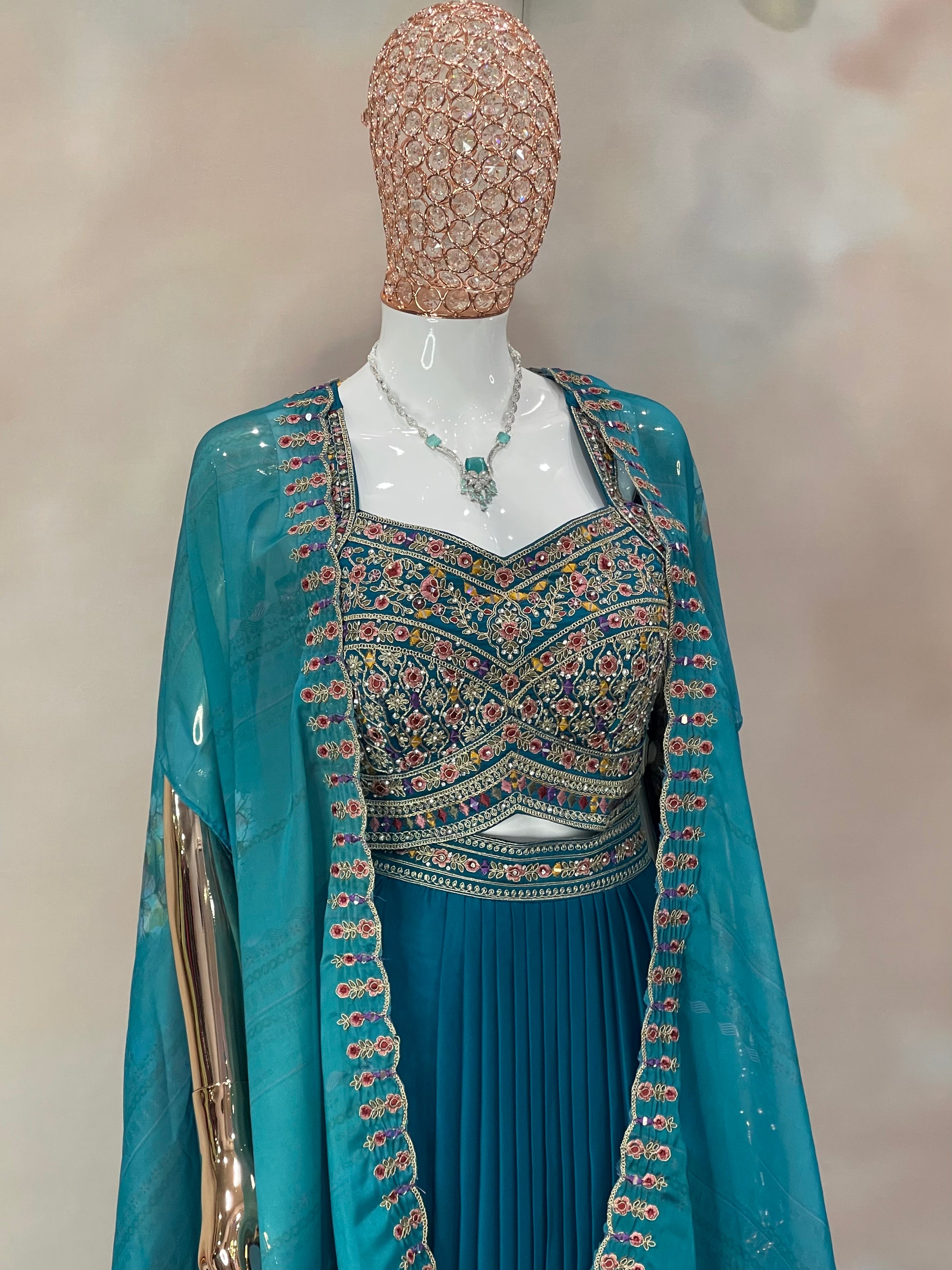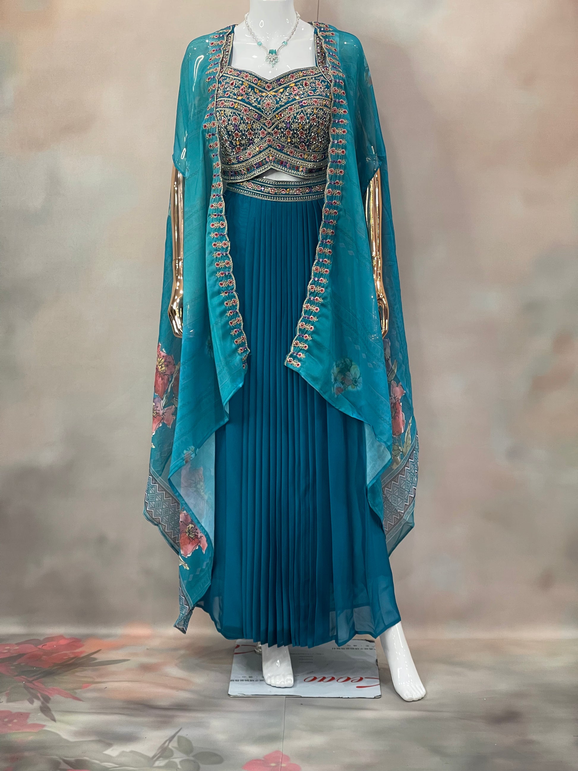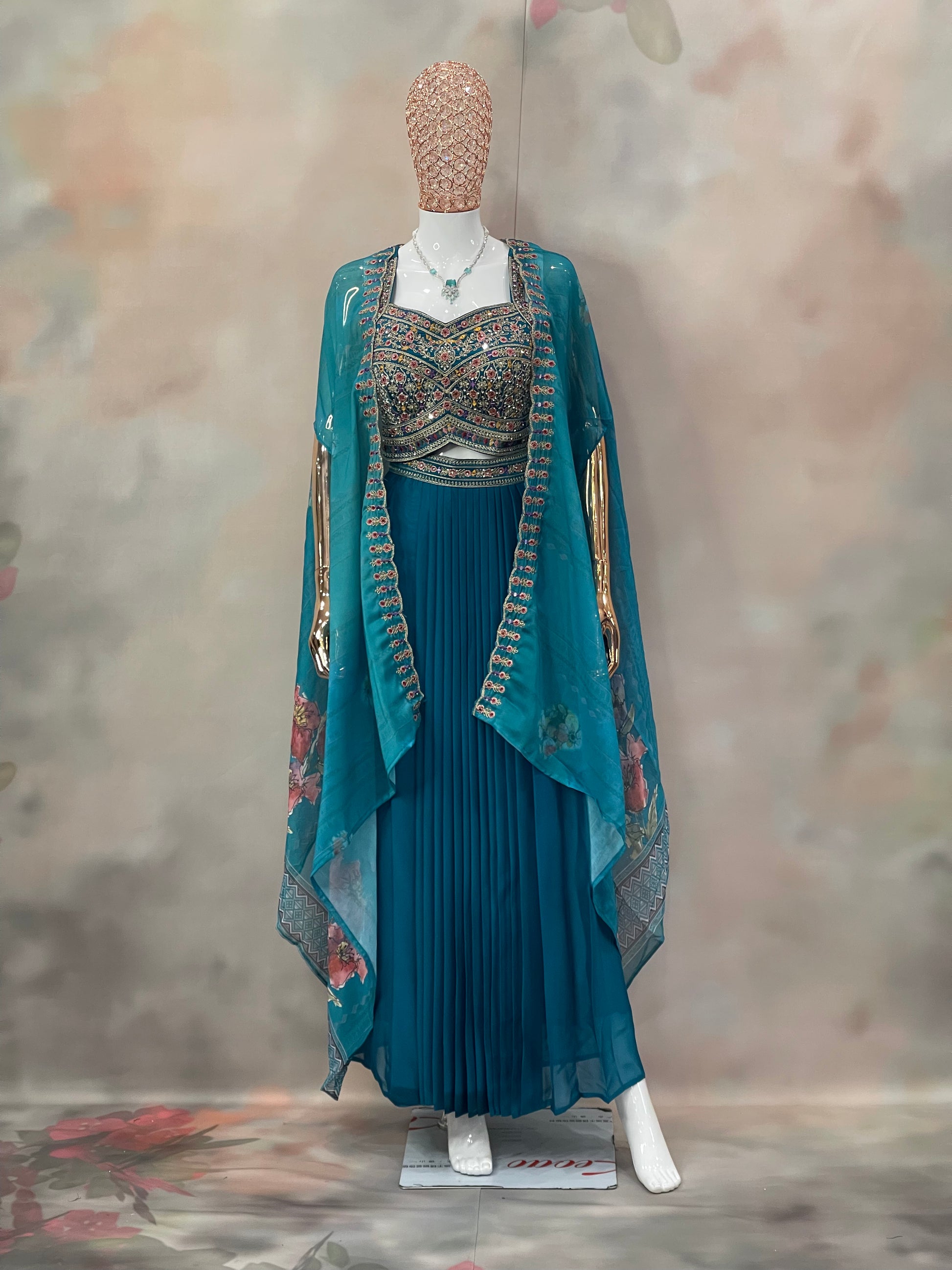 A stunning teal Indo-Western set featuring a heavily embroidered bustier-style blouse, paired with a finely pleated skirt and a sheer floral-detailed cape. An elegant fusion of modern silhouette and intricate craft, designed for statement occasions.