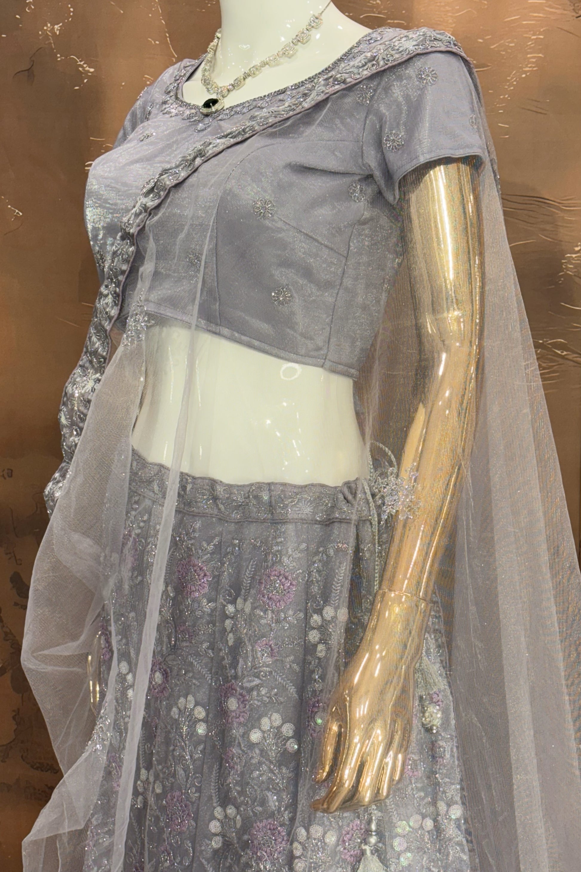 Sophisticated grey lehenga with intricate floral embroidery and shimmering sequin detailing. Ideal for engagements, receptions, and grand celebrations, available exclusively at FZO, Hyderabad.